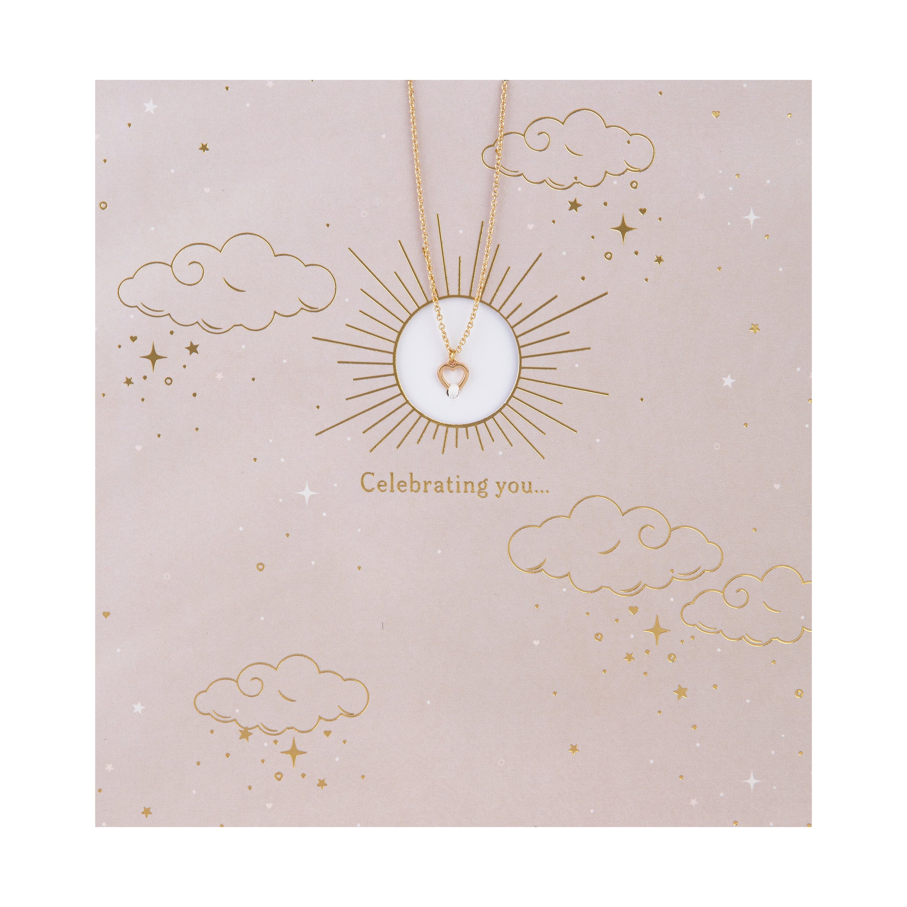Printed on high-quality board, this card features a dusky pink with gold clouds and stars design, metallic gold foil details, die-cut details, a keepsake gold coloured bracelet with heart charm, and the message 'Celebrating you…' on the front. This card comes complete with a Hallmark branded, brown Kraft envelope.