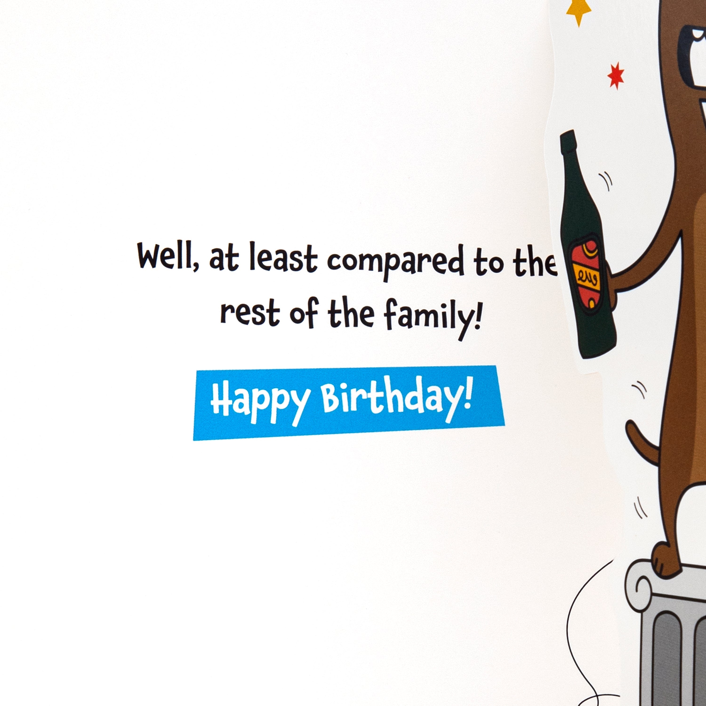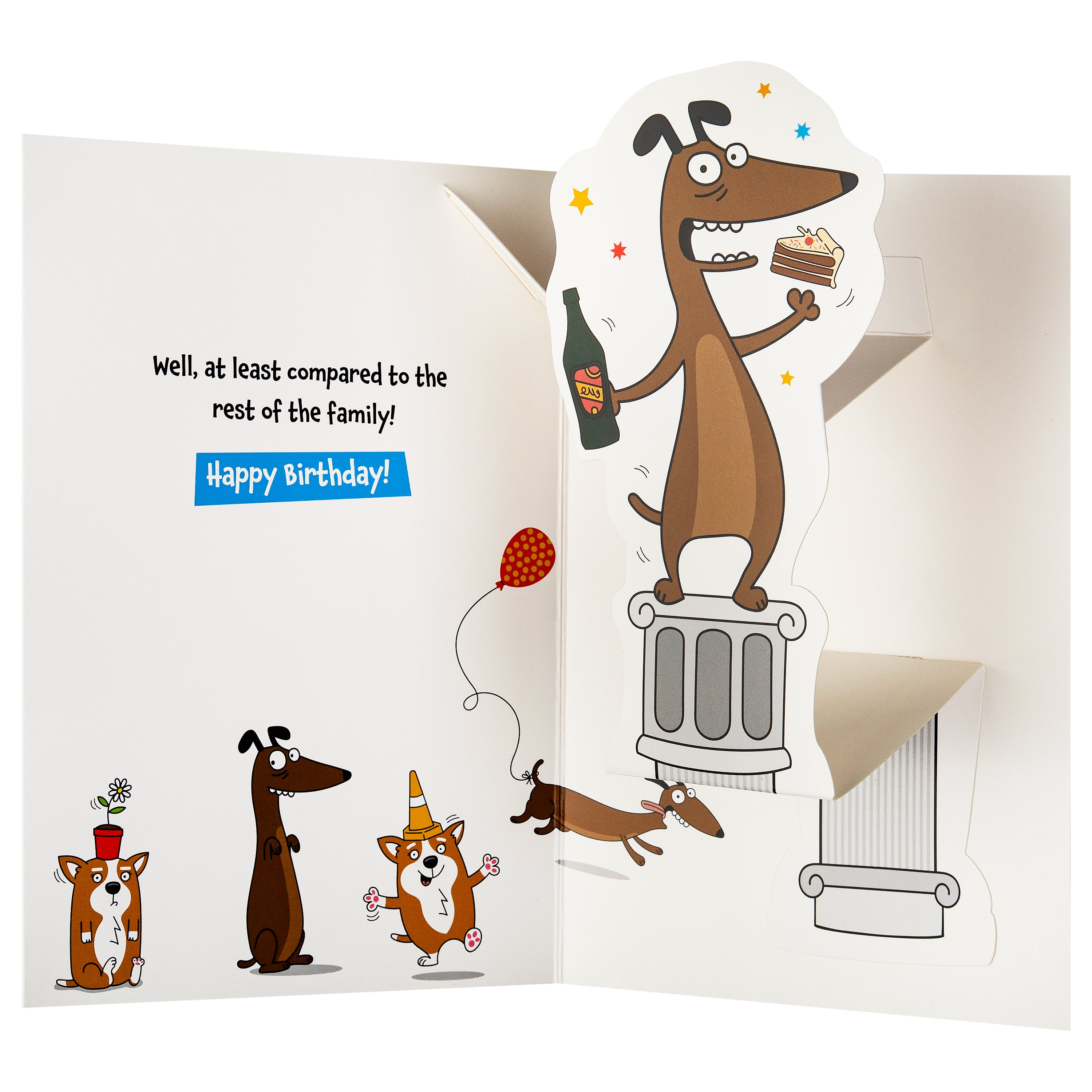 Printed on high-quality board, this card features funny illustration of a sausage dog, die-cut details and when the card is opened a pop-up element of the sausage dog on a pedestal. This card comes complete with a Hallmark branded, bright blue envelope.
