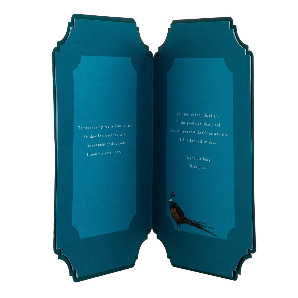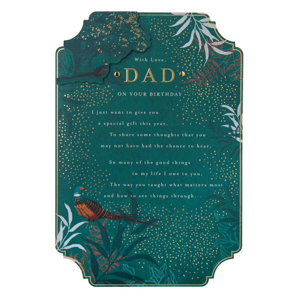 Printed on high-quality textured board, this card has a wonderful Green with traditional floral design with a sentimental quote and features die-cut corners, a paper insert, embossed elements, metallic gold foil details 3D circle paper charm attachments, a die-cut 3D attachment, and the message 'With Love, Dad, on your birthday. I just want to give you a special gift this year, to share some thoughts that you may not have had the chance to hear. So many of the good things in my life I owe to you, the way you taught what matters most and how to see things through...' on the front. This card comes complete with a Hallmark branded, cream envelope.