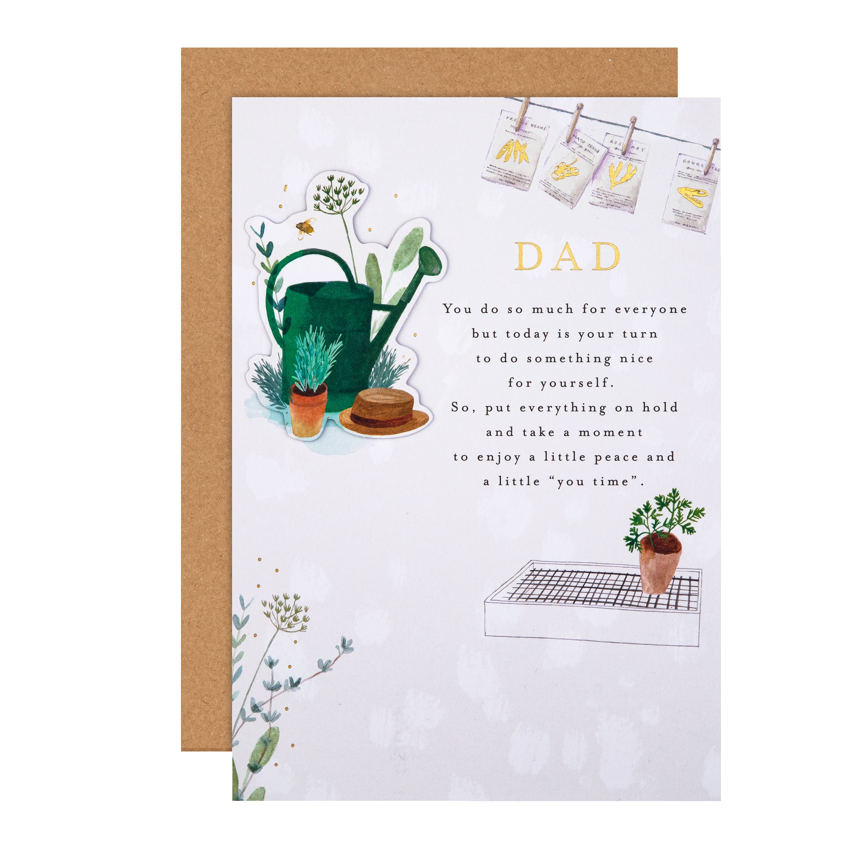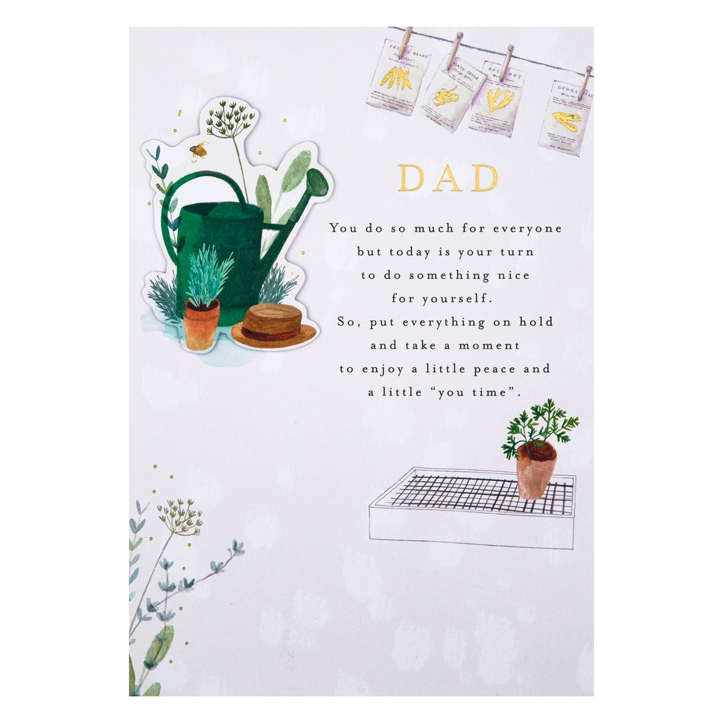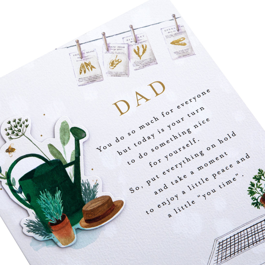 metallic gold foil details, a die-cut 3D attachment, a paper insert, and the message 'Dad, You do so much for everyone but today is your turn to do something nice for yourself. So, put everything on hold and take a moment to enjoy a little peace and a little "you time".' on the front. This card comes complete with a co-ordinating Hallmark branded, brown Kraft envelope.