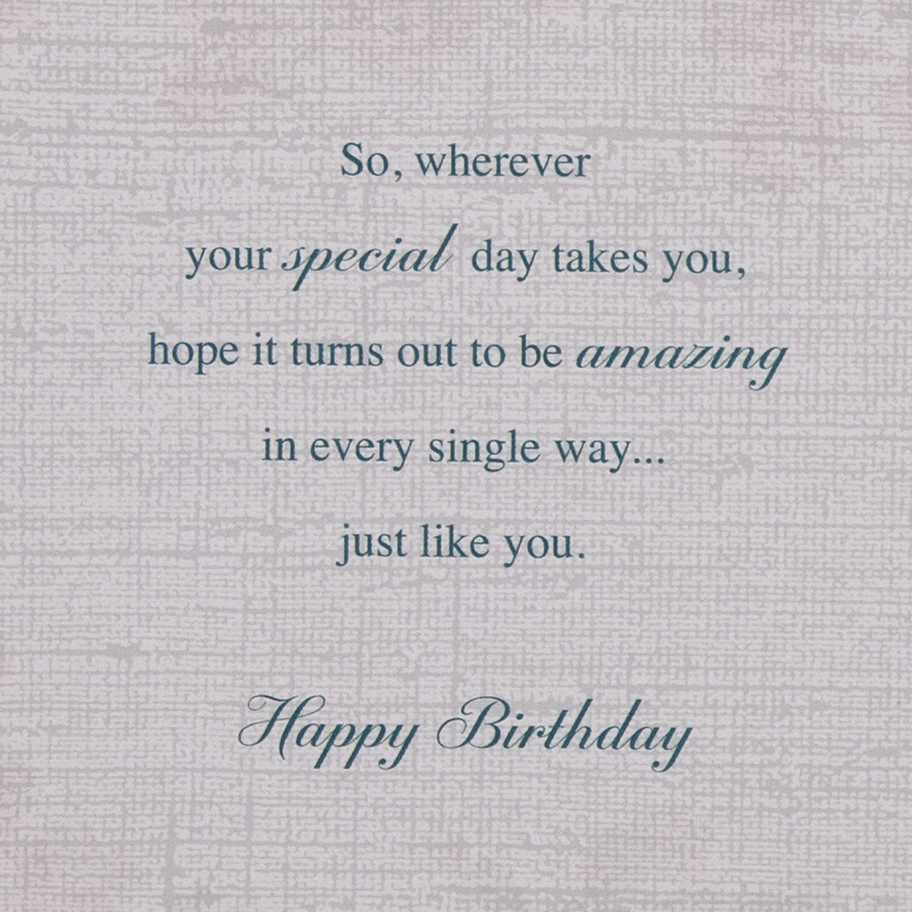 Message Inside Reads: The days seem to fly by but with every year you mean more than you could ever begin to imagine… So, wherever your special day takes you, hope it turns out to be amazing in every single way... just like you. Happy Birthday