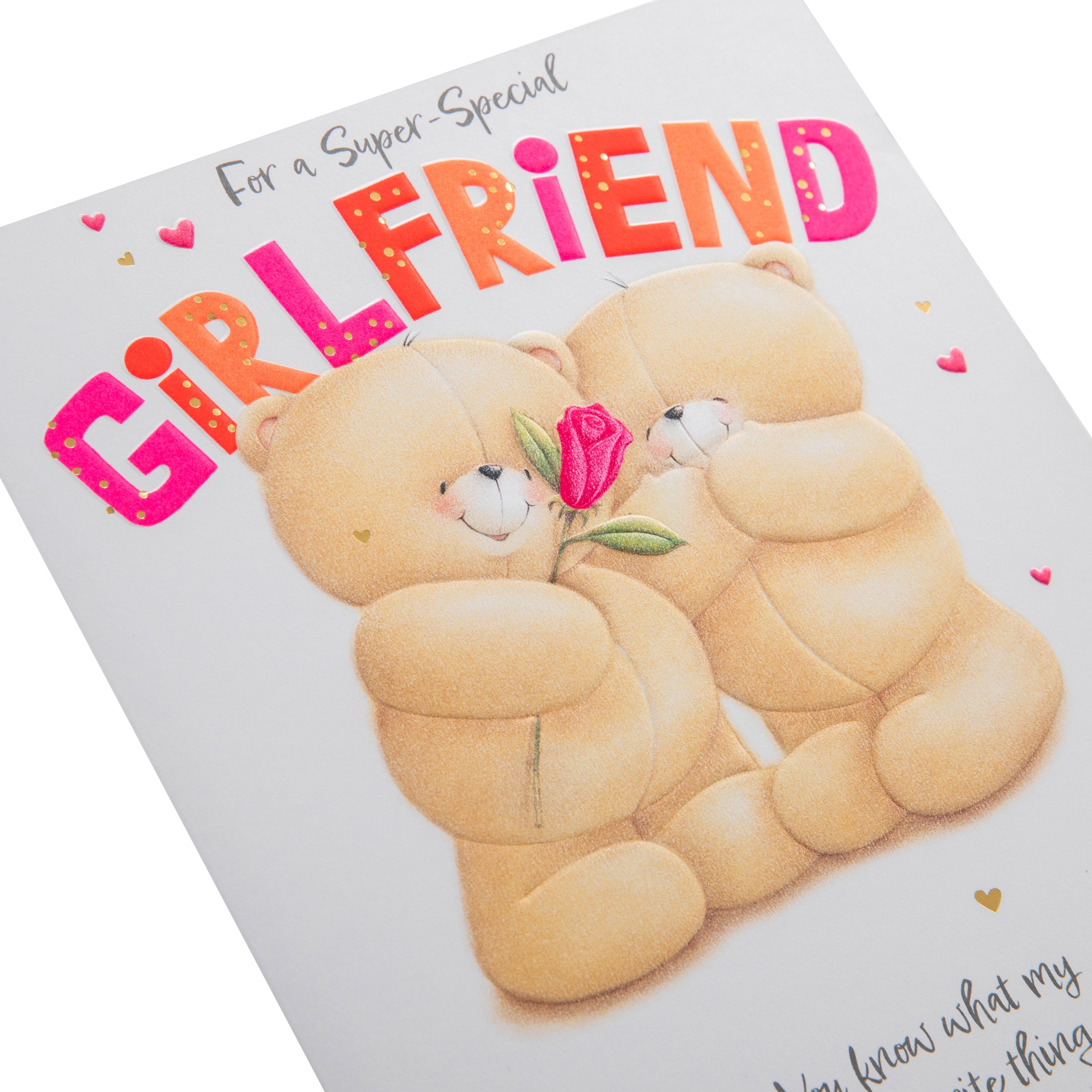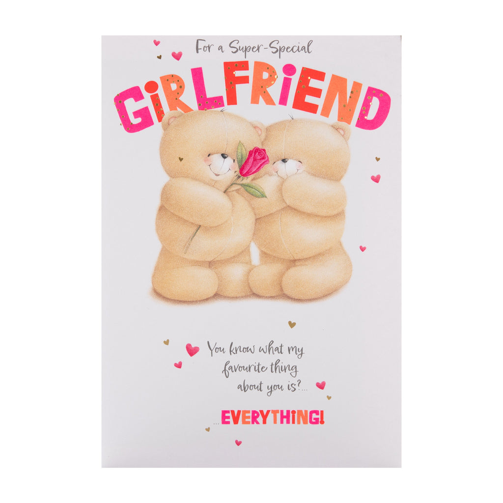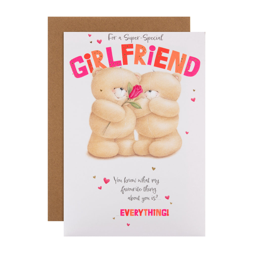 Printed on high-quality board, this card features Hallmark's Forever Friends, embossed elements, metallic gold foil details, neon ink, paper insert, and the message, 'For a super-special girlfriend, you know what my favourite thing about you is?... Everything!' on the front. This card comes complete with a Hallmark branded, brown Kraft envelope.