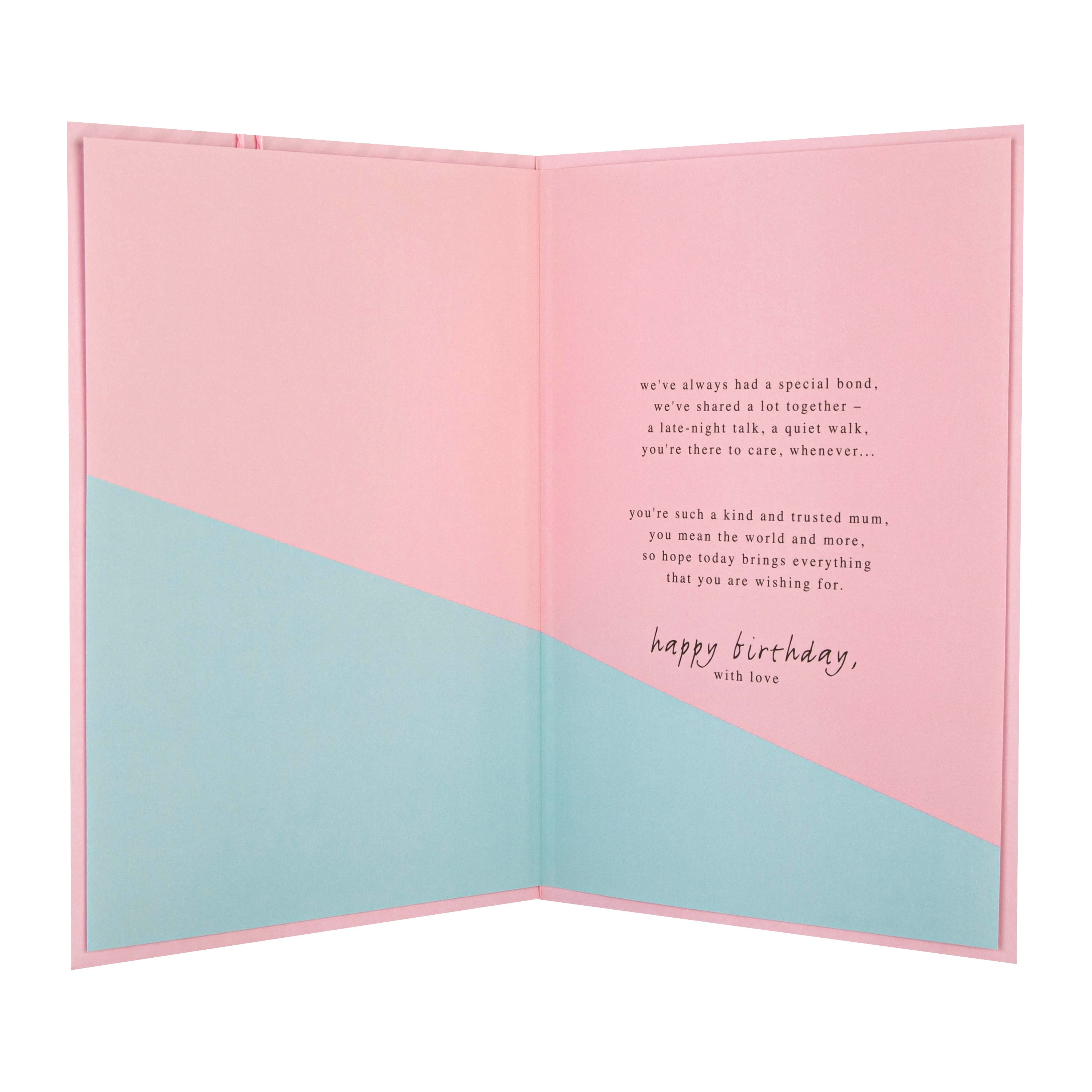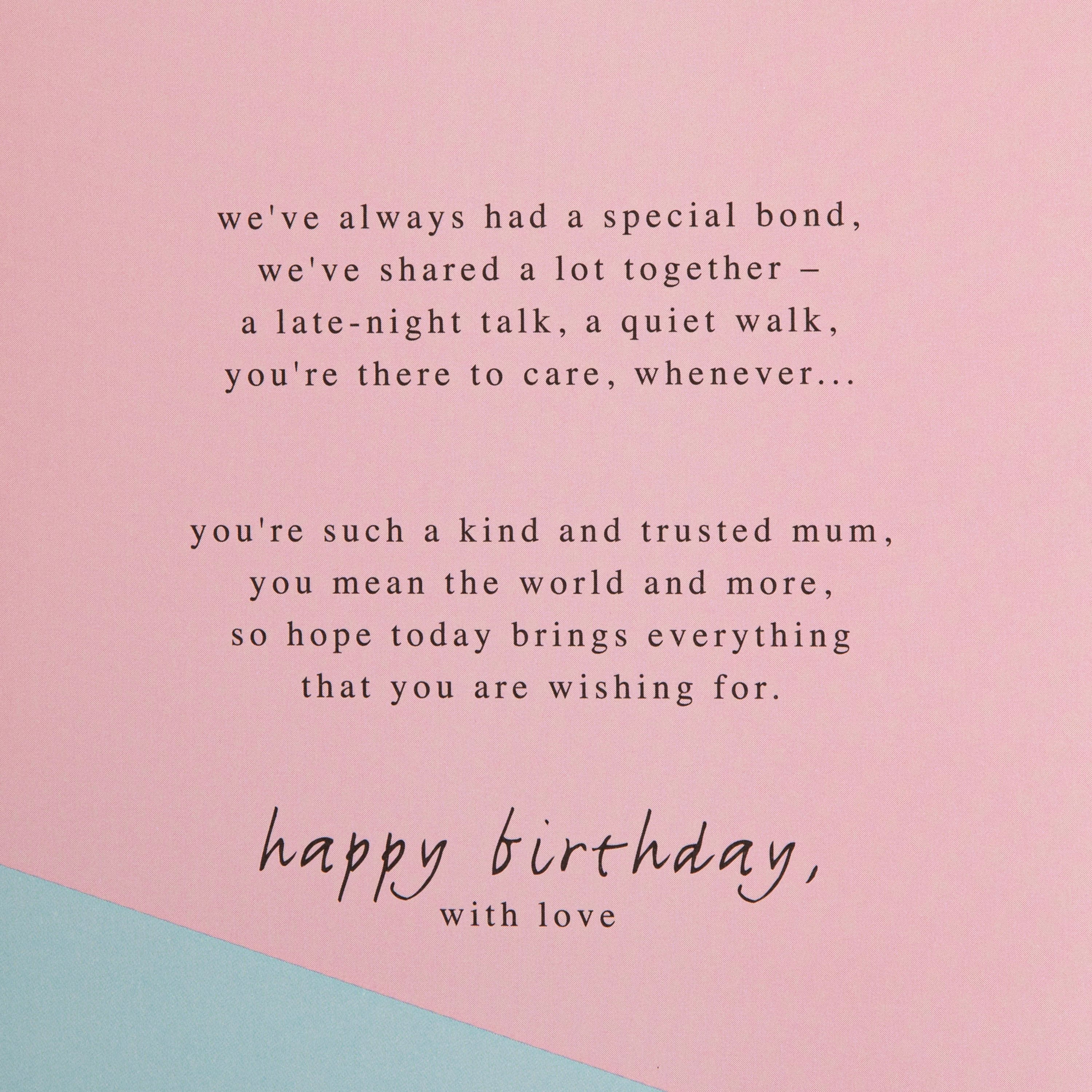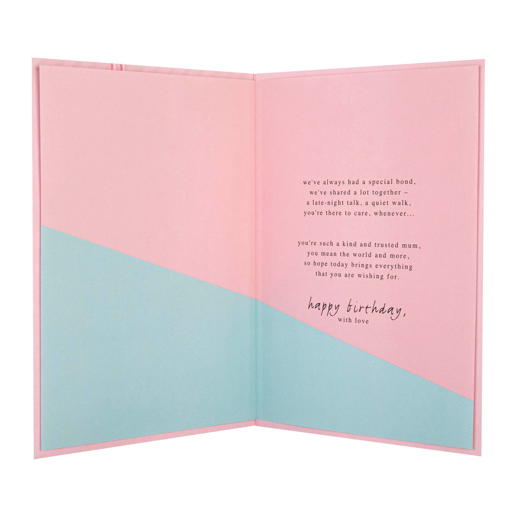 Message inside card reads: we've always had a special bond, we've shared a lot together - a late-night talk, a quiet walk, you're there to care, whenever… you're such a kind and trusted mum, you mean the world and more, so hope today brings everything that you are wishing for. happy birthday, with love