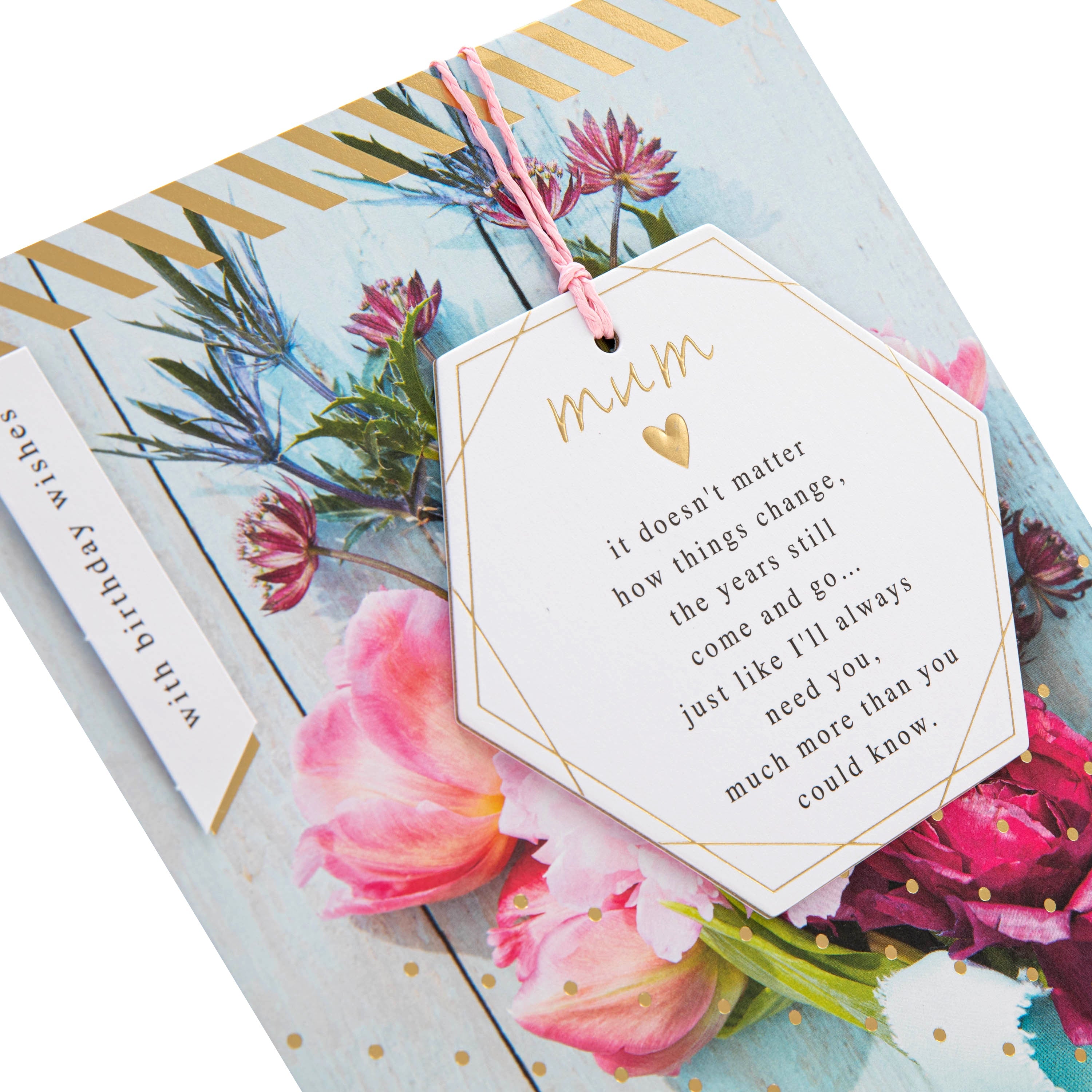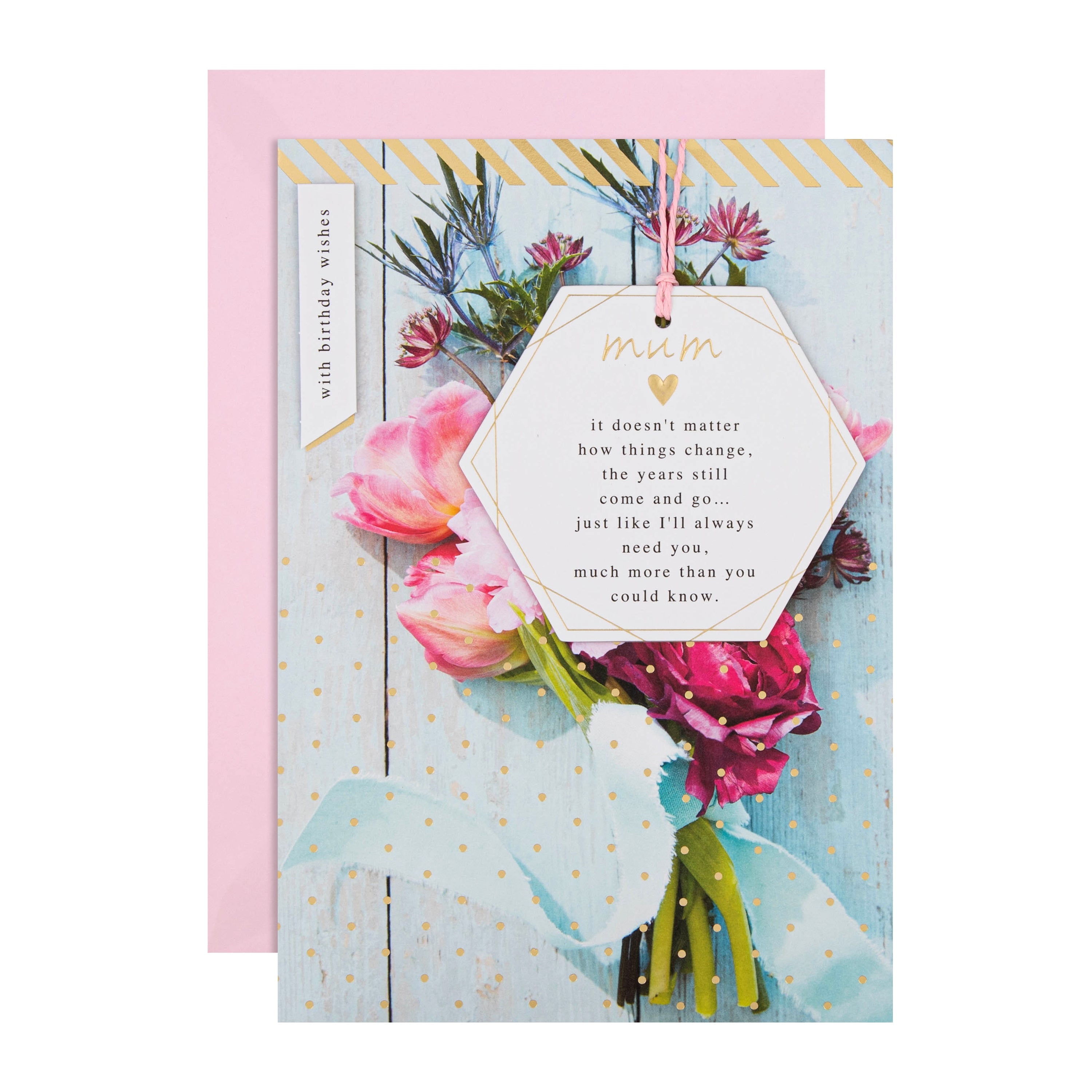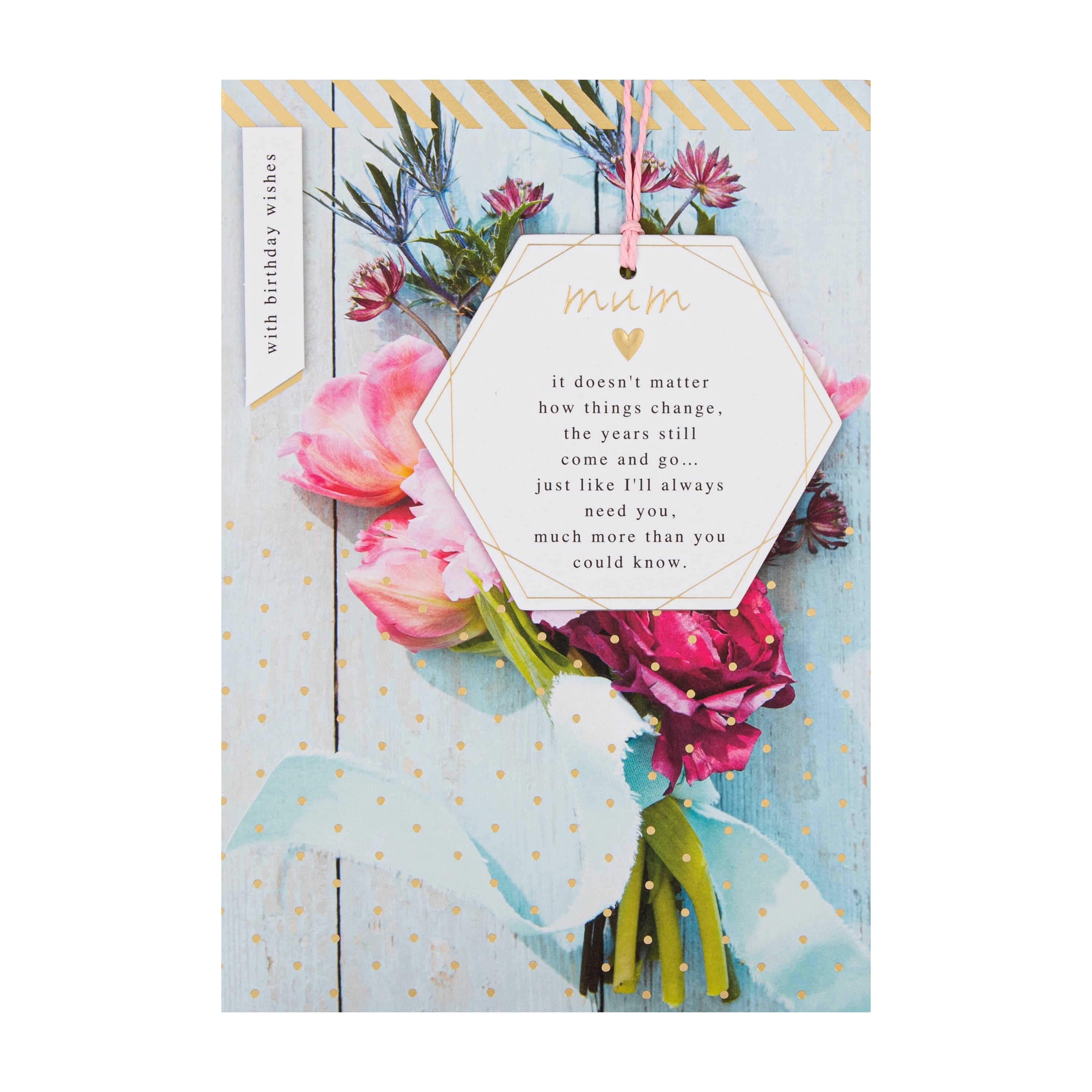 Message on front of card reads: with birthday wishes mum it doesn't matter how things change, the years still come and go… just like I'll always need you, much more than you could know.