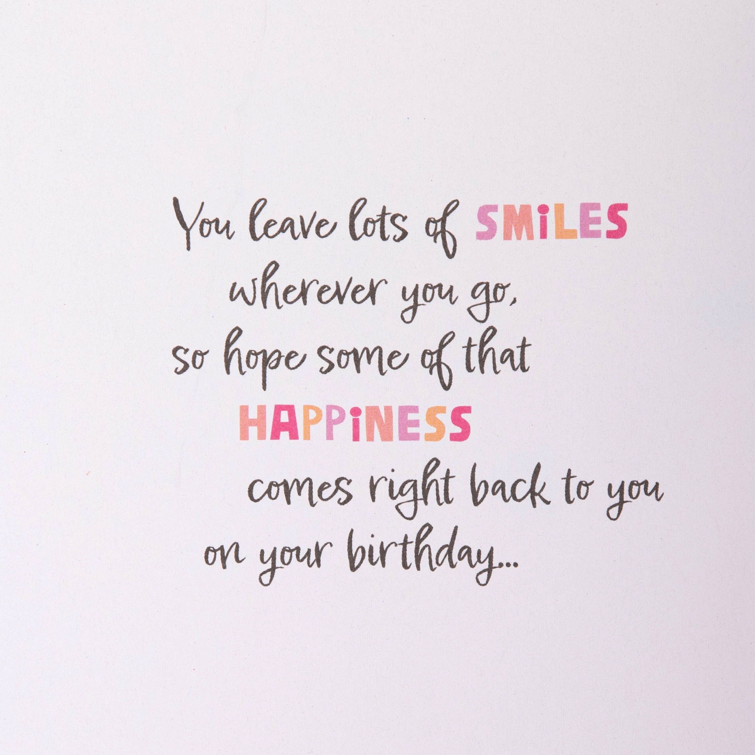 Message Inside Reads: You leave lots of smiles wherever you go, so hope some of that happiness comes right back to you on your birthday… and leaves you feeling very special and very, very loved, because that's just what you are! Happy Birthday, Mum X