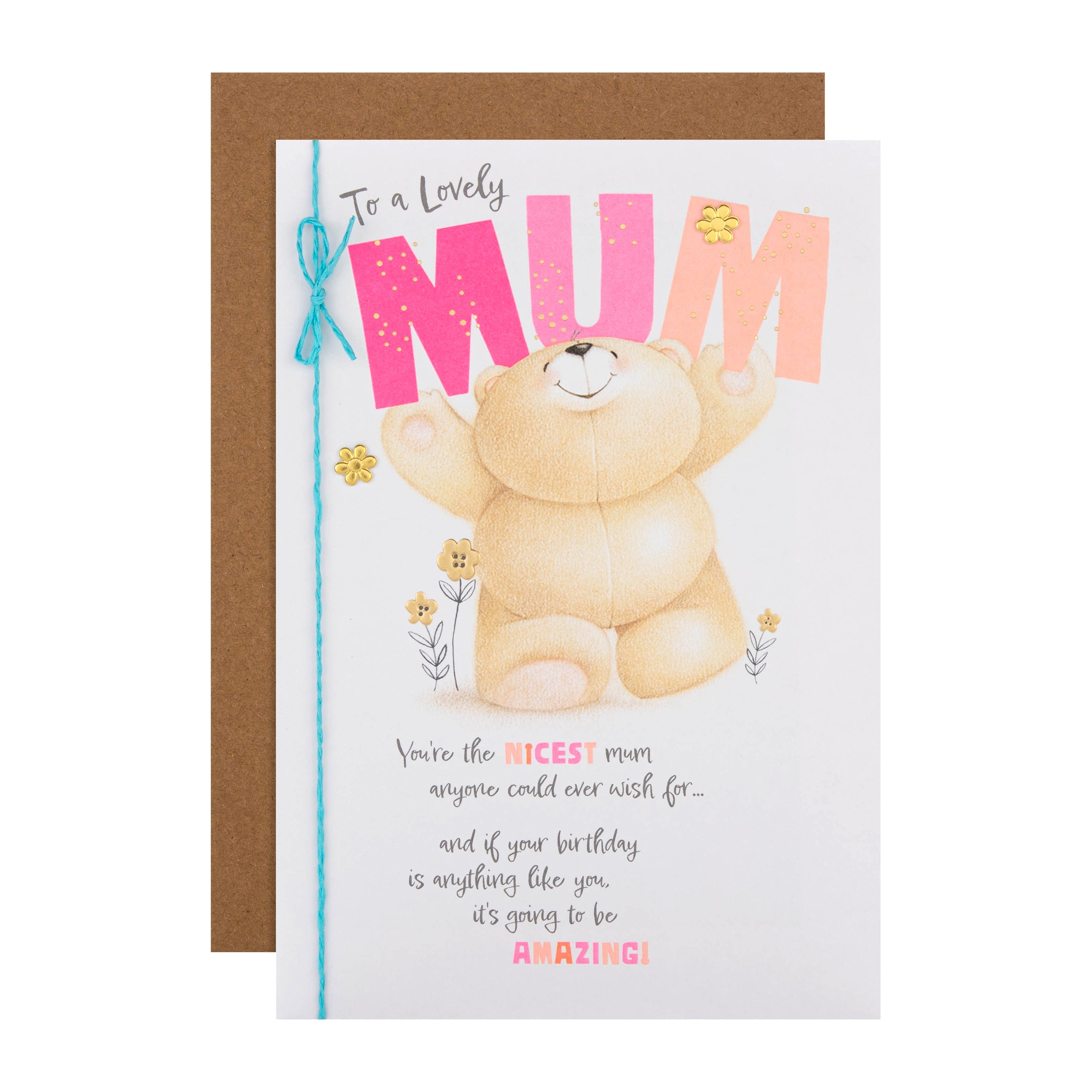 Printed on high-quality board, this card features a Forever Friends illustration, gold foil details, embossed elements, a blue paper twine bow embellishment, a gold flower charm embellishment, a paper insert, text on front 'To a Lovely Mum You're the nicest mum anyone could ever wish for… and if your birthday is anything like you, it's going to be amazing!', and comes complete with a co-ordinating Hallmark branded, brown Kraft envelope.