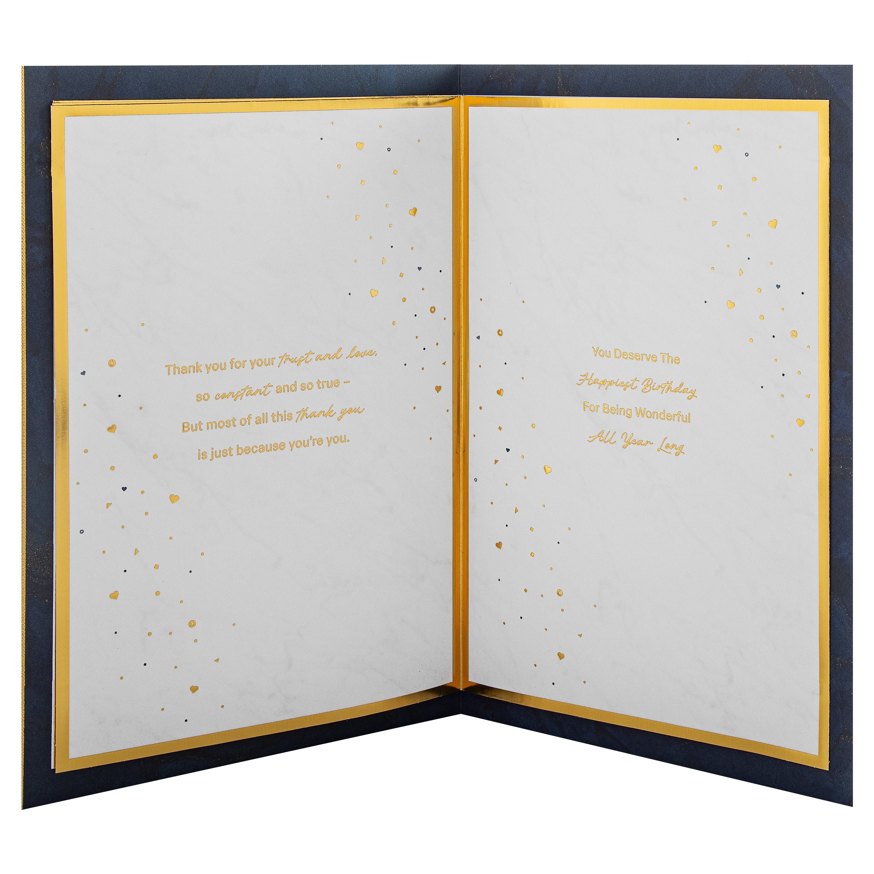 Printed on high-quality board, this card features laser cut details, metallic silver foil details, metallic gold foil details, in flat, fluted and textured designs, and a foiled book insert. This card comes complete with a co-ordinating Hallmark branded, ivory envelope.