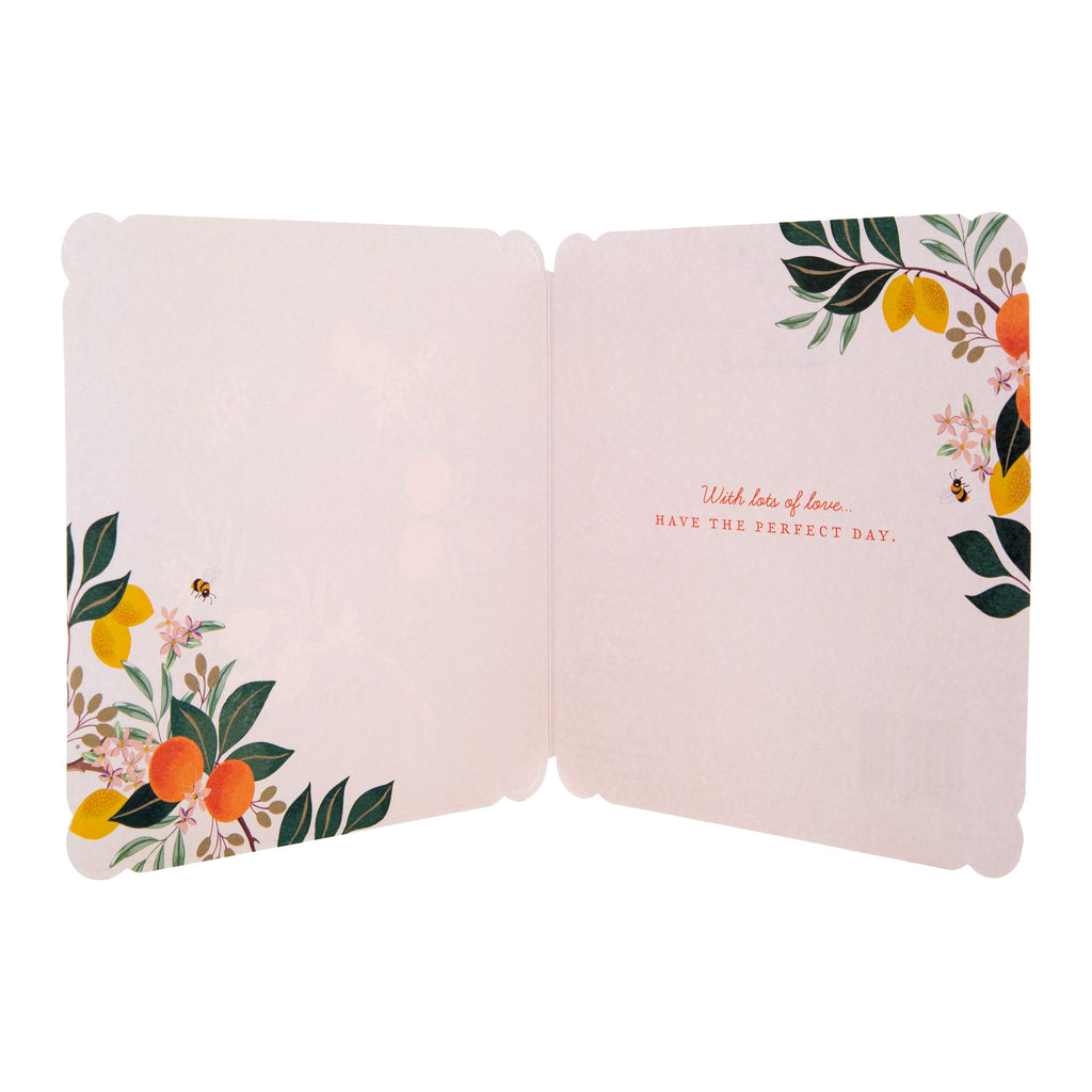 Printed on high-quality textured board this card features die cut rounded corners, embossed elements, gold foil details, a floral print inside, and comes complete with a co-ordinating Hallmark branded, brown Kraft envelope.