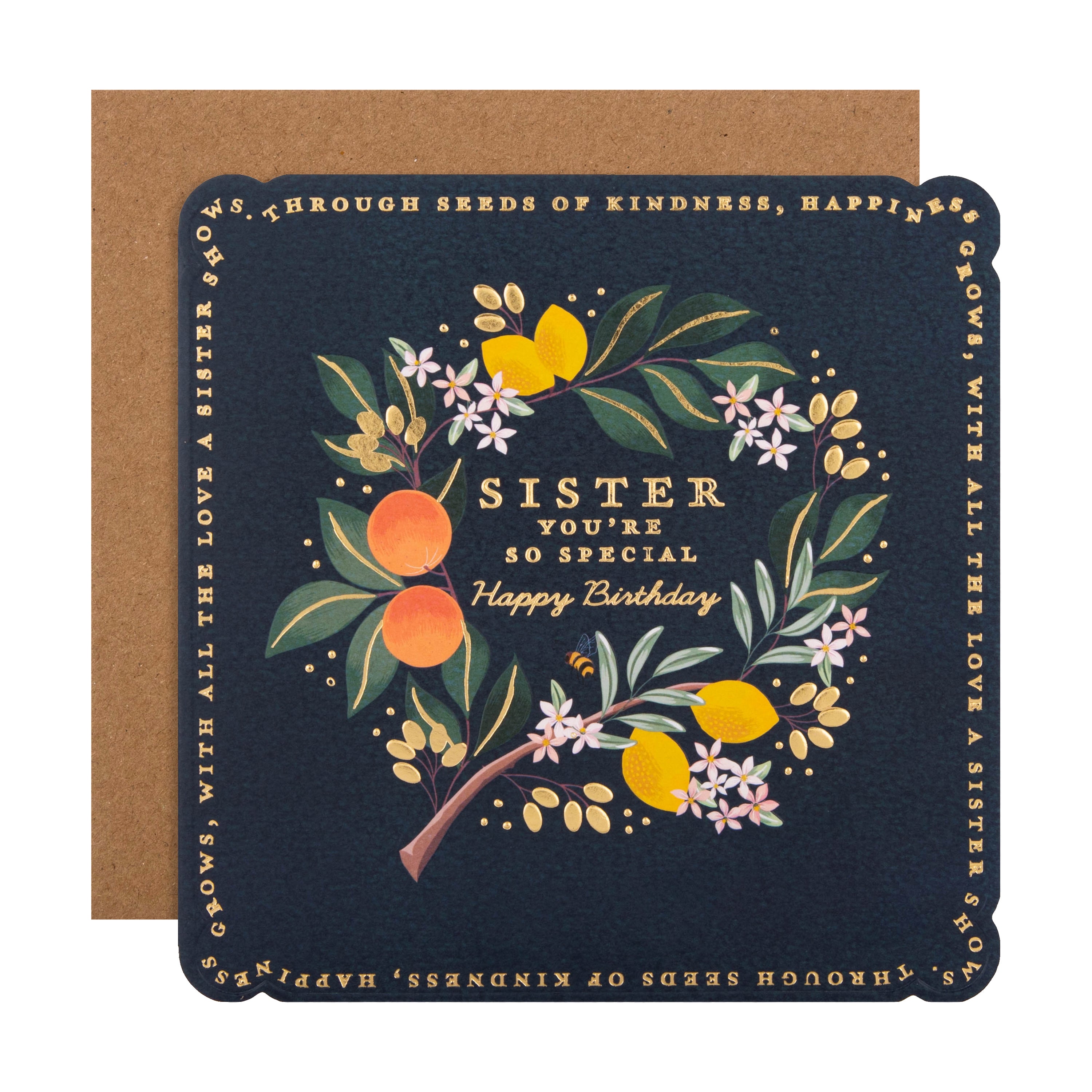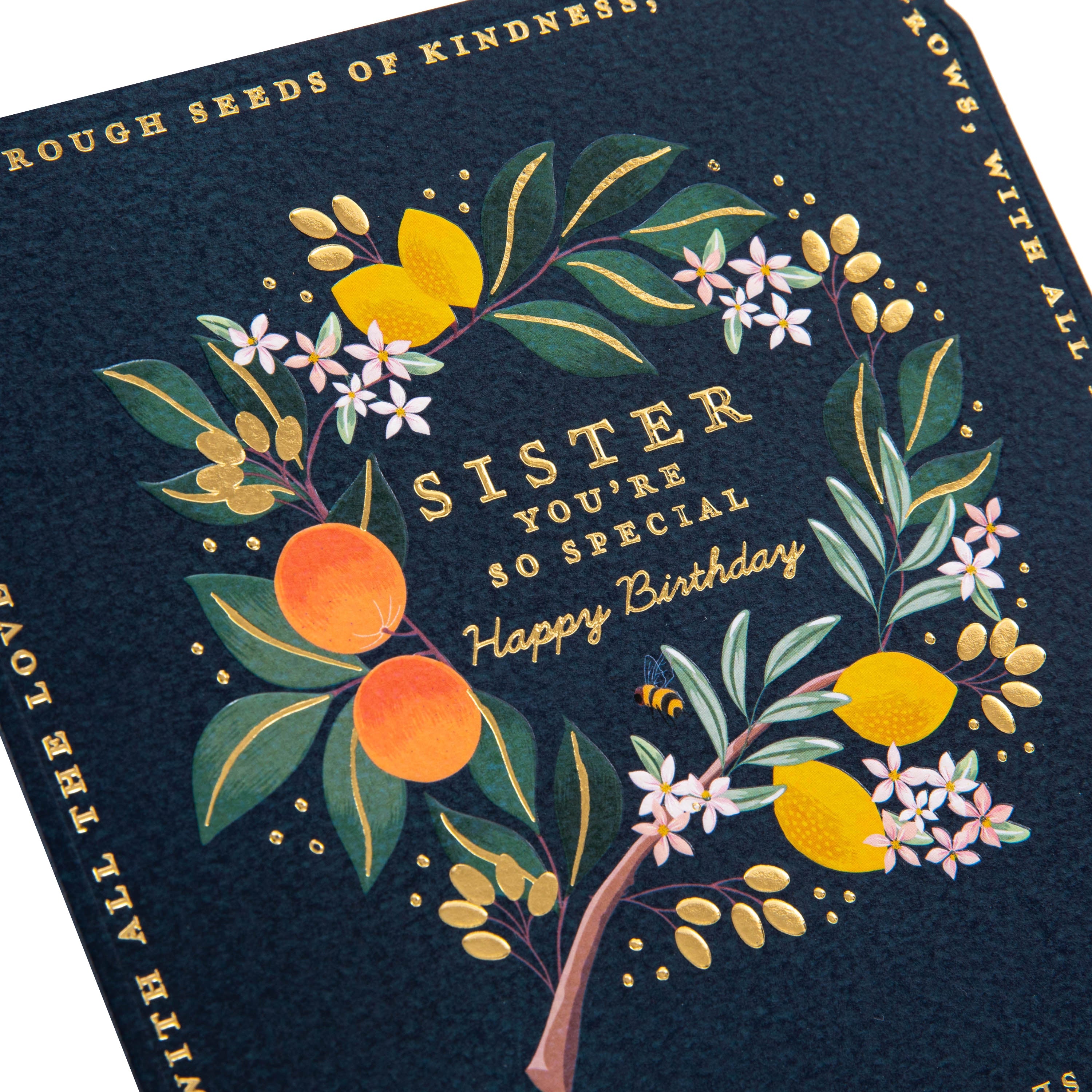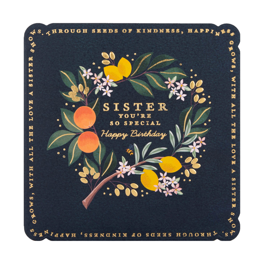 Birthday Card for Sister - Blue Lemon & Oranges Flower Border Design