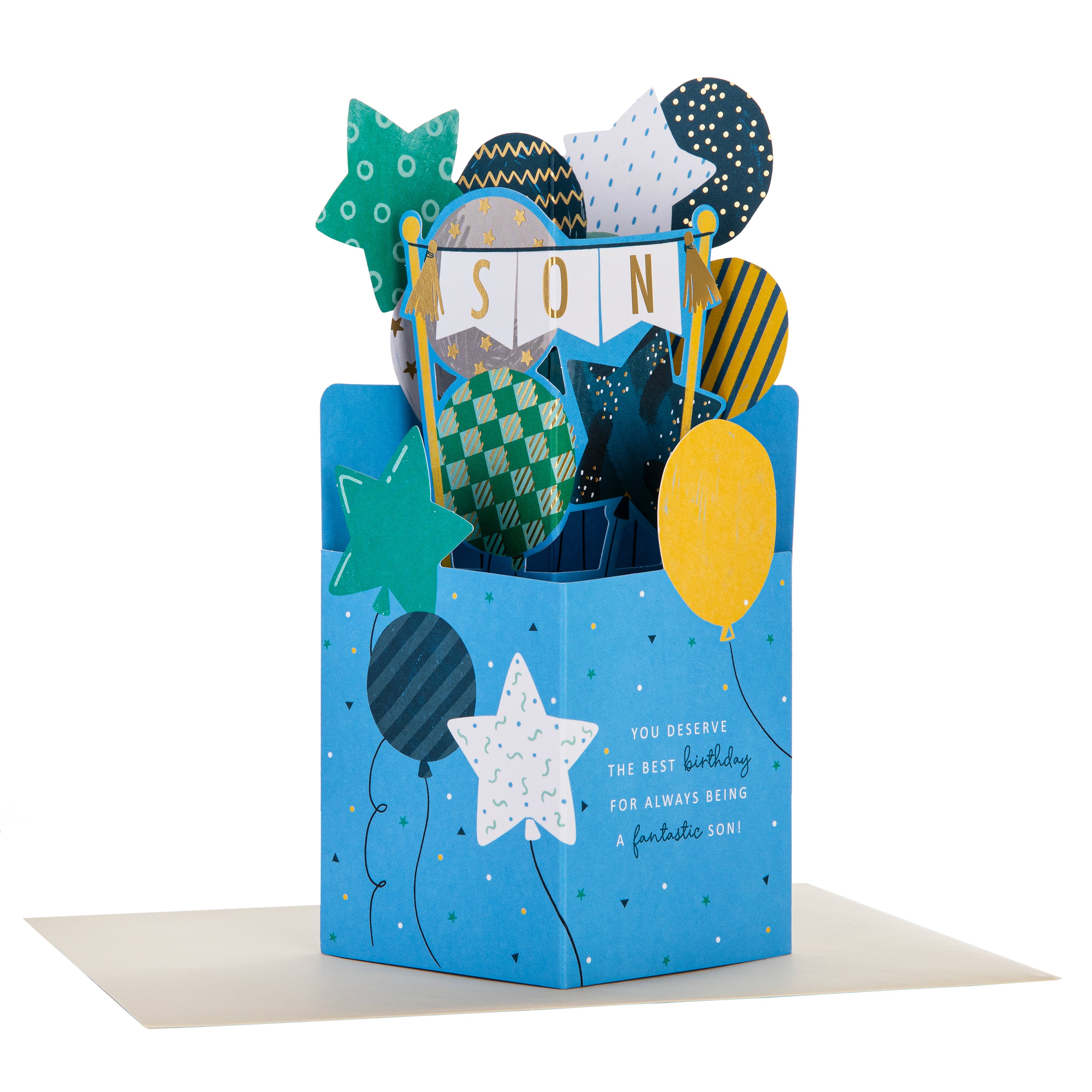 Printed on high-quality board, this card pops-up into a 3D diorama of a bunch of star-shaped balloons design. This card features metallic gold foil details, die-cut details, the message, 'Son, you deserve the best birthday for always being a fantastic son!' on the front and comes complete with a co-ordinating Hallmark branded, pale yellow envelope.