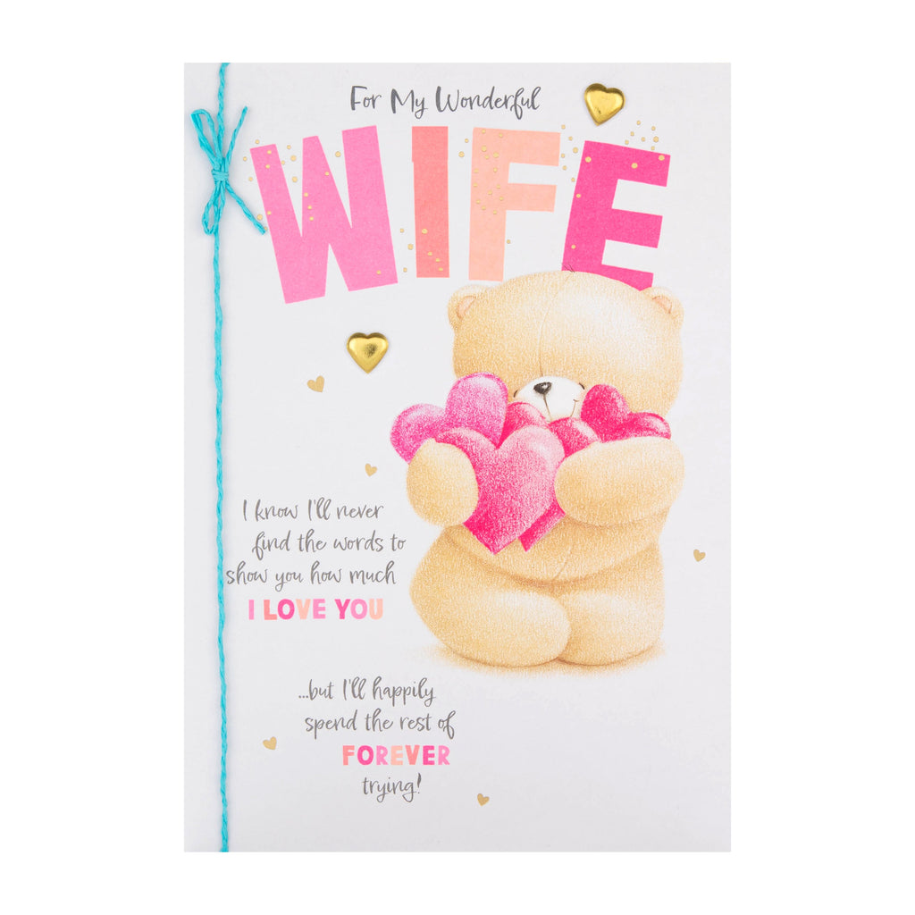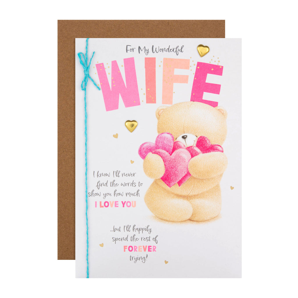 Printed on high-quality board, this card features a Forever Friends illustration, gold foil details, embossed elements, blue paper twine bow embellishment, a gold heart charm embellishment, a paper insert, text on front 'For My Wonderful Wife I know I'll never find the words to show you how much I love you … but I'll happily spend the rest of forever trying!', and comes complete with a co-ordinating Hallmark branded, brown Kraft envelope.