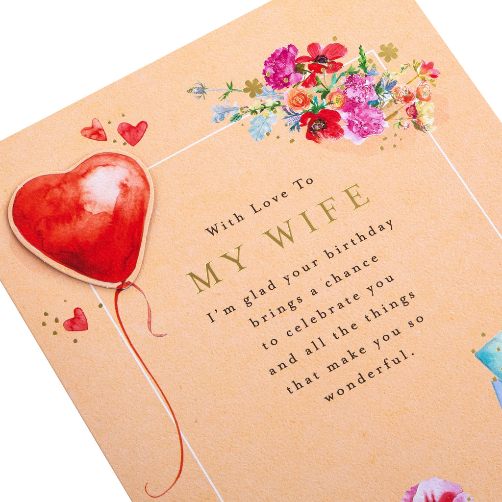 Printed on high-quality board, this textured card features a Lucy Cromwell flowers, presents and a heart shaped balloon design. This card features metallic gold foil details, a die-cut 3D attachment, a paper insert, and the message 'With love to my wife. I'm glad your birthday brings a chance to celebrate you and all the things that make you so wonderful.' on the front. This card comes complete with a co-ordinating Hallmark branded, brown Kraft envelope.