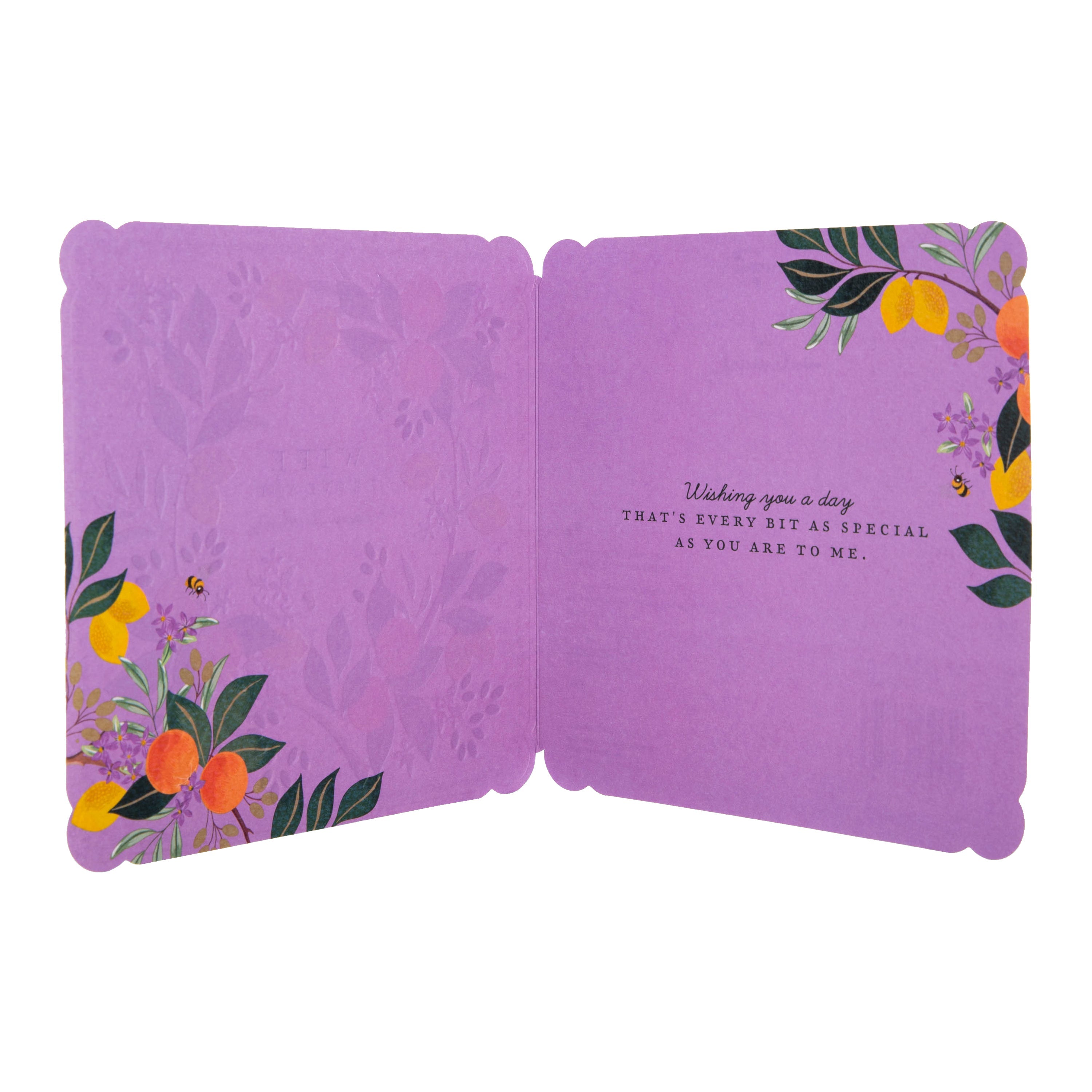 Printed on high-quality textured board this card features die cut rounded corners, embossed elements, gold foil details, a floral print inside, and comes complete with a co-ordinating Hallmark branded, brown Kraft envelope.
