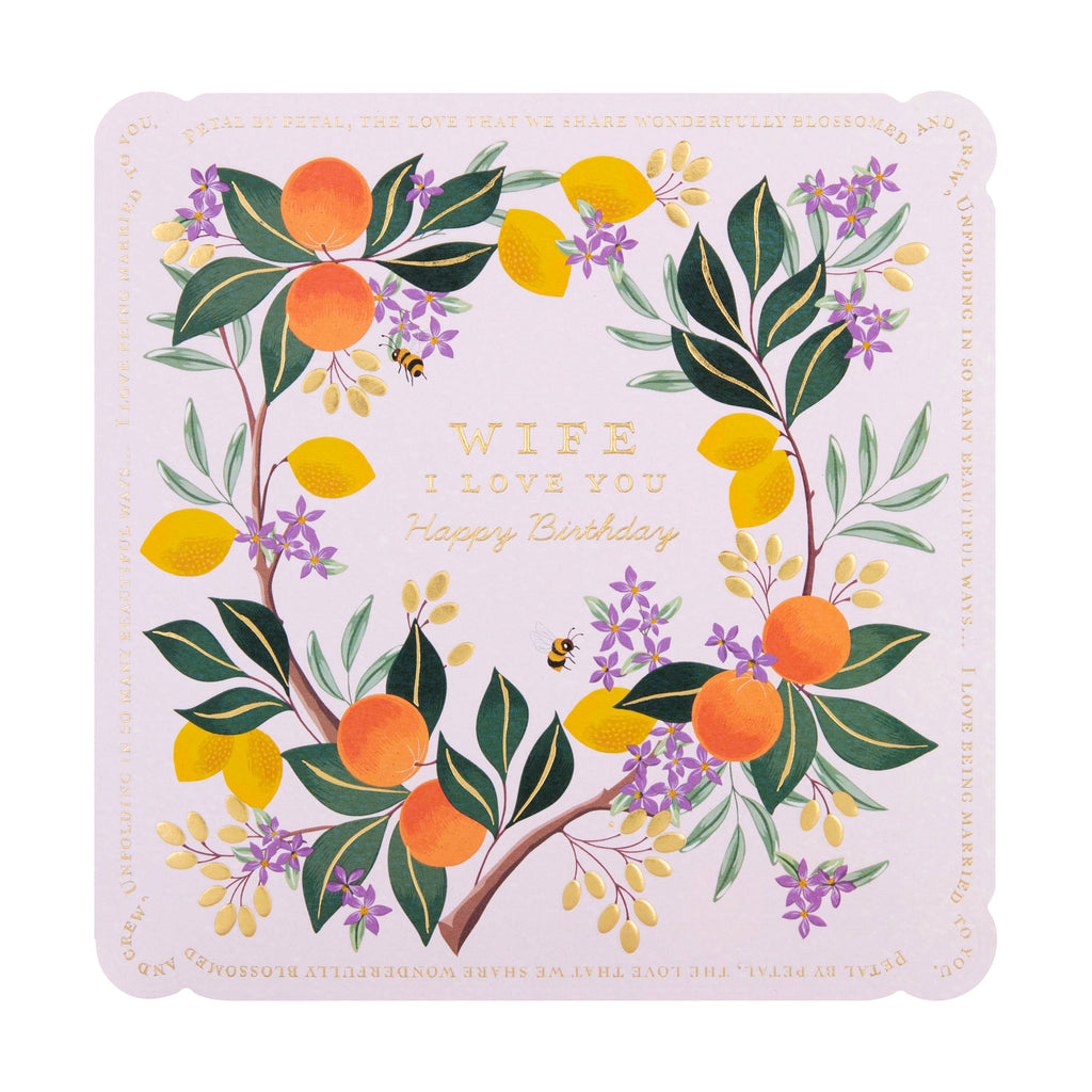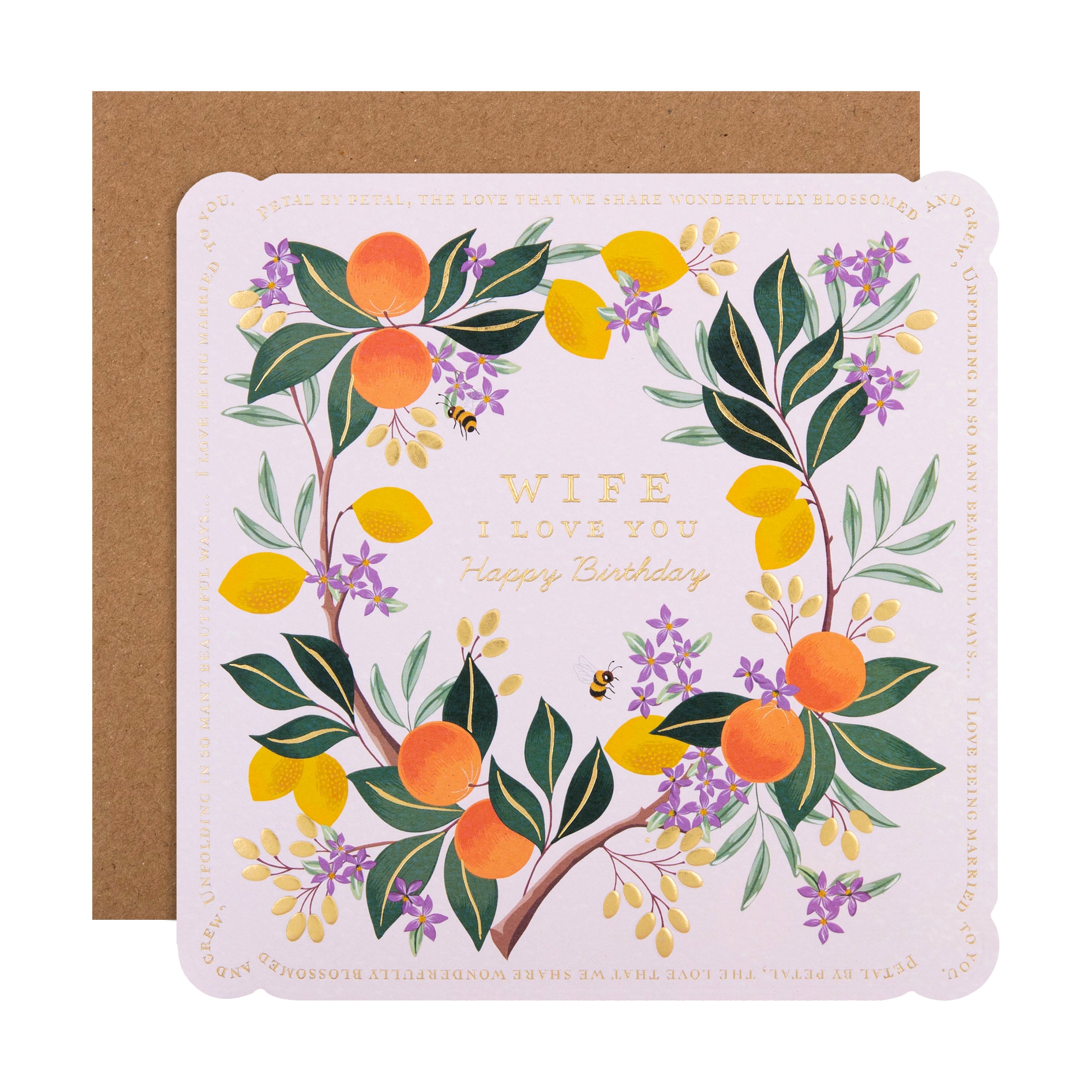 Birthday Card for Wife - White Lemon & Oranges Flower Border Design