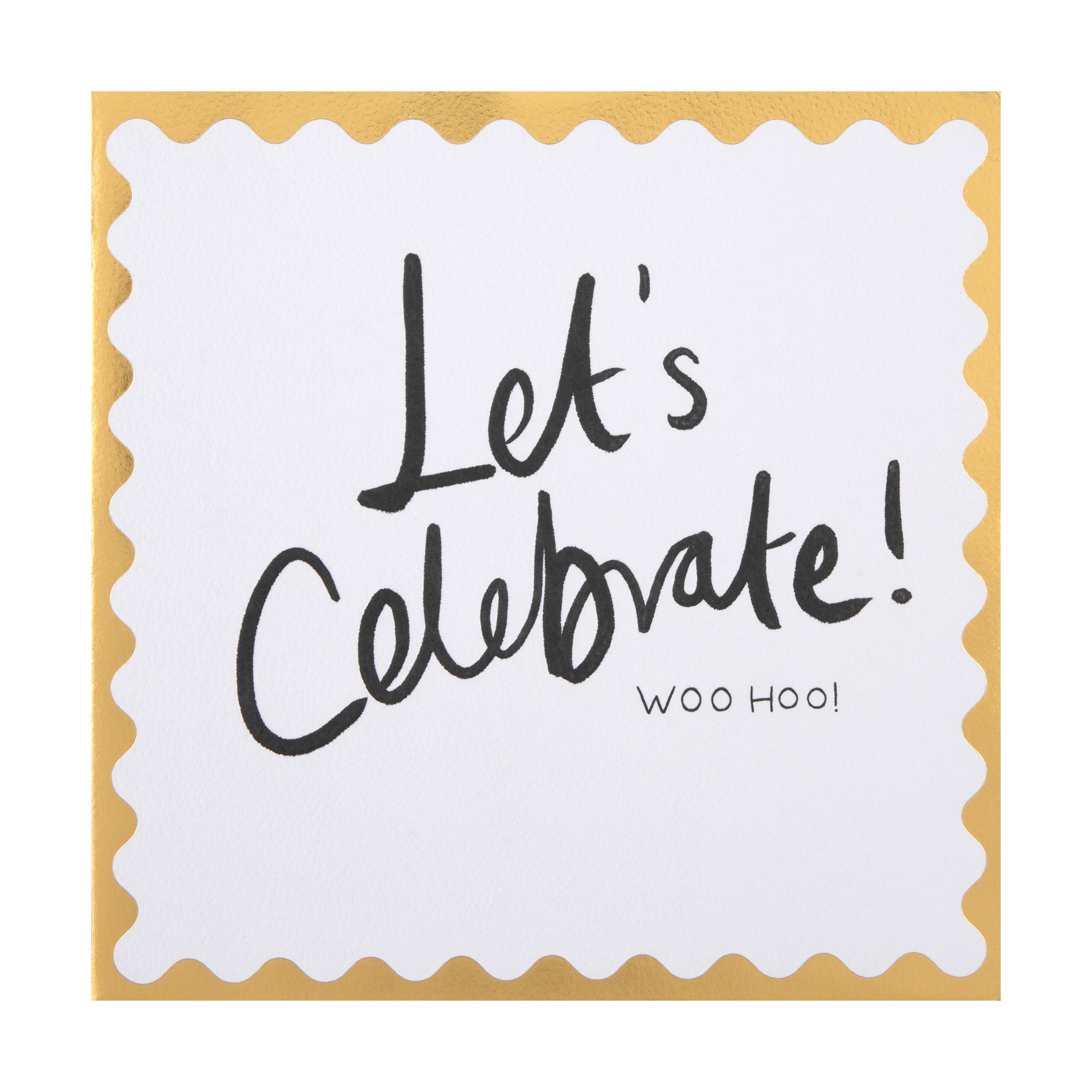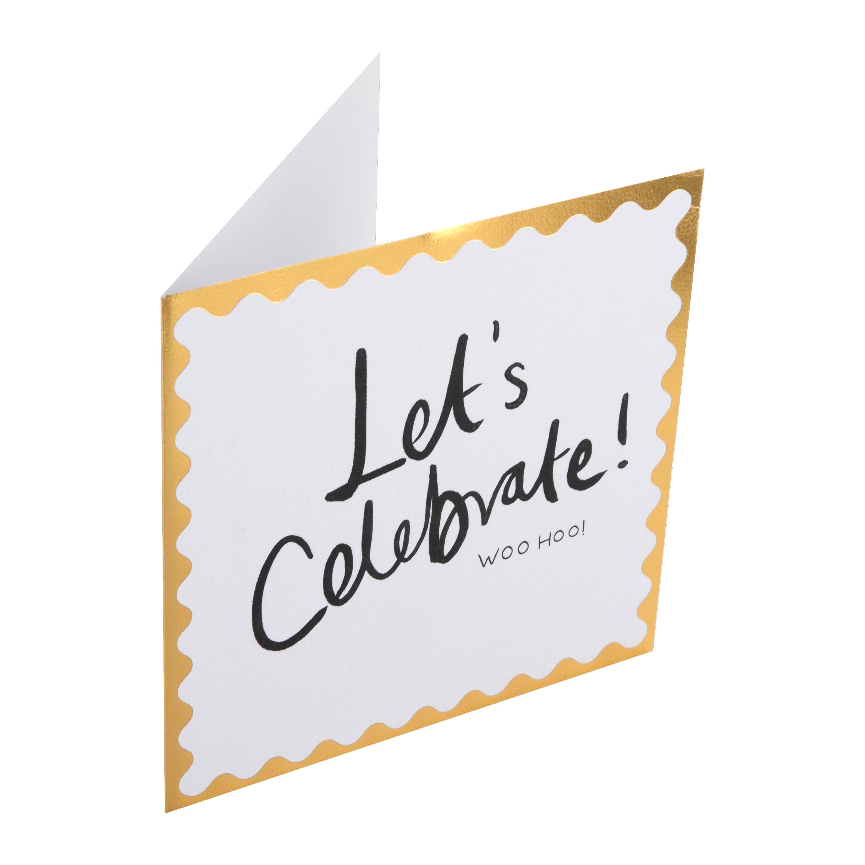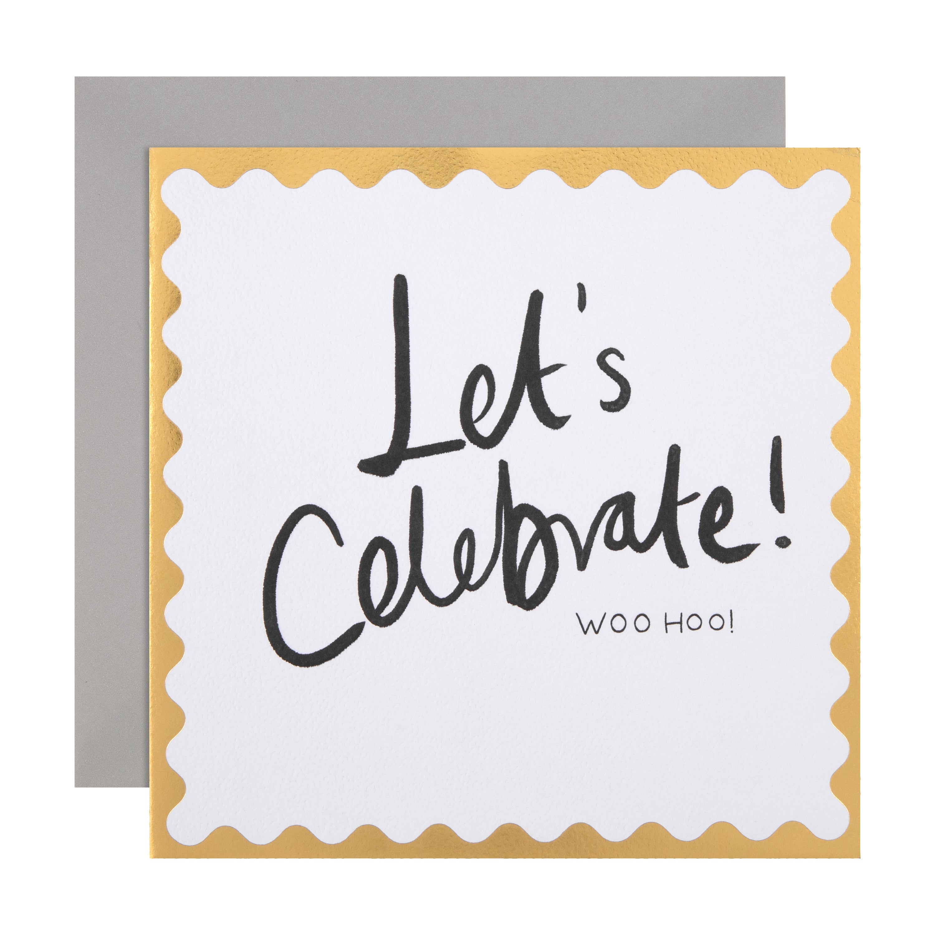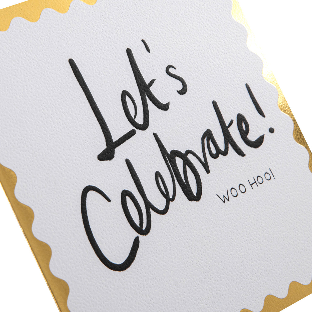 Printed on high-quality board, this textured card features a black and gold calligraphy text design, embossed elements, metallic gold foil details, and the message, 'Let's celebrate! Woo hoo!' on the front. This card comes complete with a Hallmark branded, grey envelope.