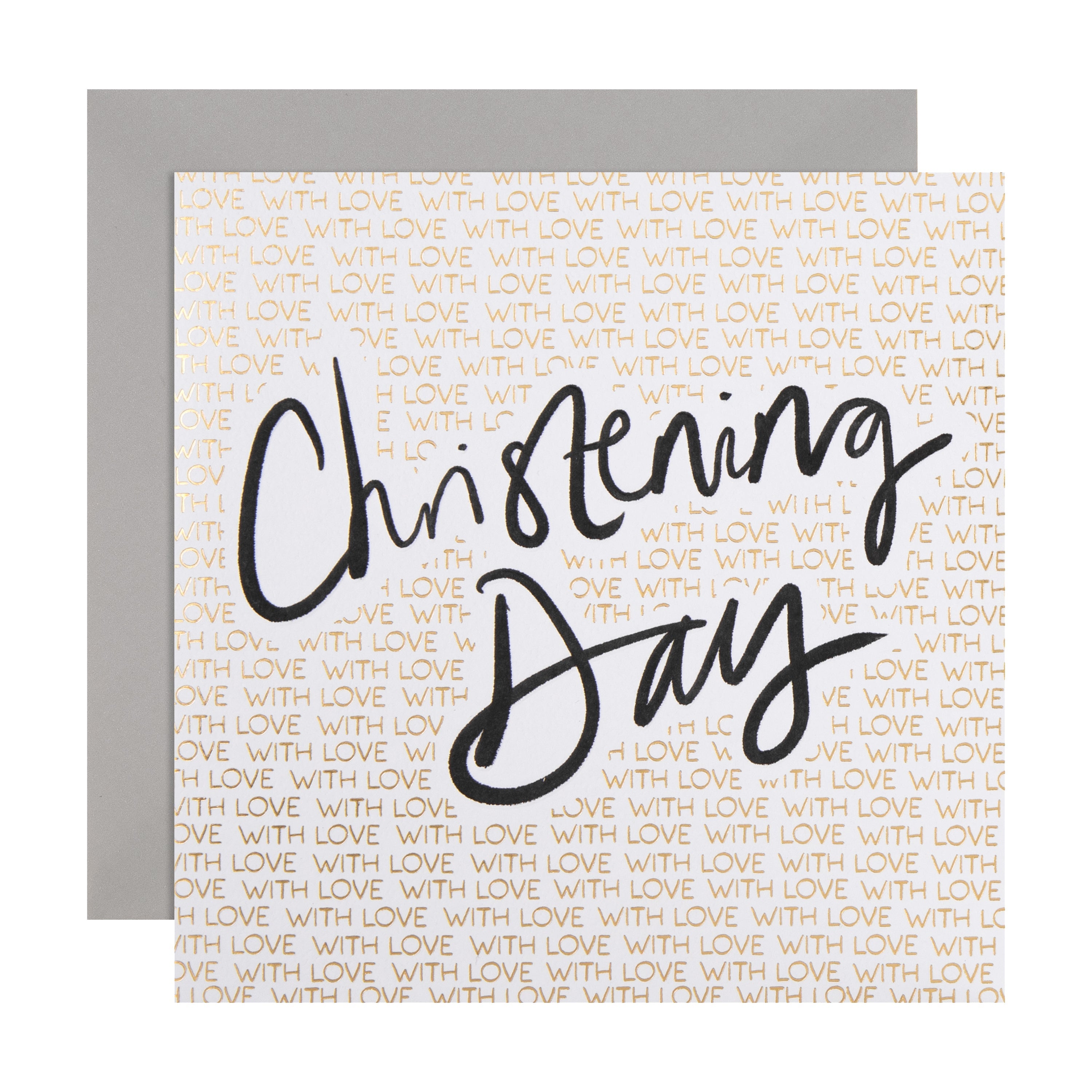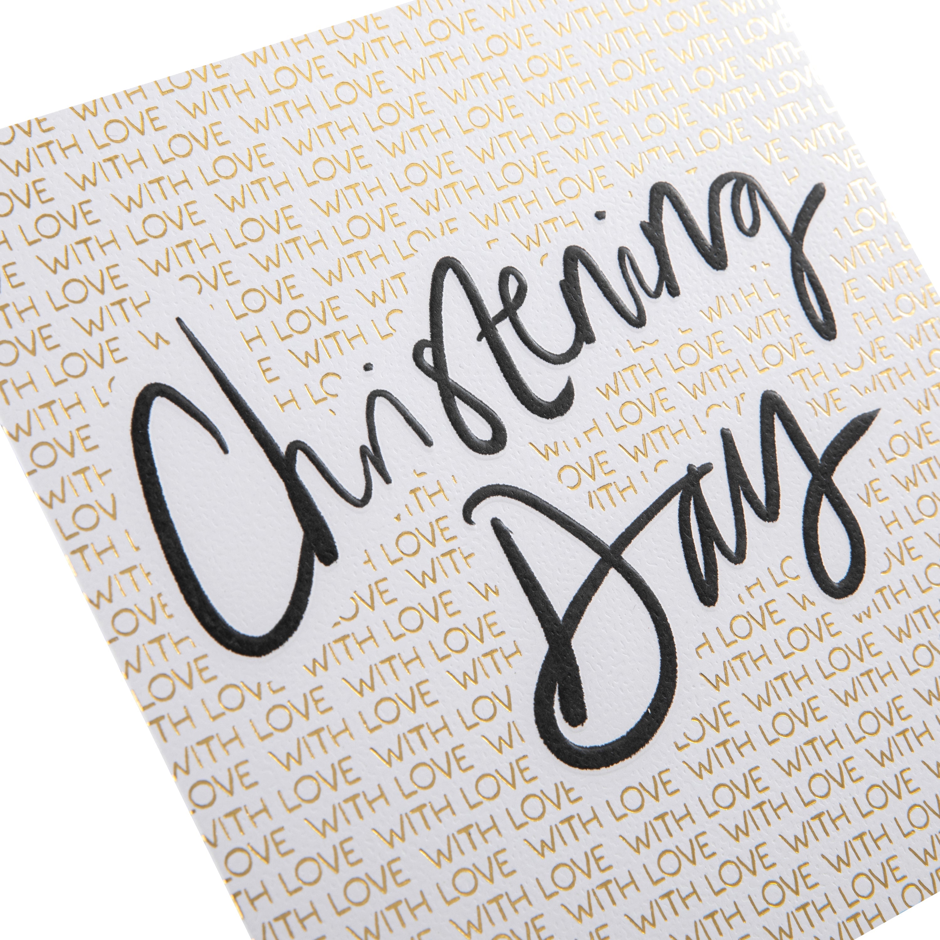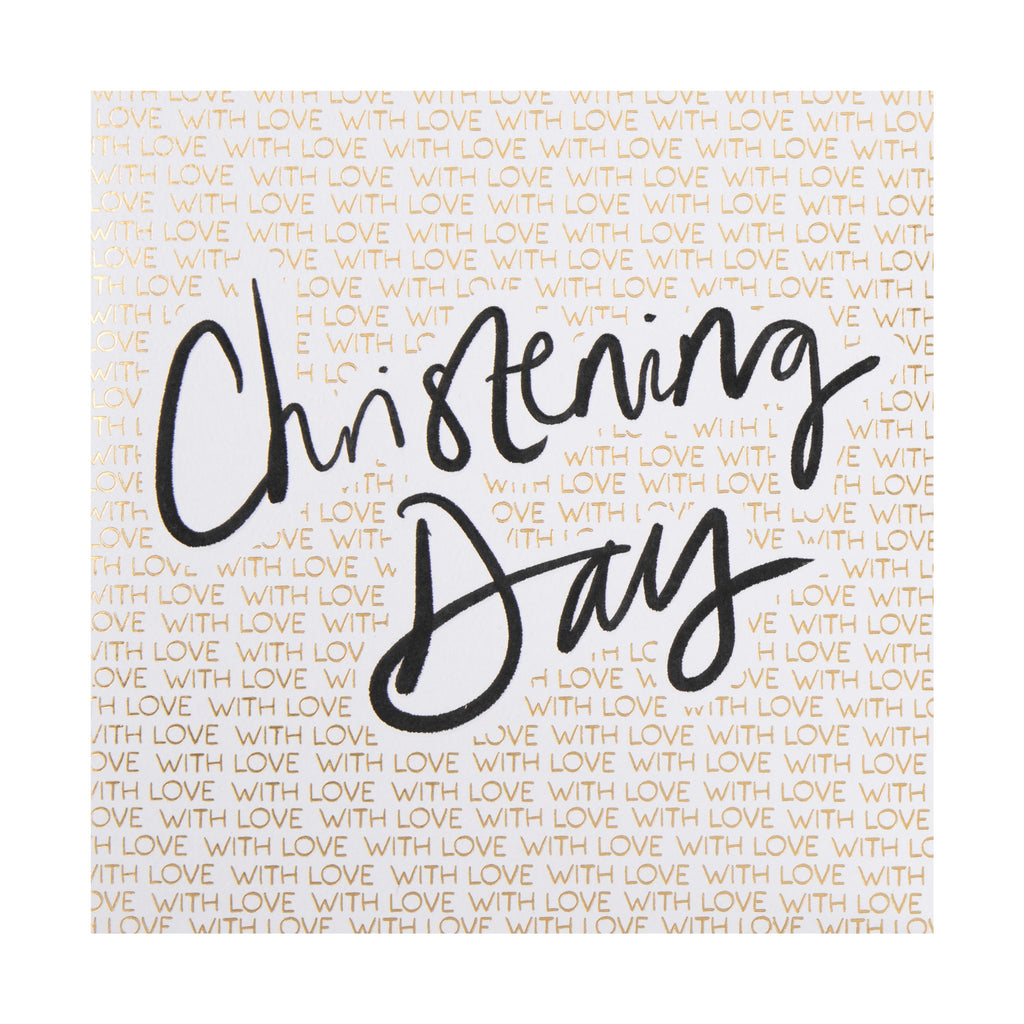 Printed on high-quality board, this textured card features a black and gold calligraphy text design, embossed elements, metallic gold foil details, and the message, 'Christening day, with love' on the front. This card comes complete with a Hallmark branded, grey envelope.
