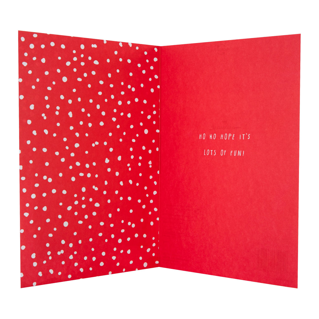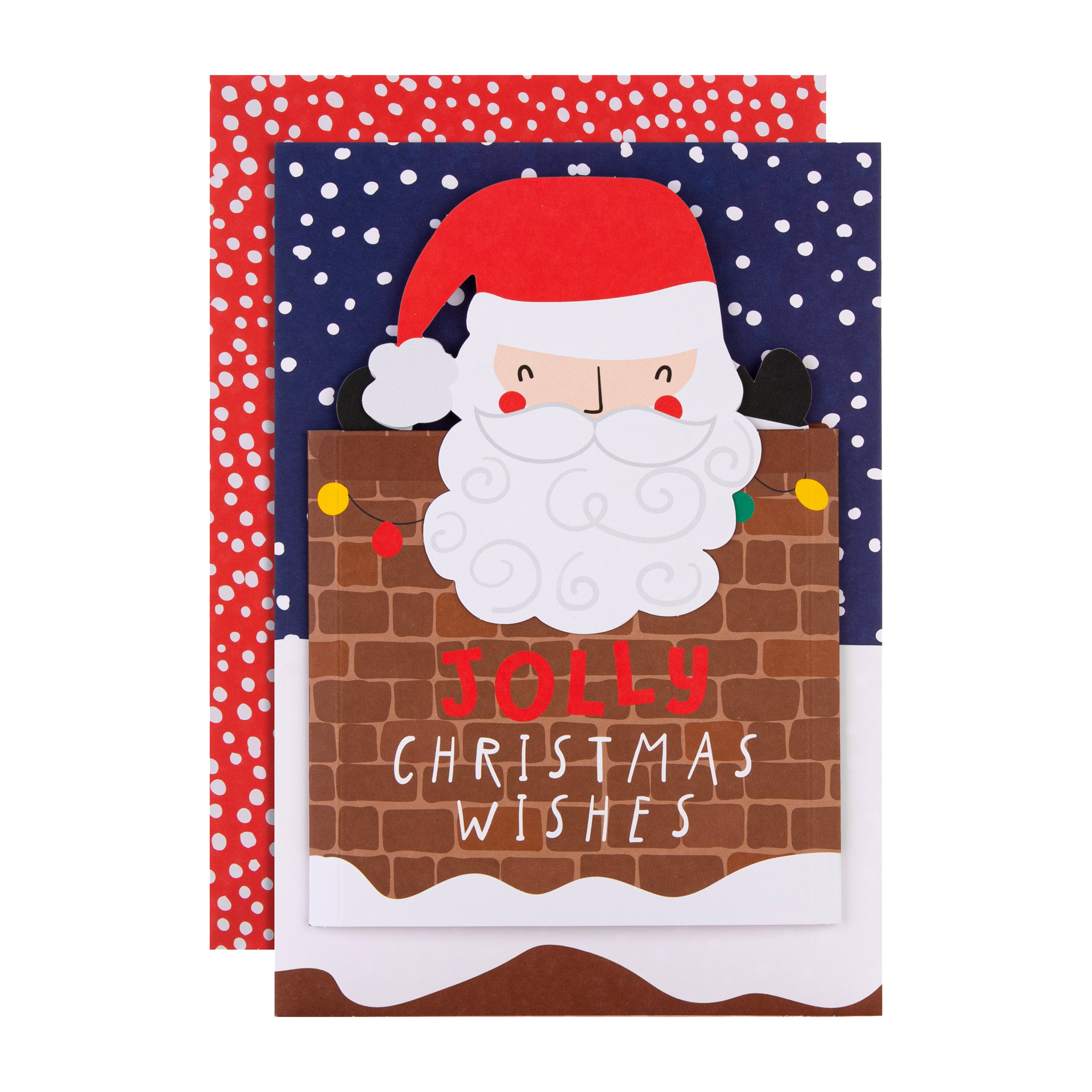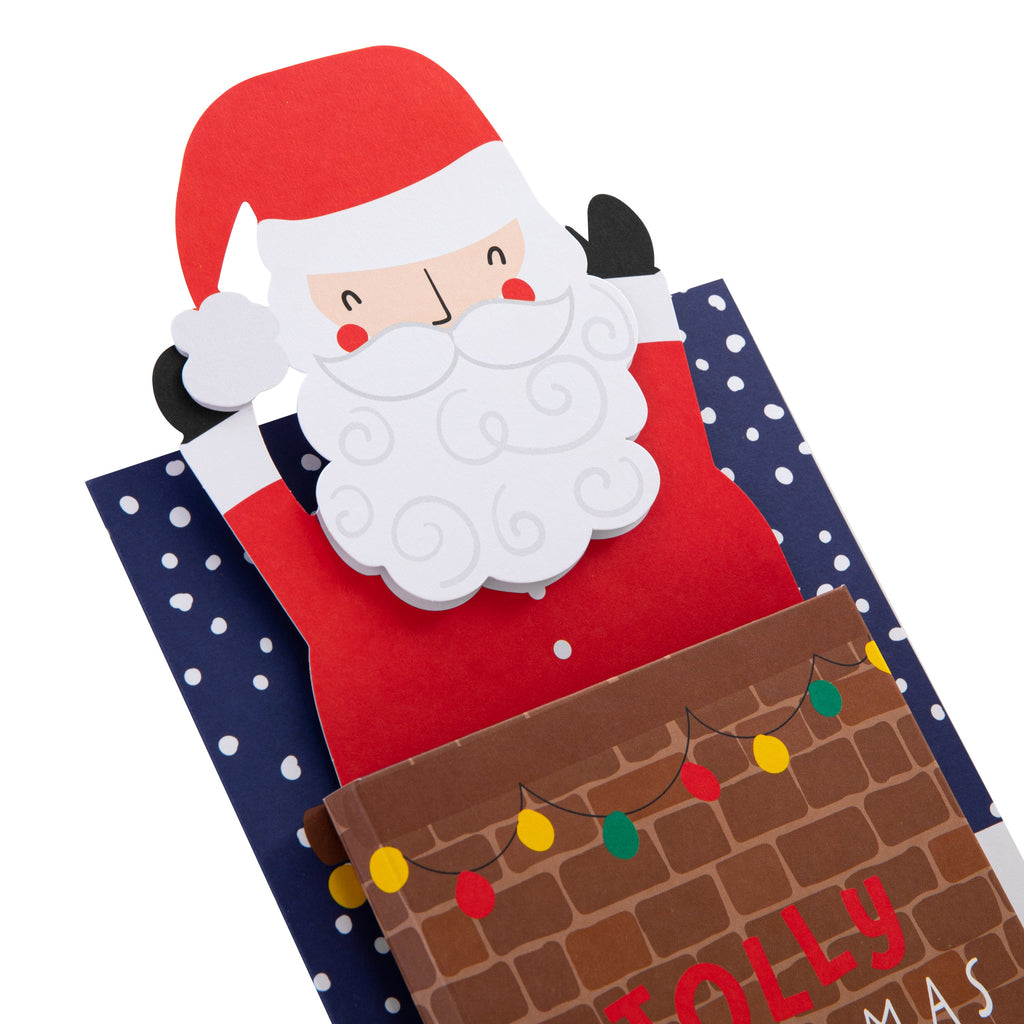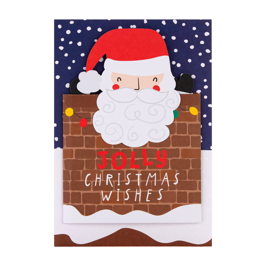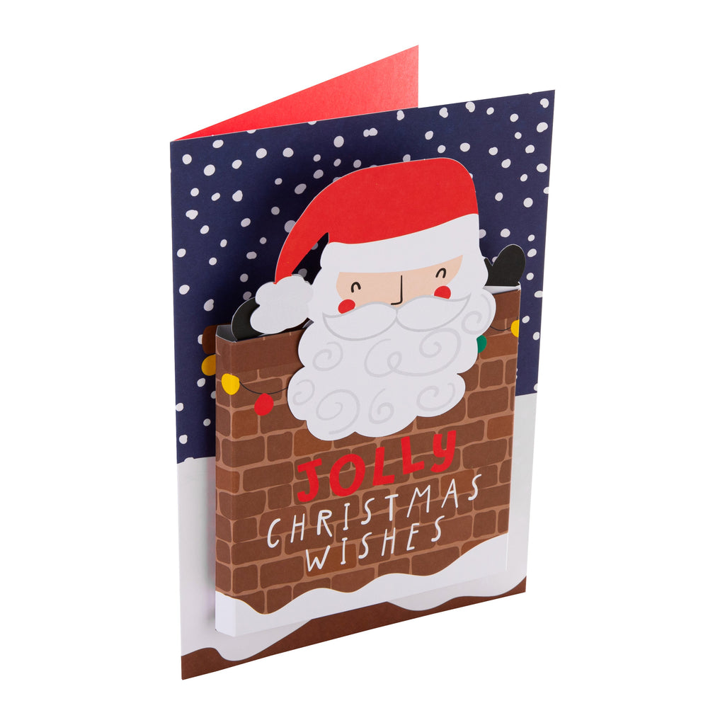 Printed on high-quality board, this card pops-up into a cute Santa in chimney design where the chimney pops out into a 3D attachment and Santa coming out of the top, features the message, 'Jolly Christmas Wishes', on the front, die-cut details and a 3D pop-out attachment. This card comes complete with a co-ordinating Hallmark branded, red and white spotted envelope.