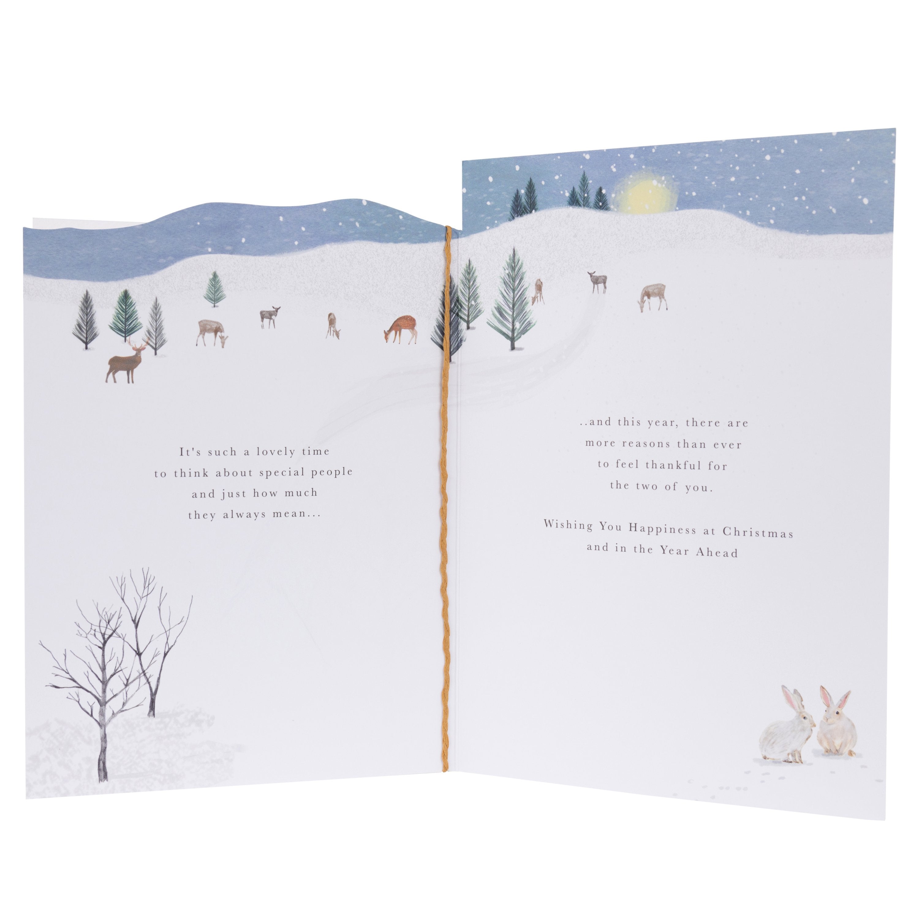 Message Inside Reads: It's such a lovely time to think about special people and just how much they always mean… …and this year, there are more reasons than ever to feel thankful for the two of you. Wishing you happiness at Christmas and in the year ahead