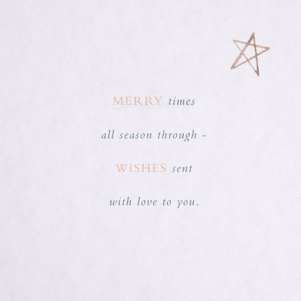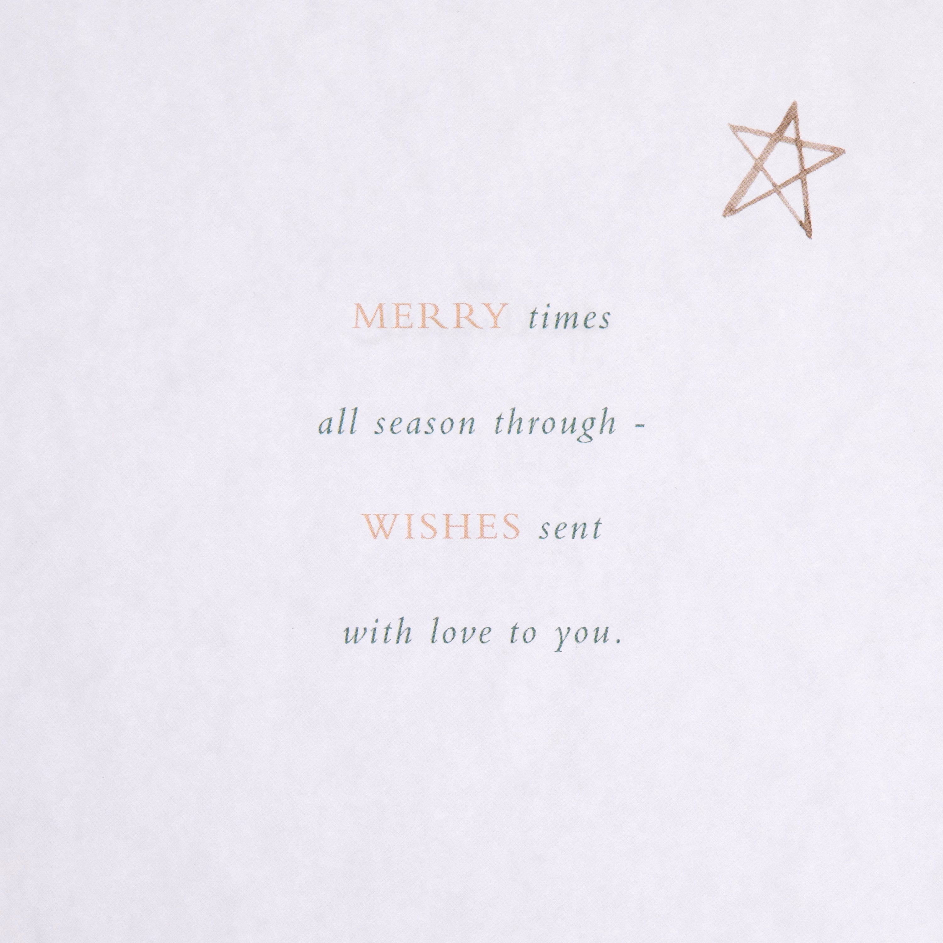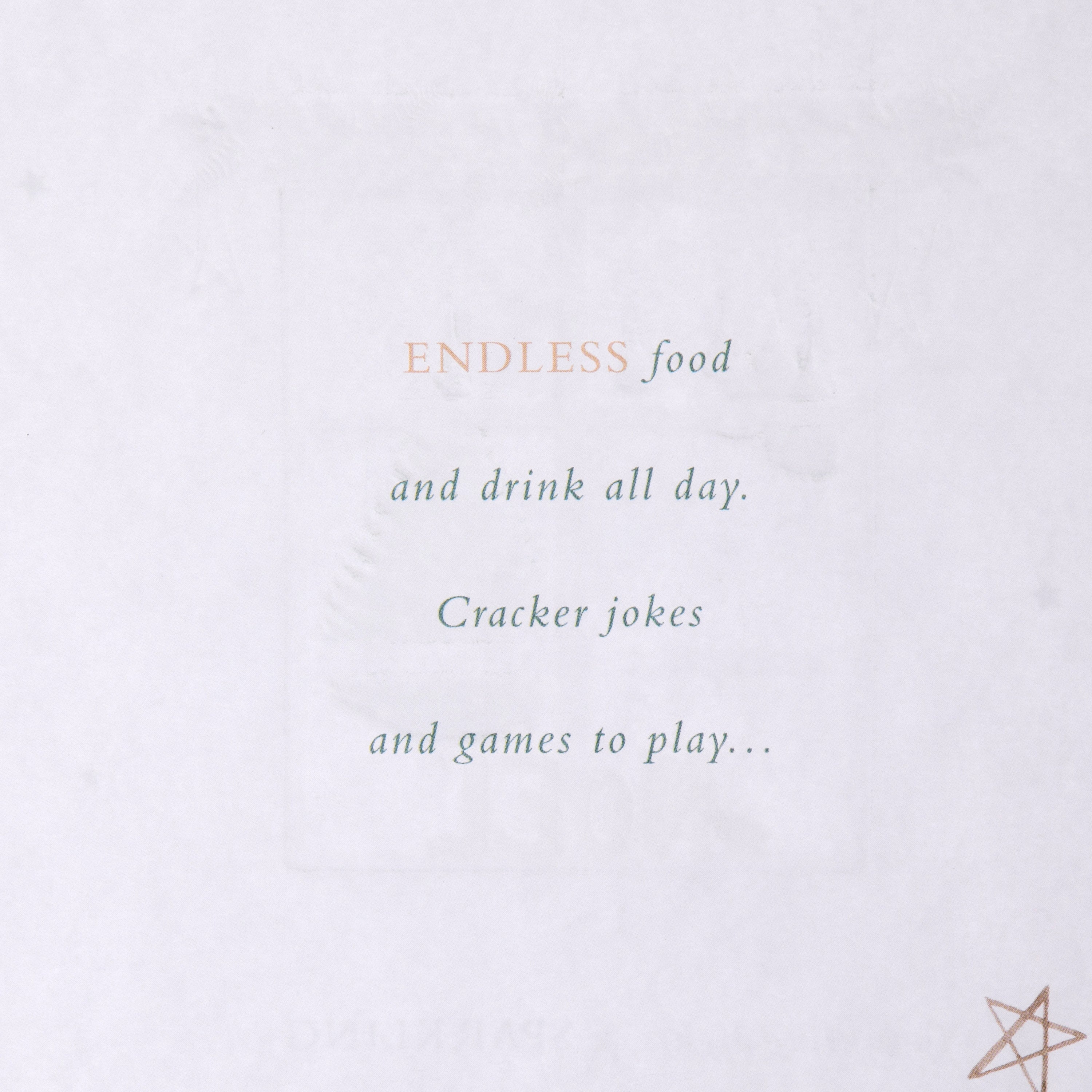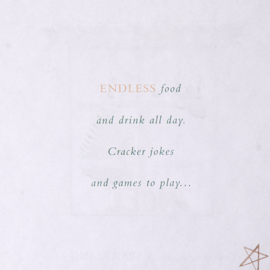 Message Inside Reads: Endless food and drink all day. Cracker jokes and games to play… Merry times all season through - Wishes sent with love to you.