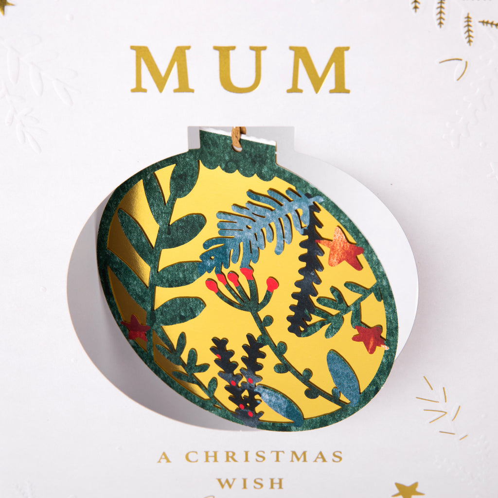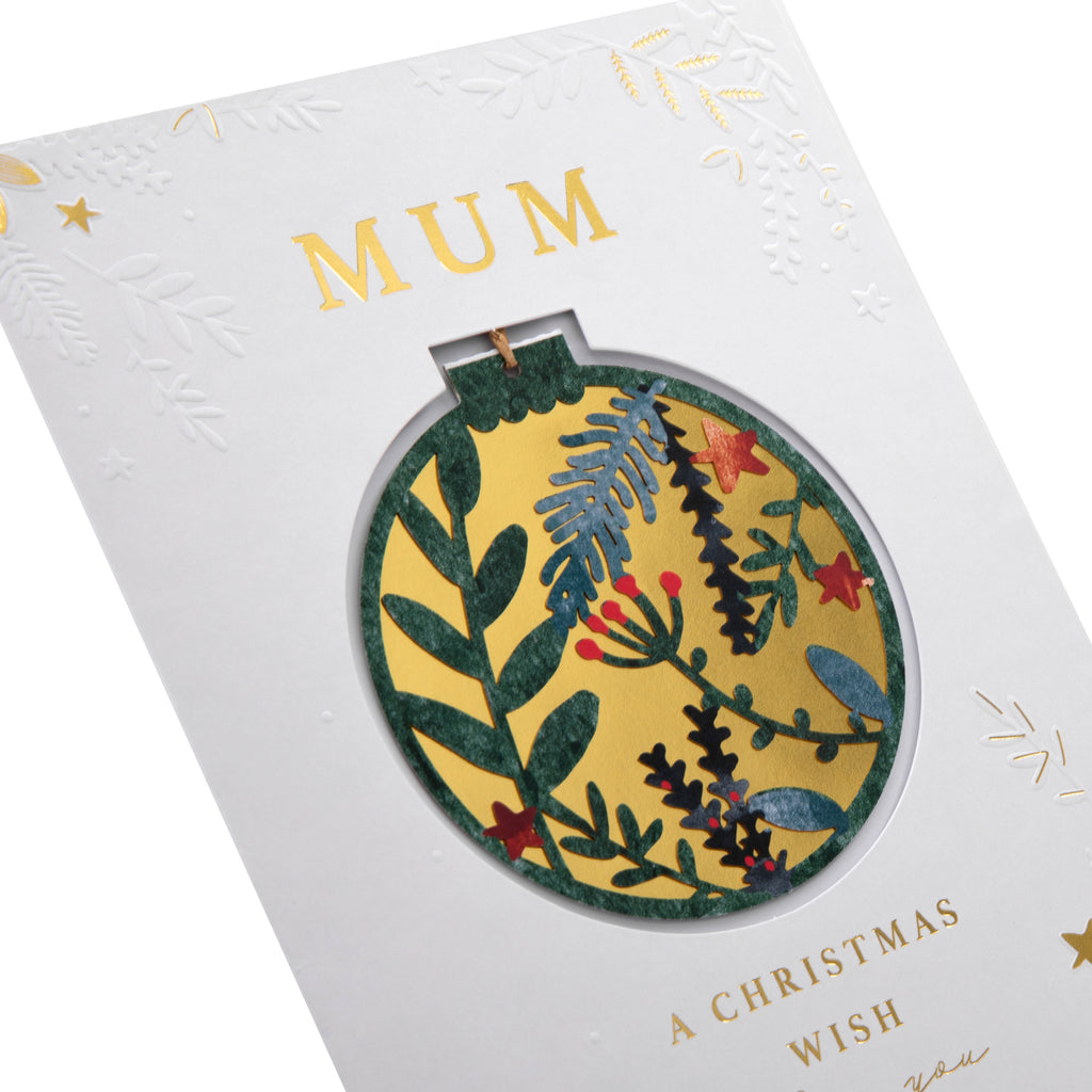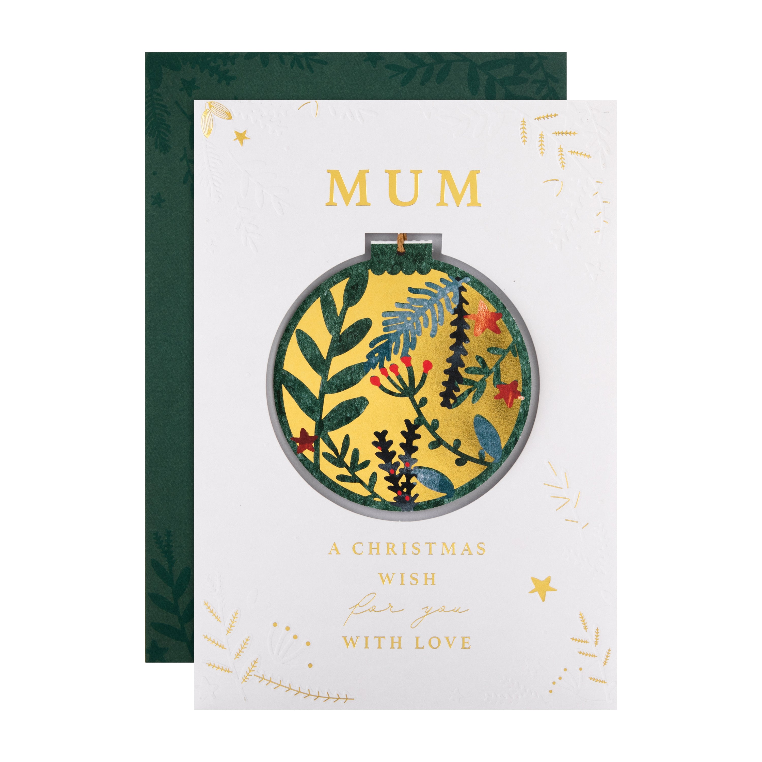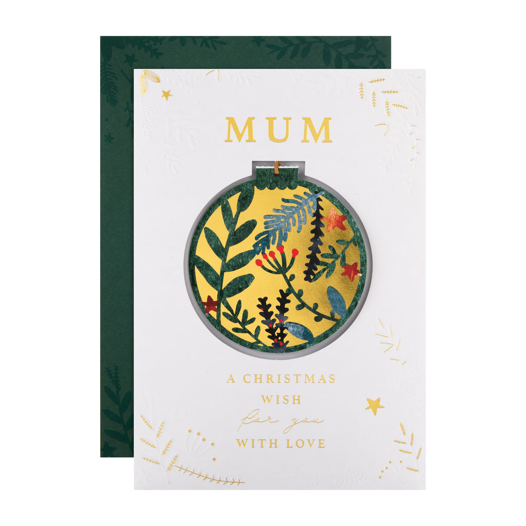 Printed on high-quality board, this card features the message 'Mum, a Christmas wish for you with love.' on the front, embossed elements, paper insert, metallic gold foil details and a detachable keepsake die-cut bauble shaped hanging attachment with a 3D die-cut embellishment and brown paper twine. This card comes complete with a Hallmark branded, green patterned envelope.
