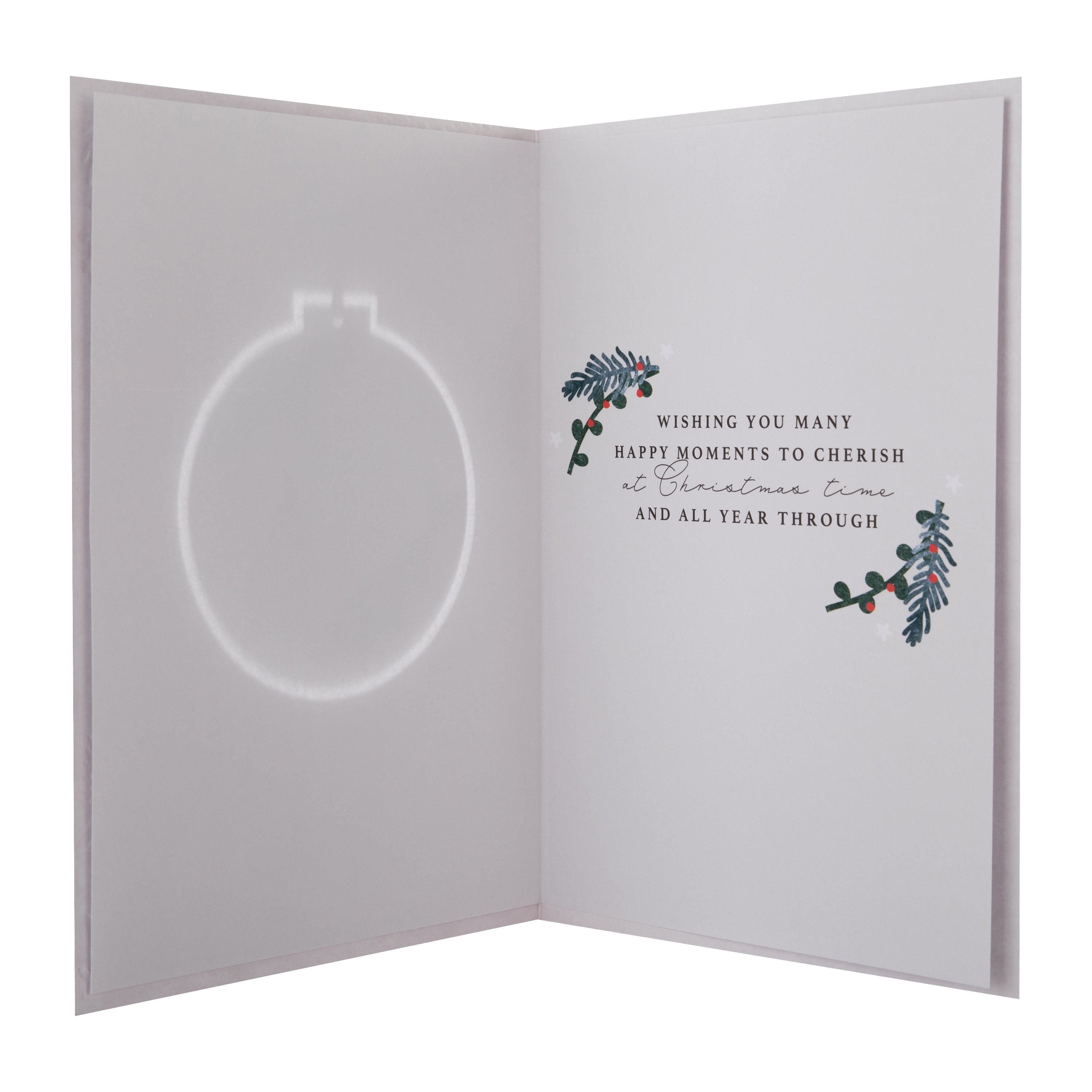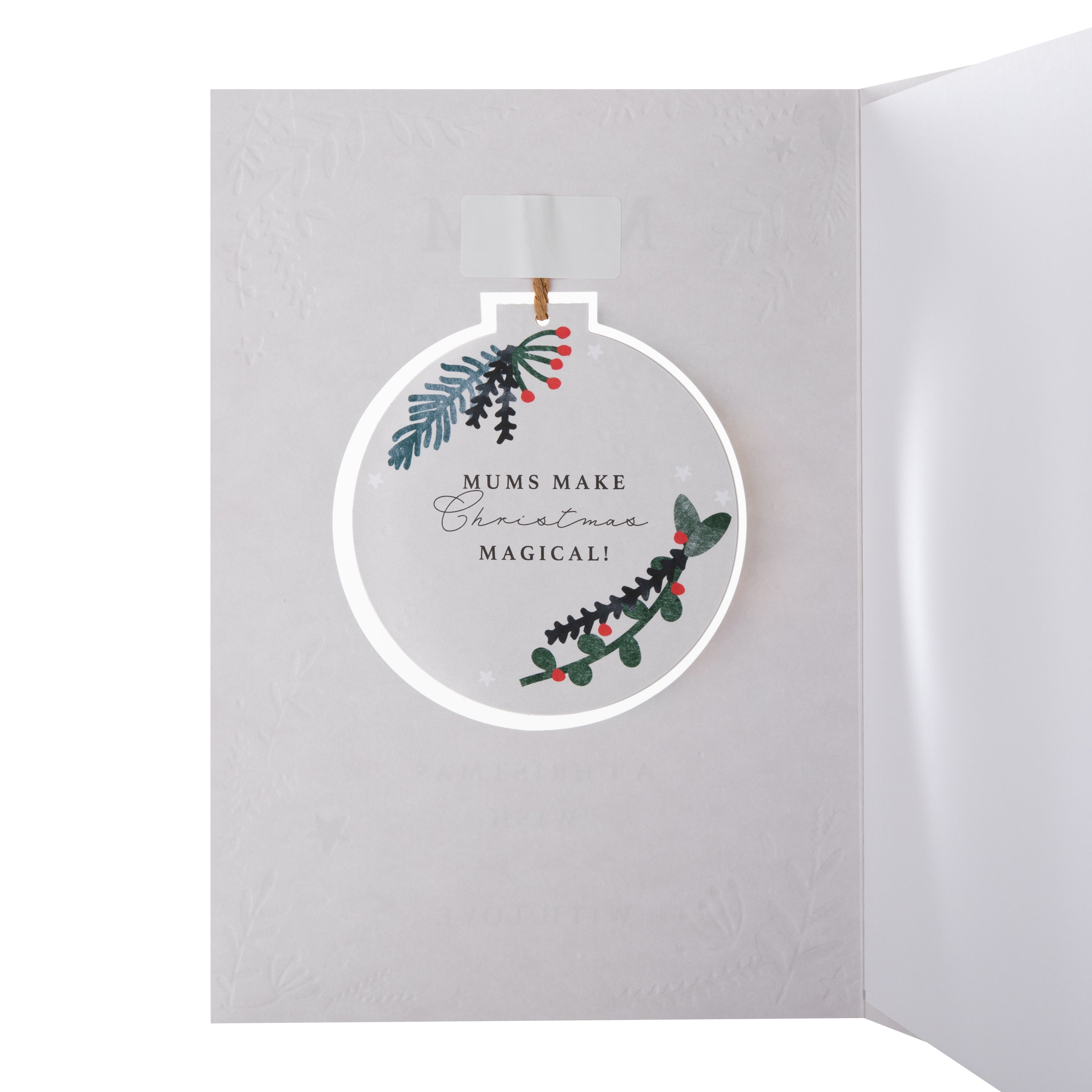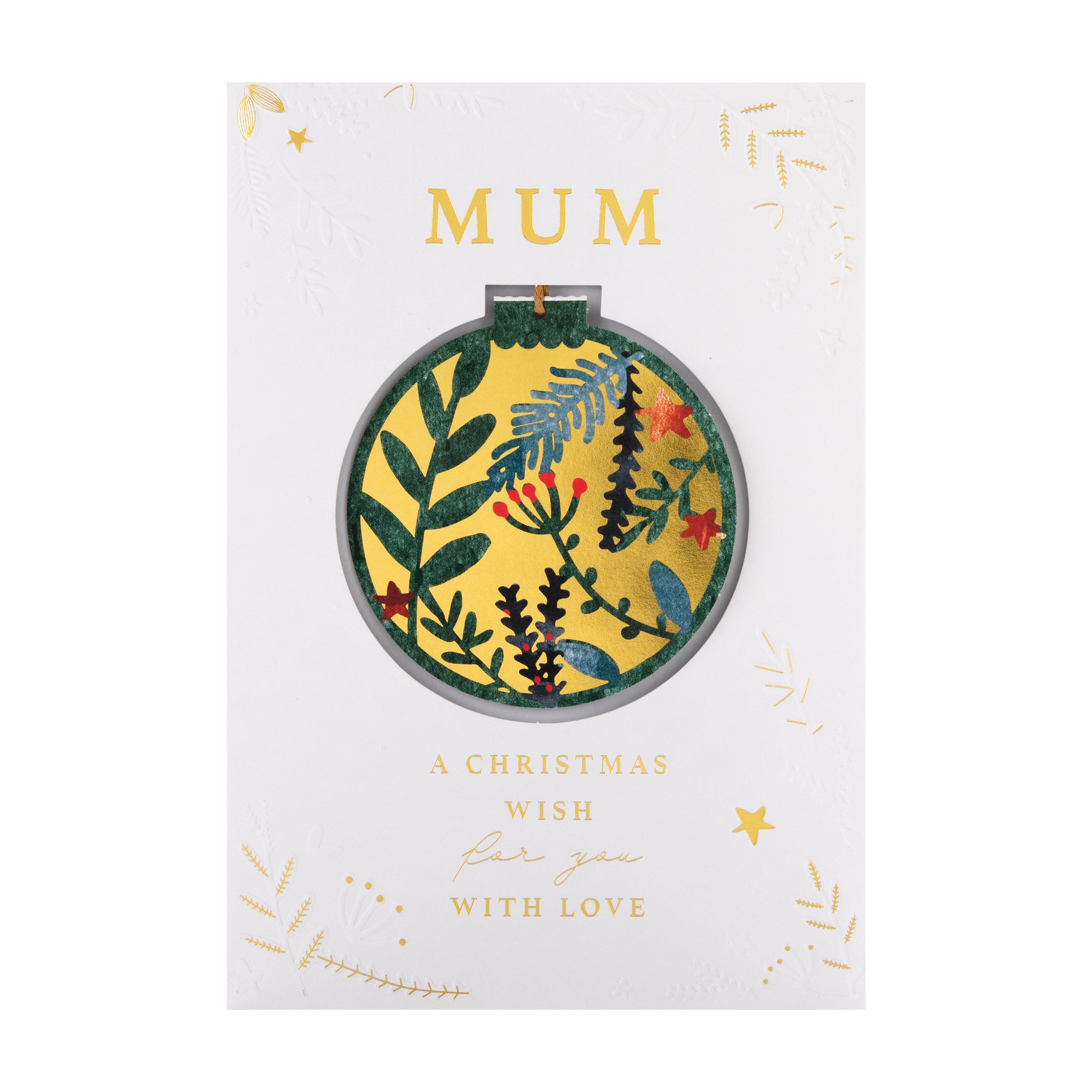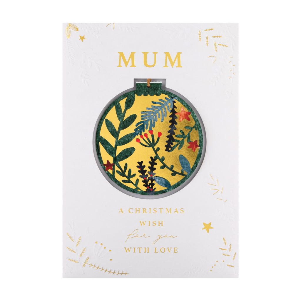 Printed on high-quality board, this card features the message 'Mum, a Christmas wish for you with love.' on the front, embossed elements, paper insert, metallic gold foil details and a detachable keepsake die-cut bauble shaped hanging attachment with a 3D die-cut embellishment and brown paper twine. This card comes complete with a Hallmark branded, green patterned envelope.