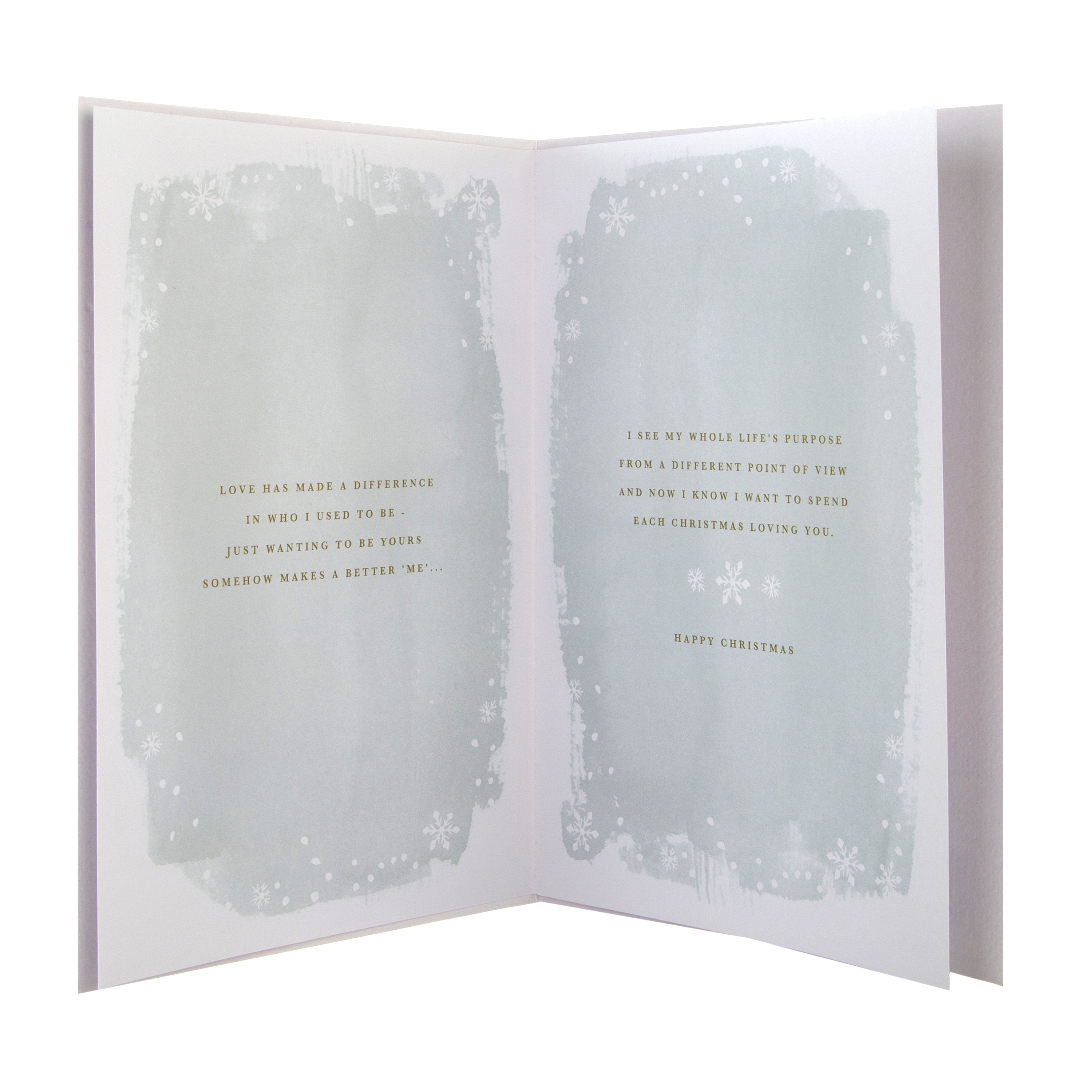 Message Inside Reads: Love has made a difference in who I used to be - just wanting to be yours somehow makes a better 'me'…I see my whole life's purpose from a different point of view and now I know I want to spend each Christmas loving you. Happy Christmas.