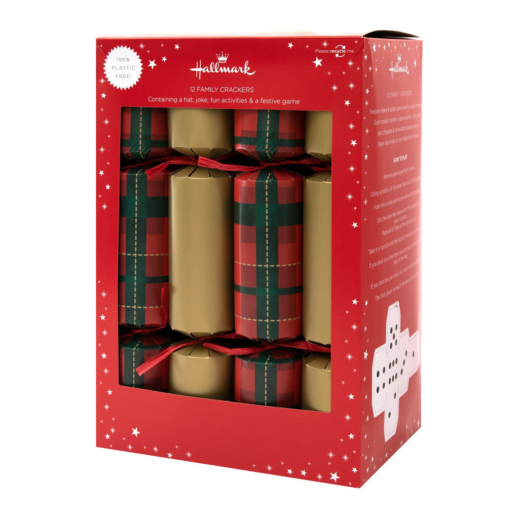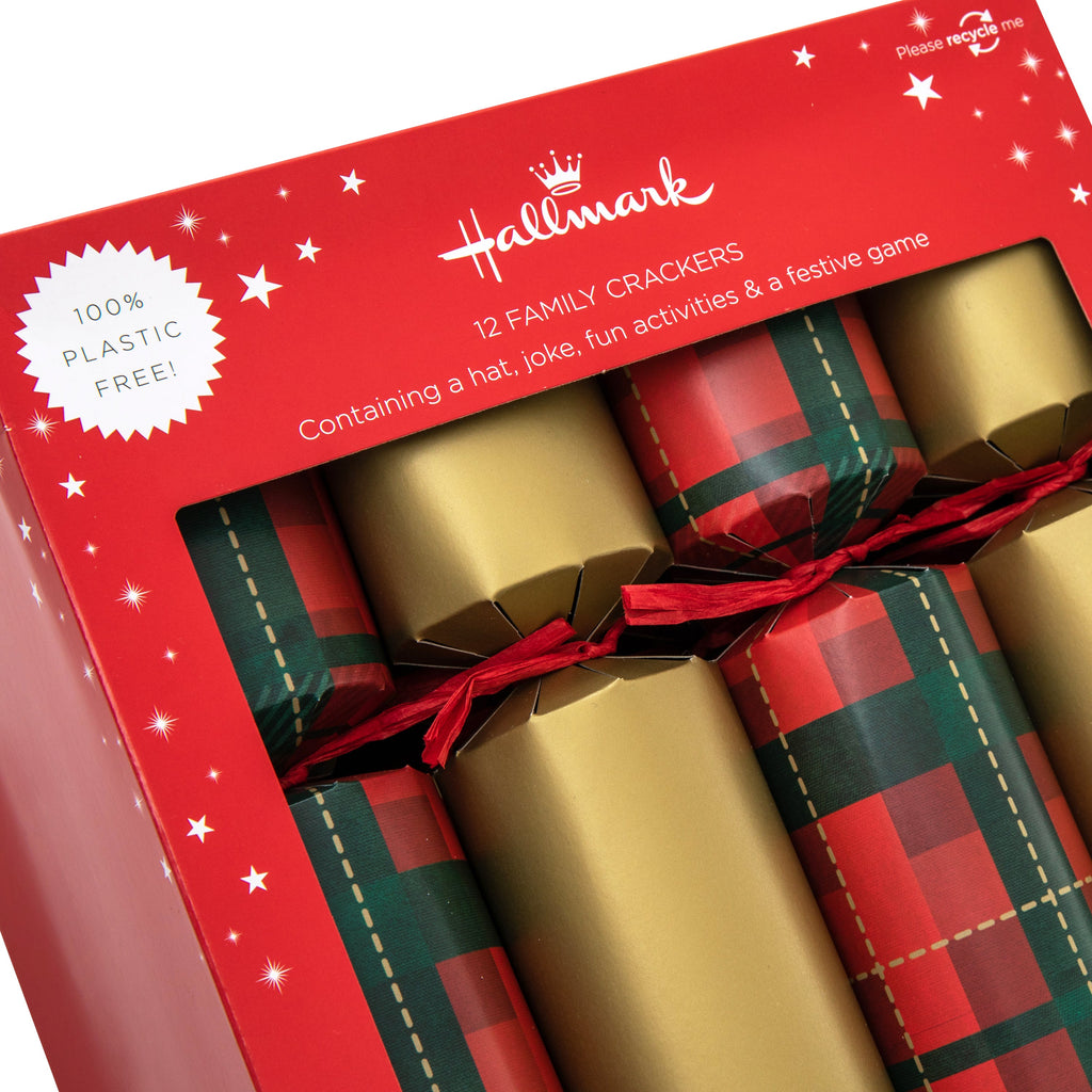 This pack of 12 Christmas crackers is 100% plastic free and contains 2 designs, plain gold, and red and green tartan. Both designs feature red paper raffia chokes.