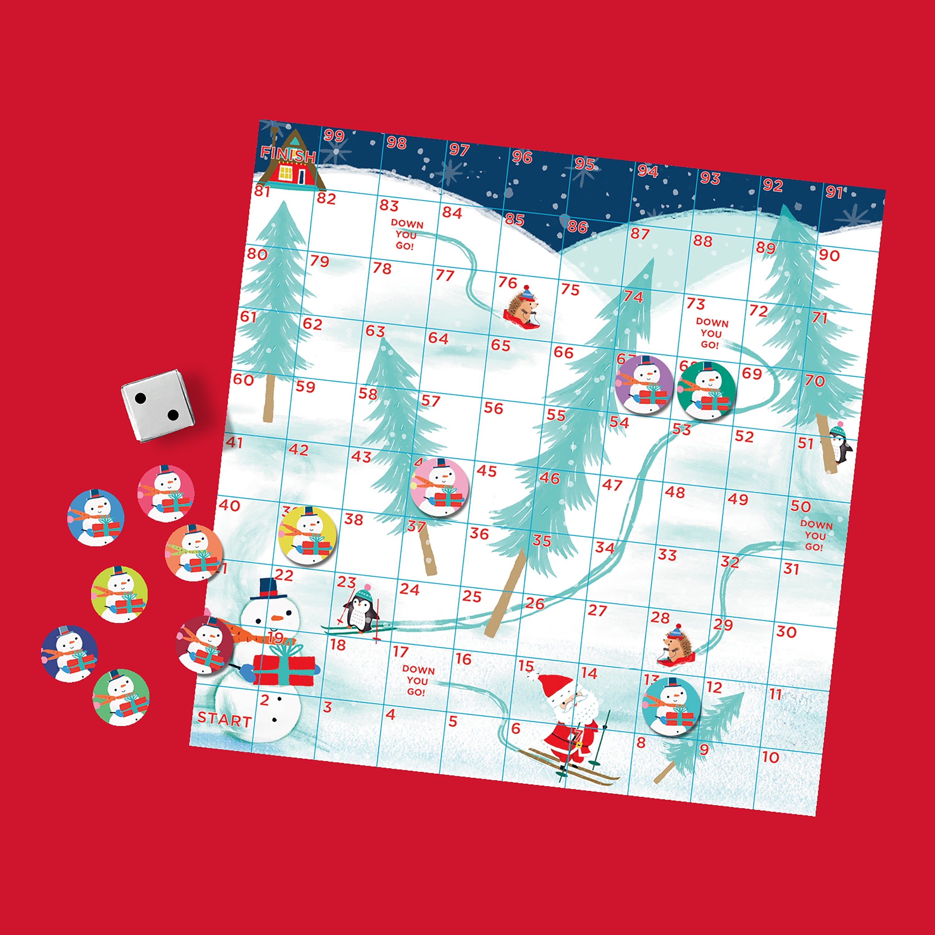 Each cracker features a game counter, a hat, a joke, charades and conversation starters. A festive game of snakes and ladders is included in the box, as well as paper dice you can cut out and fold from the box.