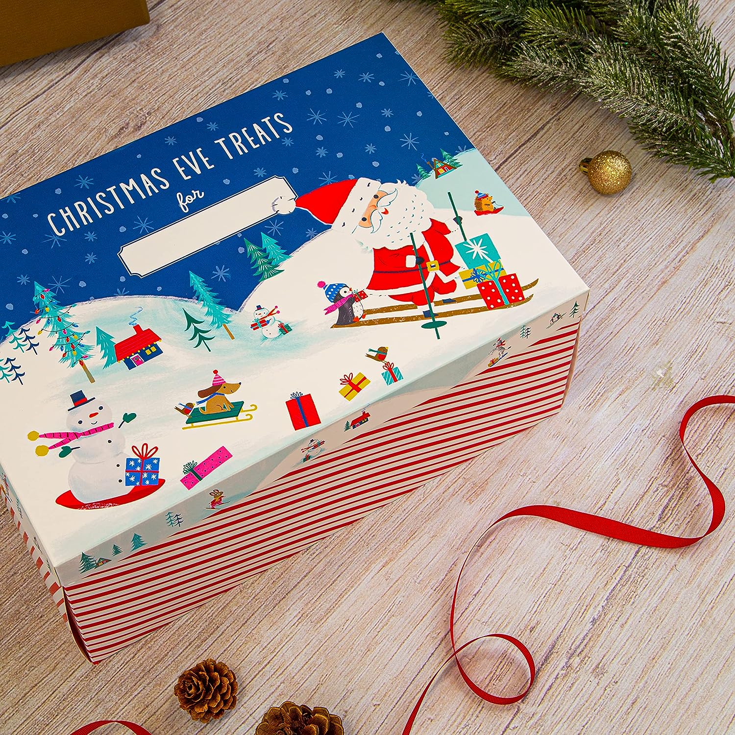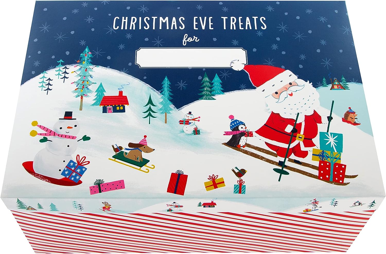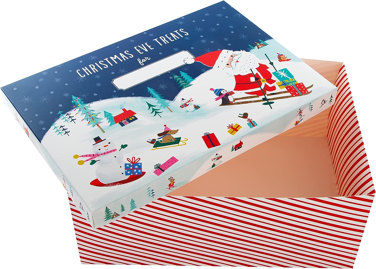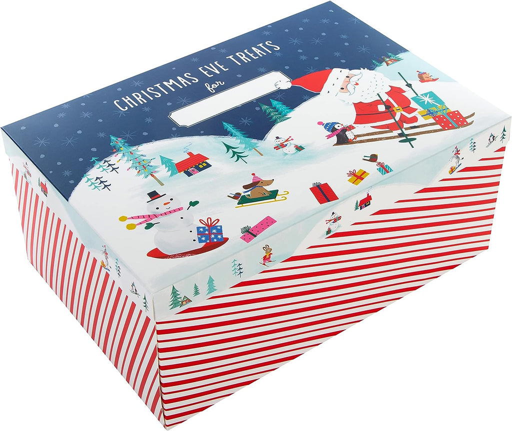 This Christmas eve box features an illustrated design on the lid of Father Christmas, and a snowy scene, red and white stripes on the sides of the box and space on the lid to write your child's name.