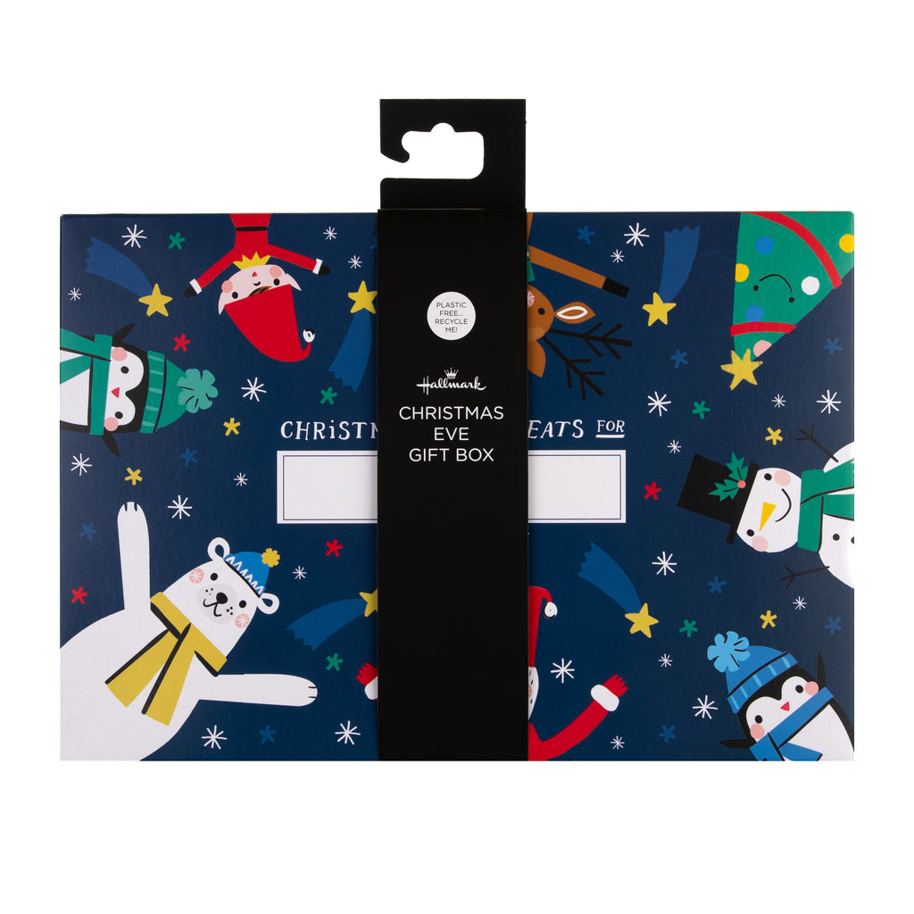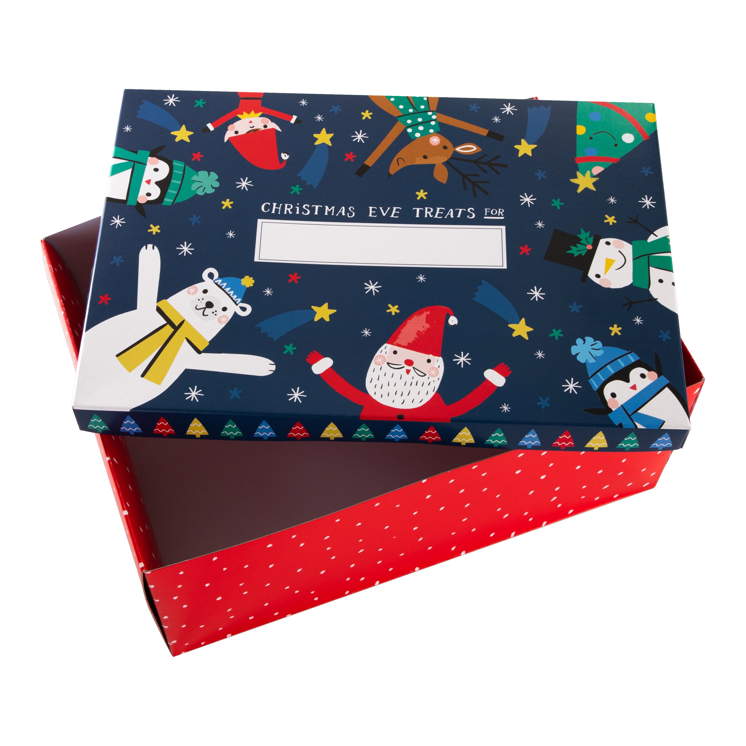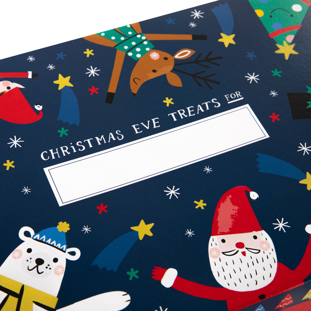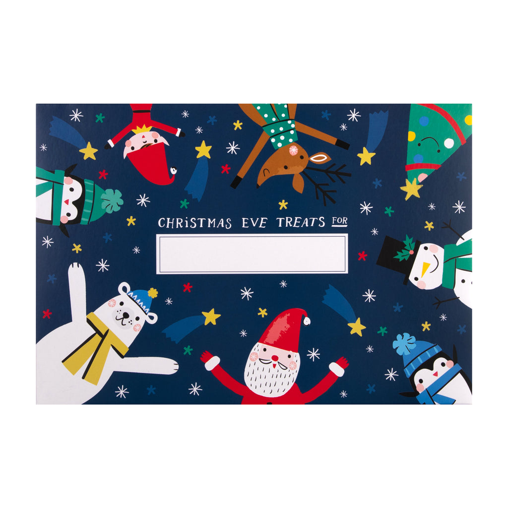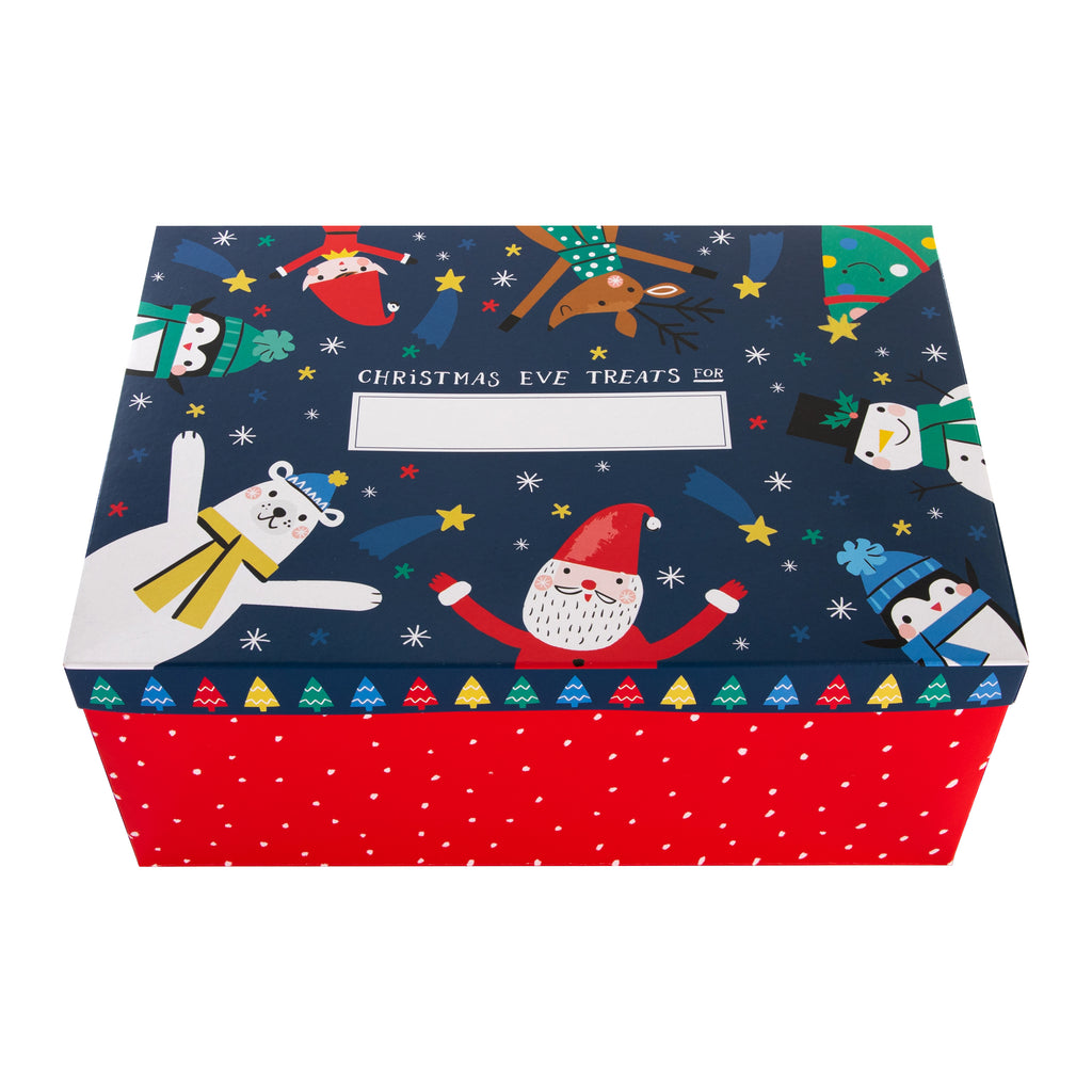This Christmas eve box features an illustrated design on the lid of an elf, penguins, Santa, a polar bear, reindeer and tree, red patterned sides and space on the lid to write your child's name with the message 'Christmas Eve Treats for'.