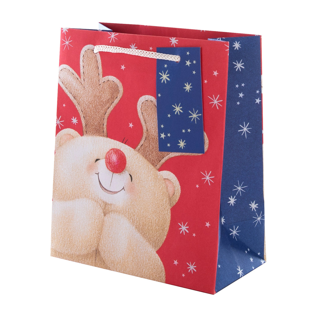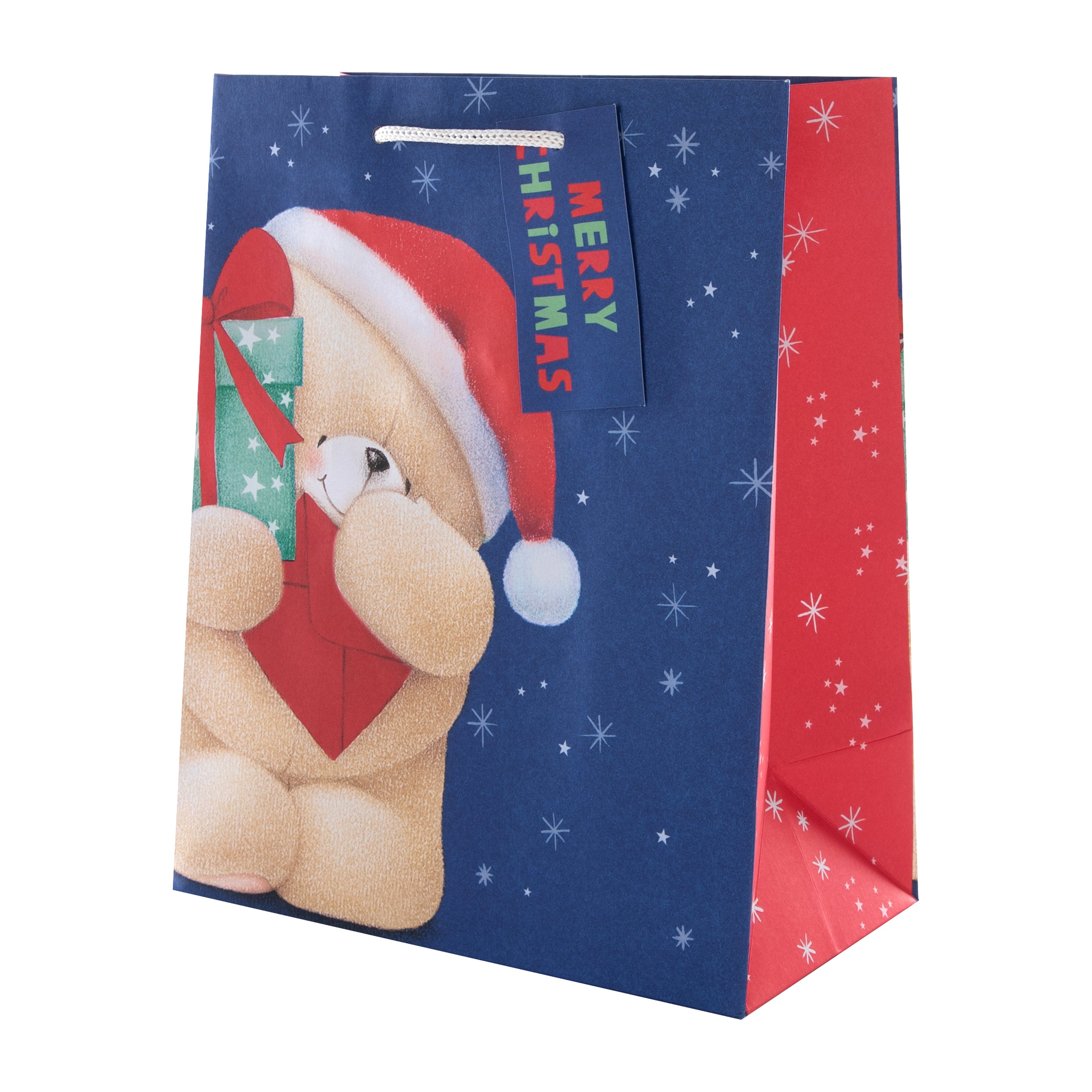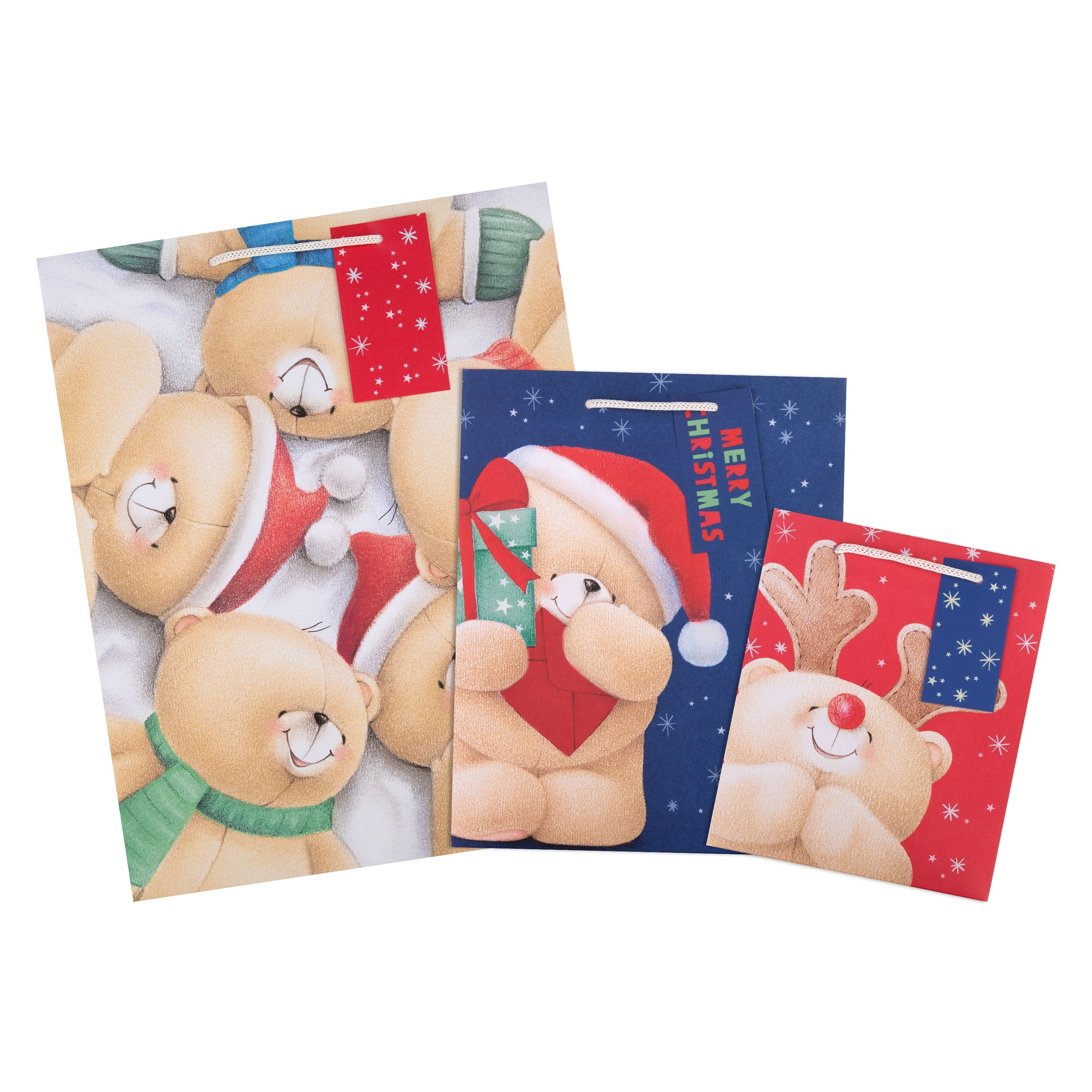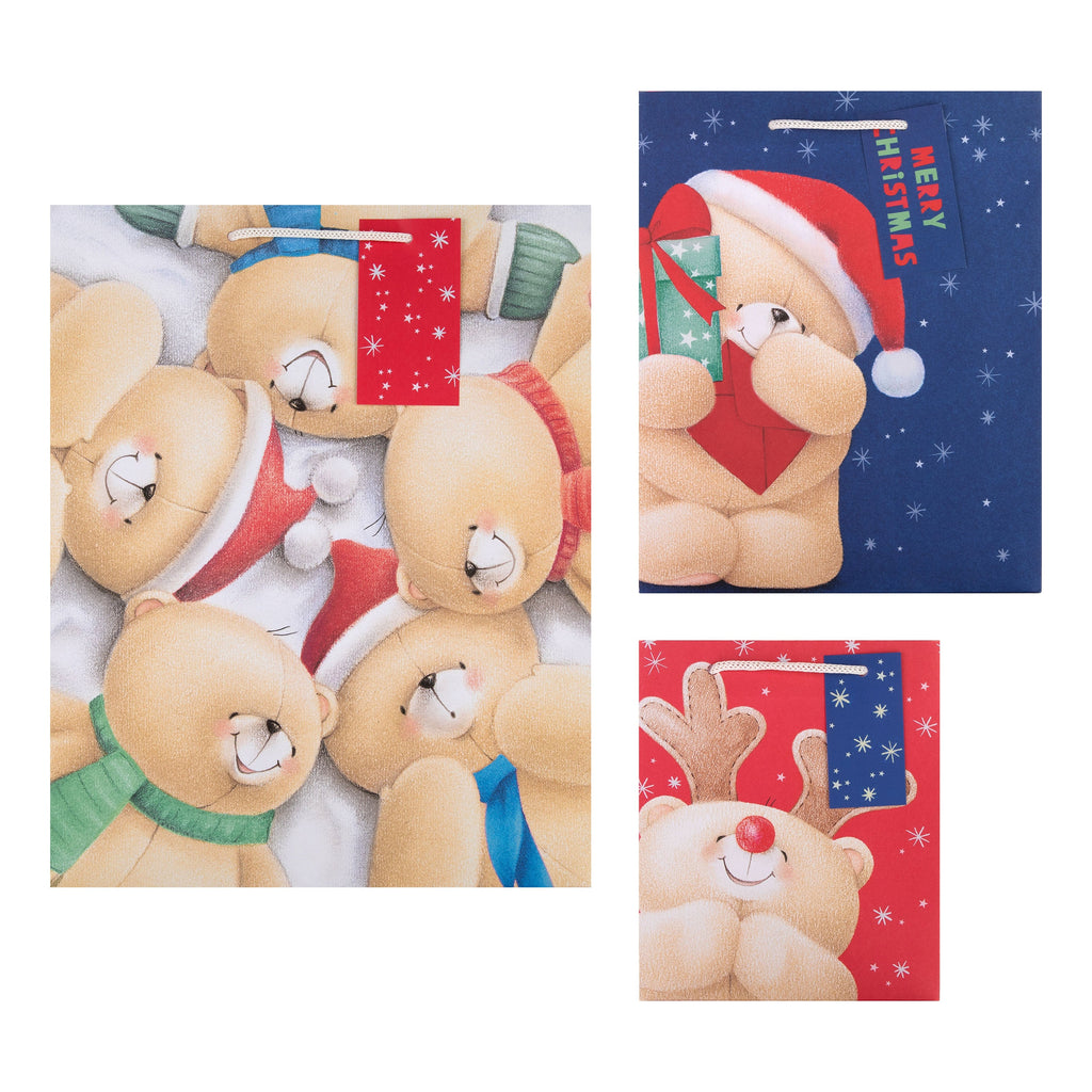 This pack contains a large, medium and small Christmas gift bag in three Forever Friends designs with white knitted paper handles. The large bag features a cute design of Forever Friends bears playing in the snow, with a red rectangular gift tag with stars design. The medium bag features a blue background with a festive design of a Forever Friends bear wearing a Santa hat and holding a present, with a blue rectangular gift tag with the message 'Merry Christmas'. The small bag features a red background with a cute design of a Forever Friends bear dressed as a reindeer wearing antlers and a red nose, with a blue rectangular gift tag with stars design.