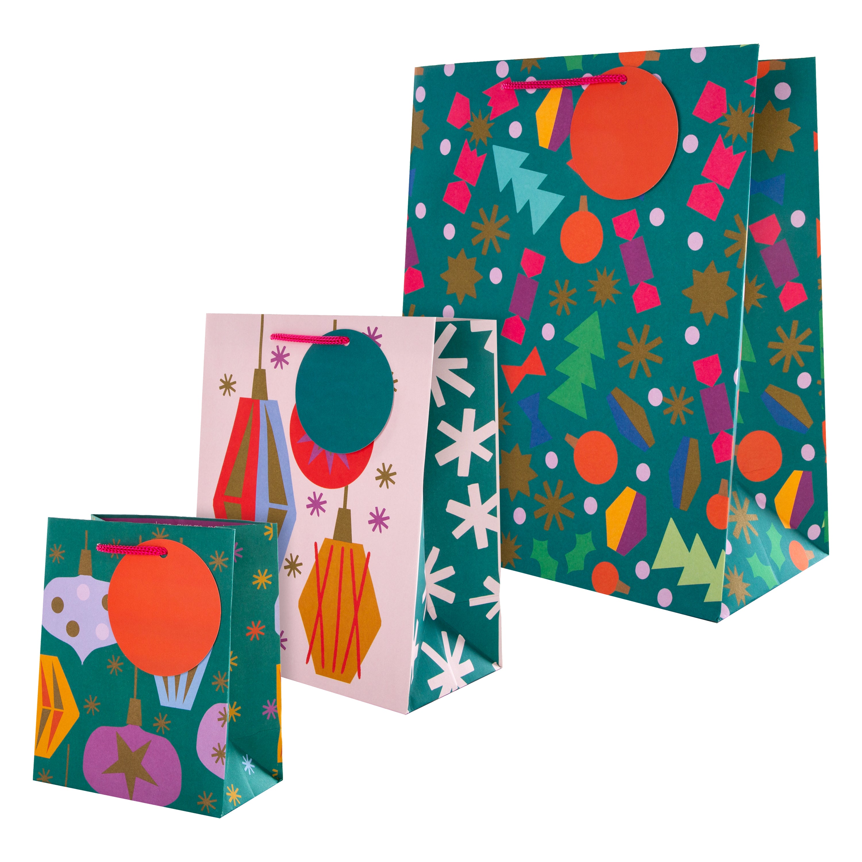 This pack features 3 bags in 3 festive designs, the small and large bags feature 2 green designs with abstract festive shapes, and the medium bag features a white background with green sides with abstract festive shapes. Each bag features red knitted handles and come complete with co-ordinating blank, circular gift tags.