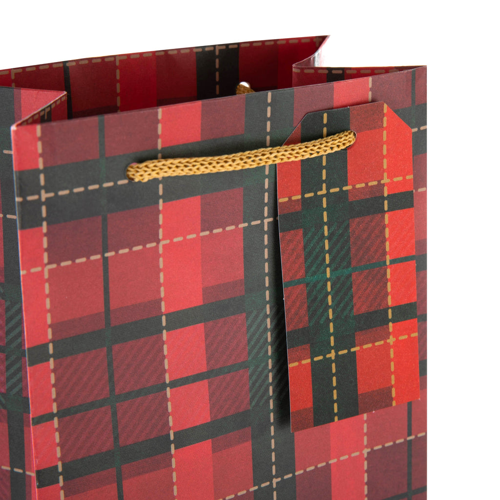 All bags feature a red and green tartan design, with gold knitted paper cord handles and die cut tartan gift tags.