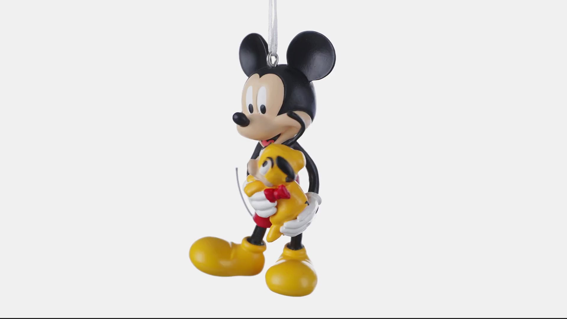 This ornament features Disney's Mickey Mouse holding a puppy Pluto, and is made of hard-wearing resin with a hanging attachment for easy display.