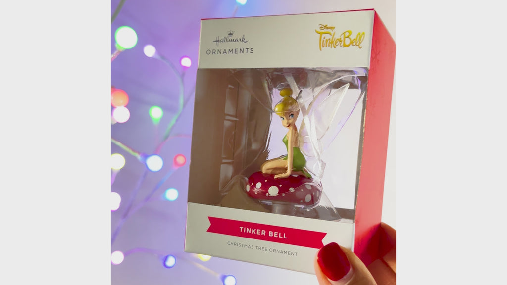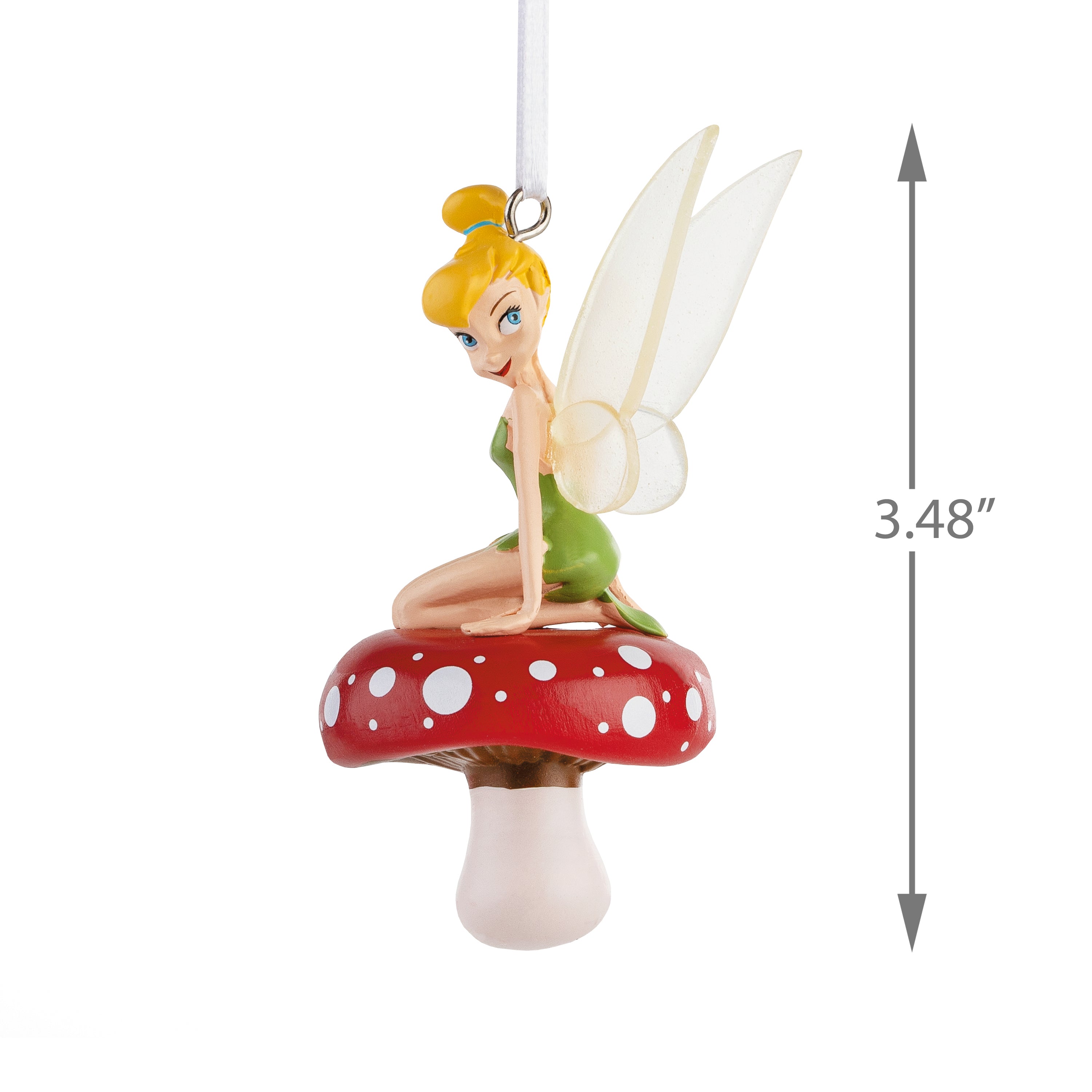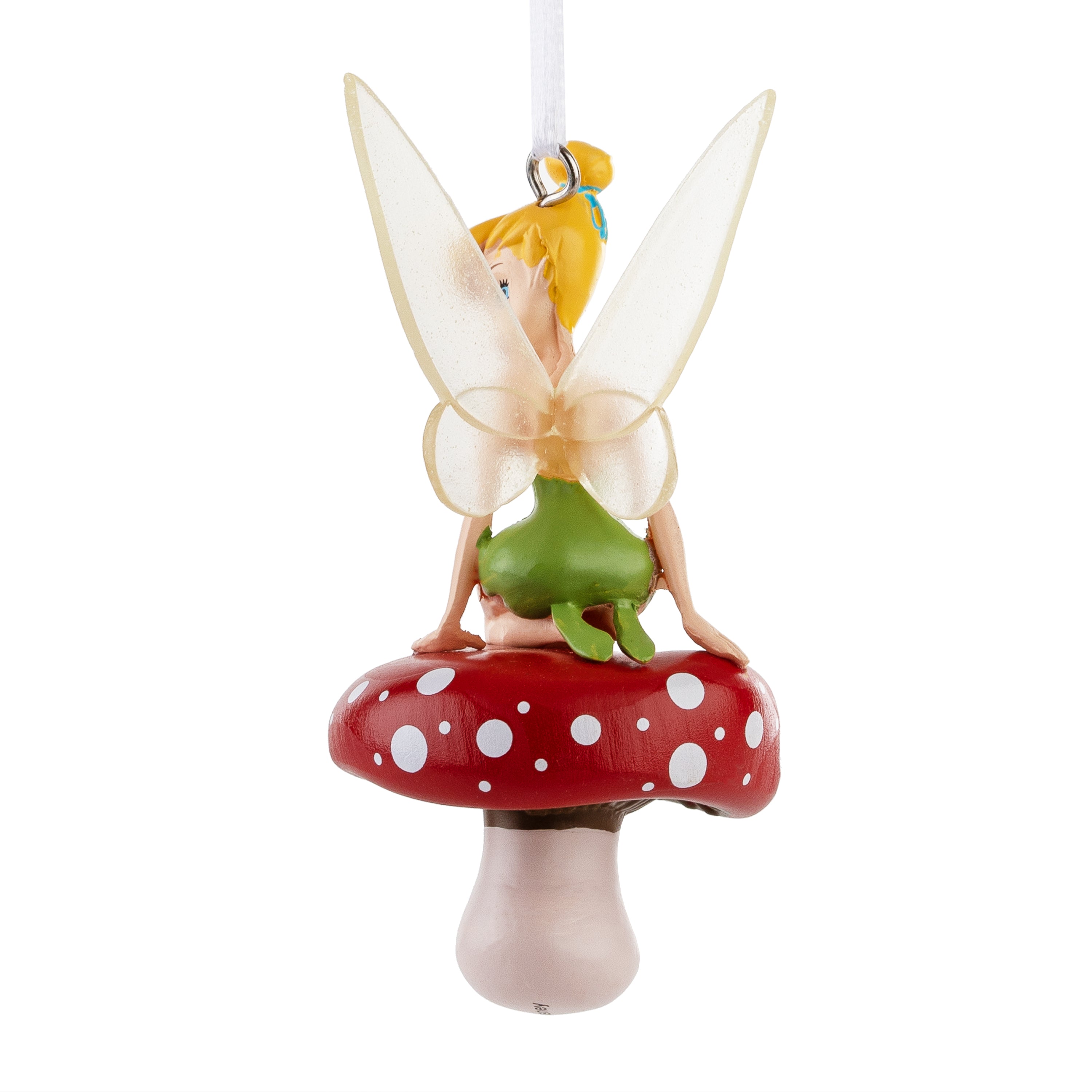 This ornament features Tinker Bell sat on a red and white mushroom from Disney's Peter Pan and Tinker Bell movies, and is made of hard-wearing resin with a hanging attachment for easy display.