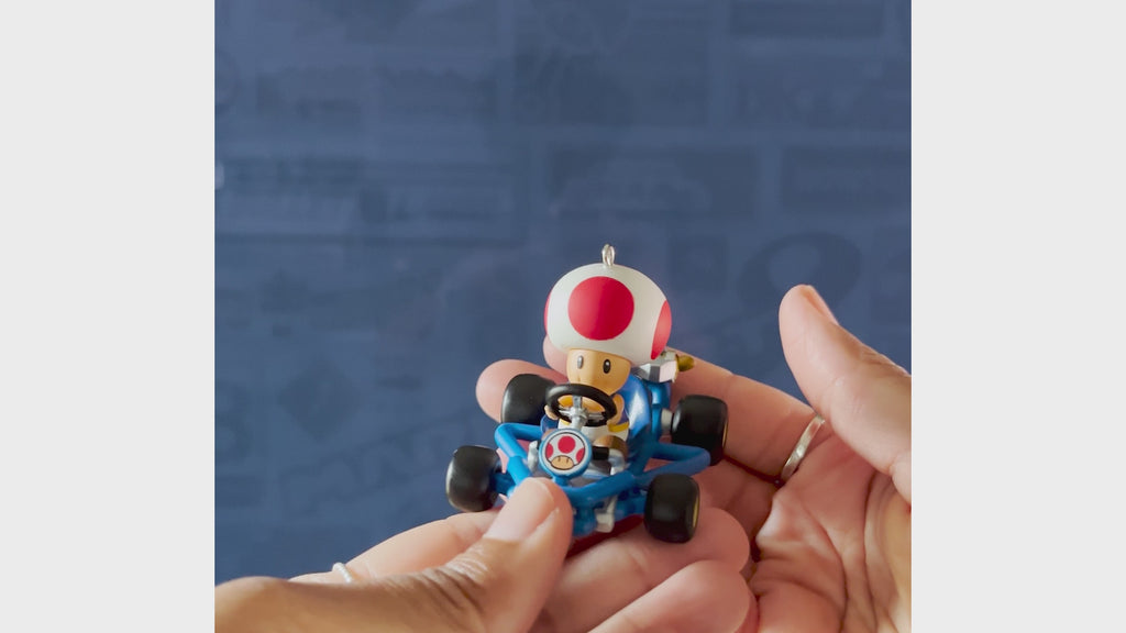 This ornament features Toad from the Super Mario universe in his iconic blue kart and a smile on his face. Simply add a loop of twine, ribbon or thread (not included) to the metal ring to suspend the keepsake in your home.