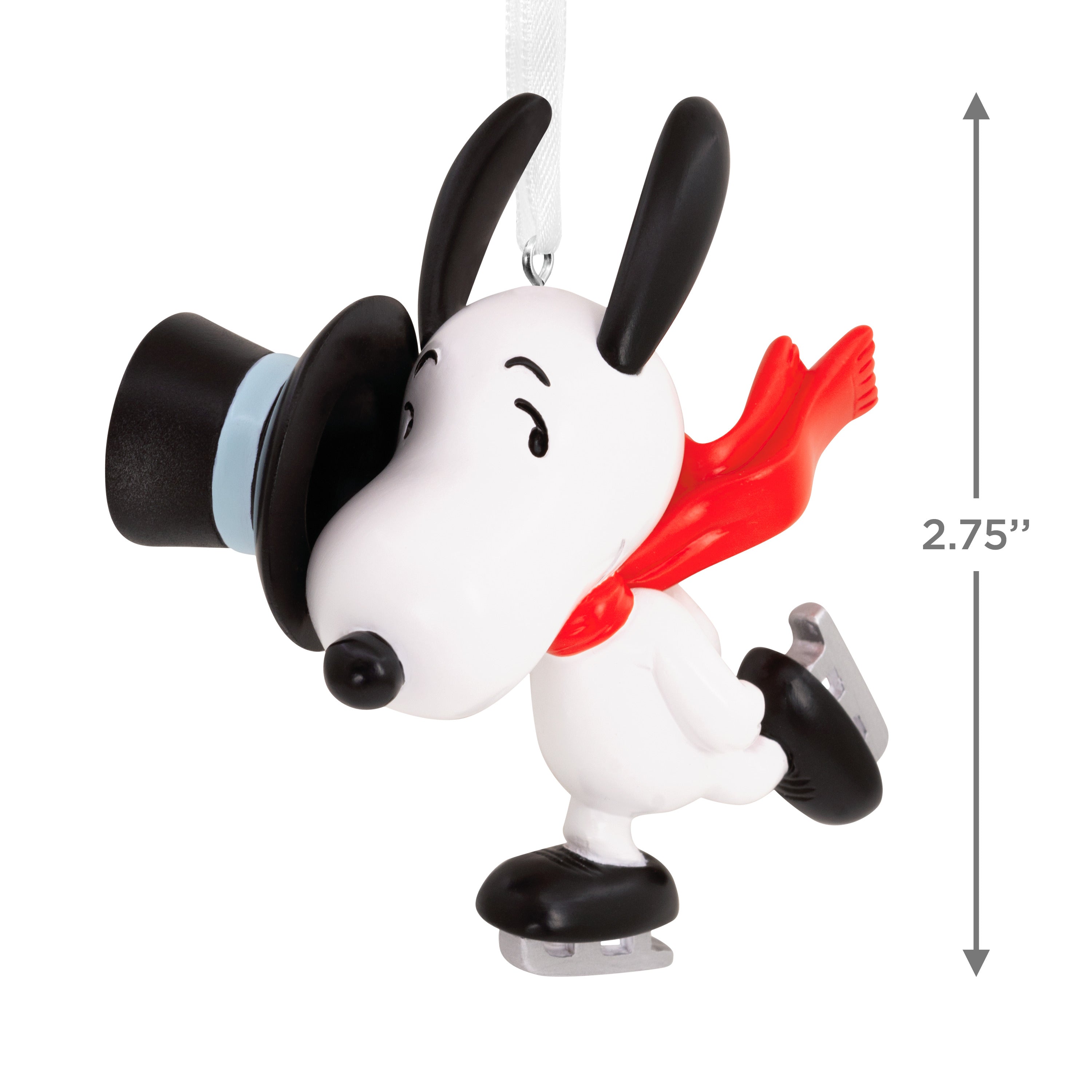 This hanging ornament is made from hardwearing resin and features PEANUTS™ SNOOPY ice-skating, wearing a red scarf and a holding a fashionable top hat, with a hanging loop and white ribbon for easy display.