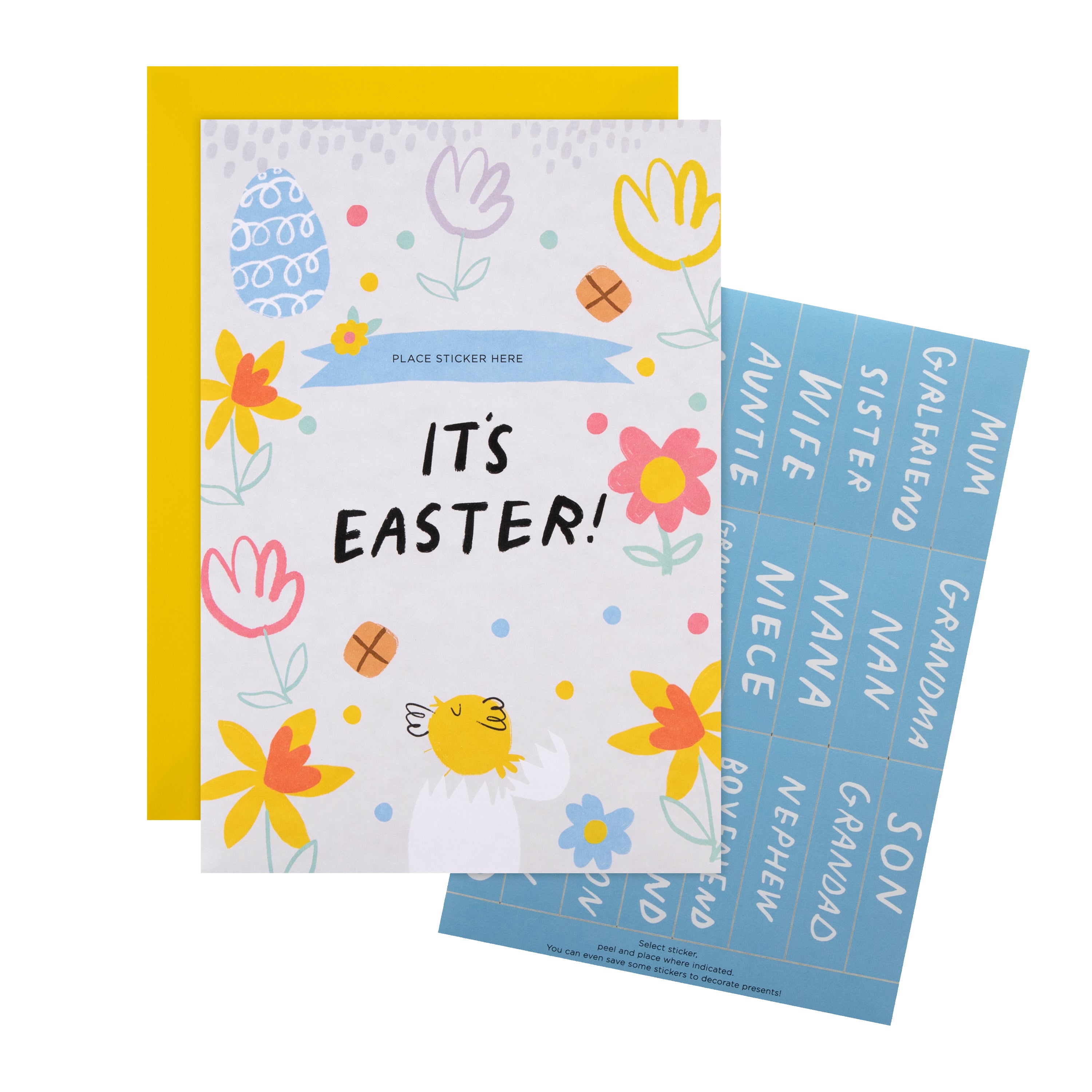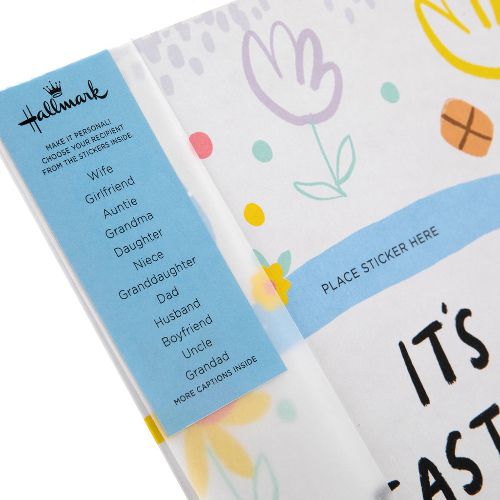 Printed on high-quality board, this card features an adorable Easter inspired illustration, personalisable recipient stickers including, Mum, Grandma, Son, Girlfriend, Nan, Grandad, Sister, Nana, Nephew, Wife, Niece, Boyfriend, Auntie, Granddaughter, Husband, Aunty, Dad, Grandson, Daughter, Brother, Cousin, Gran, Uncle, Friend, and comes complete with a co-ordinating yellow, Hallmark branded envelope.