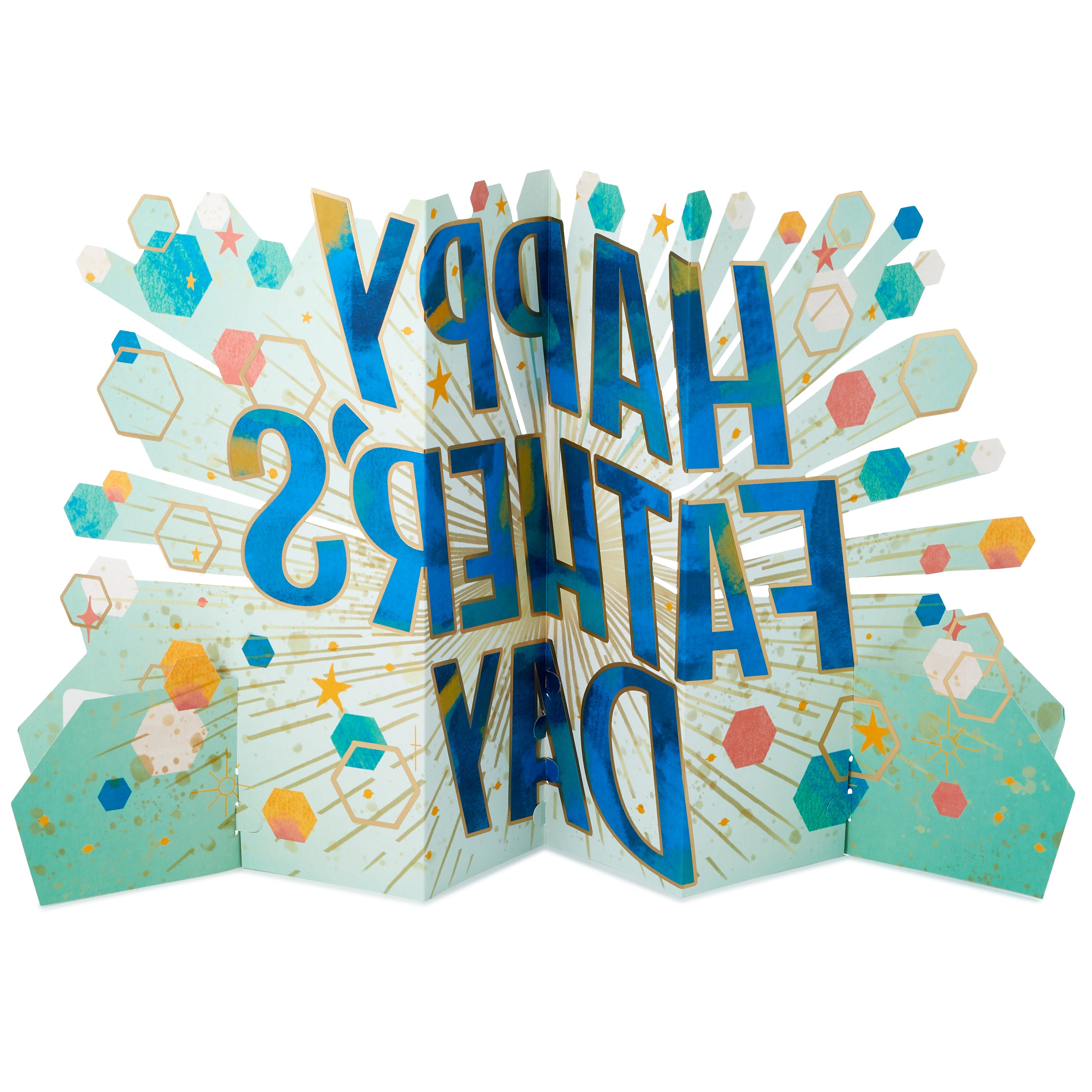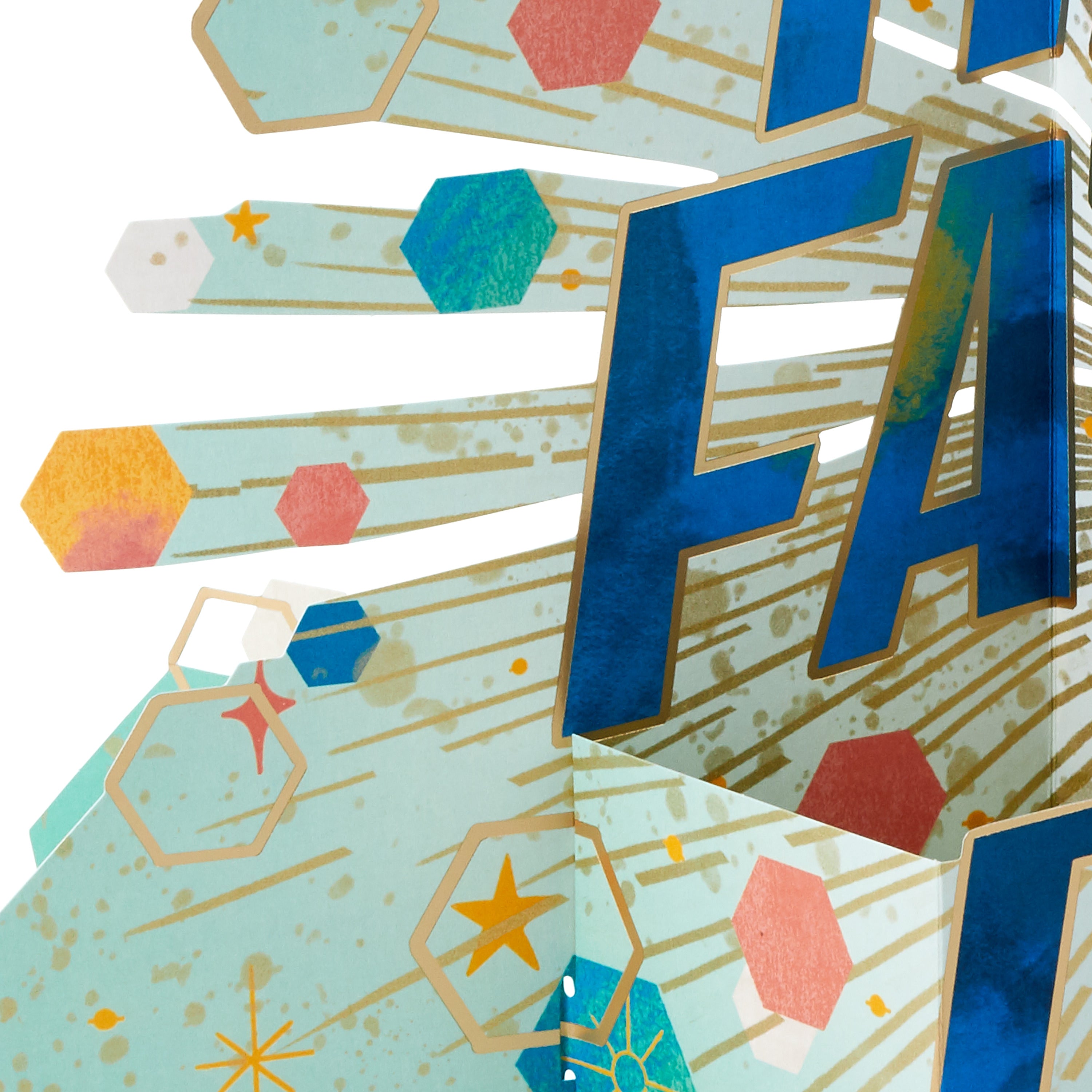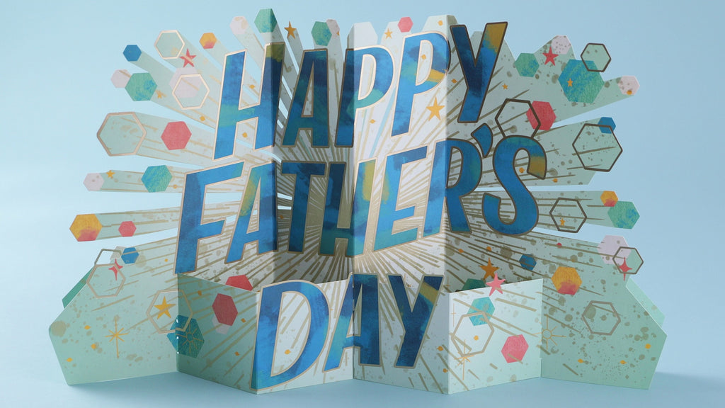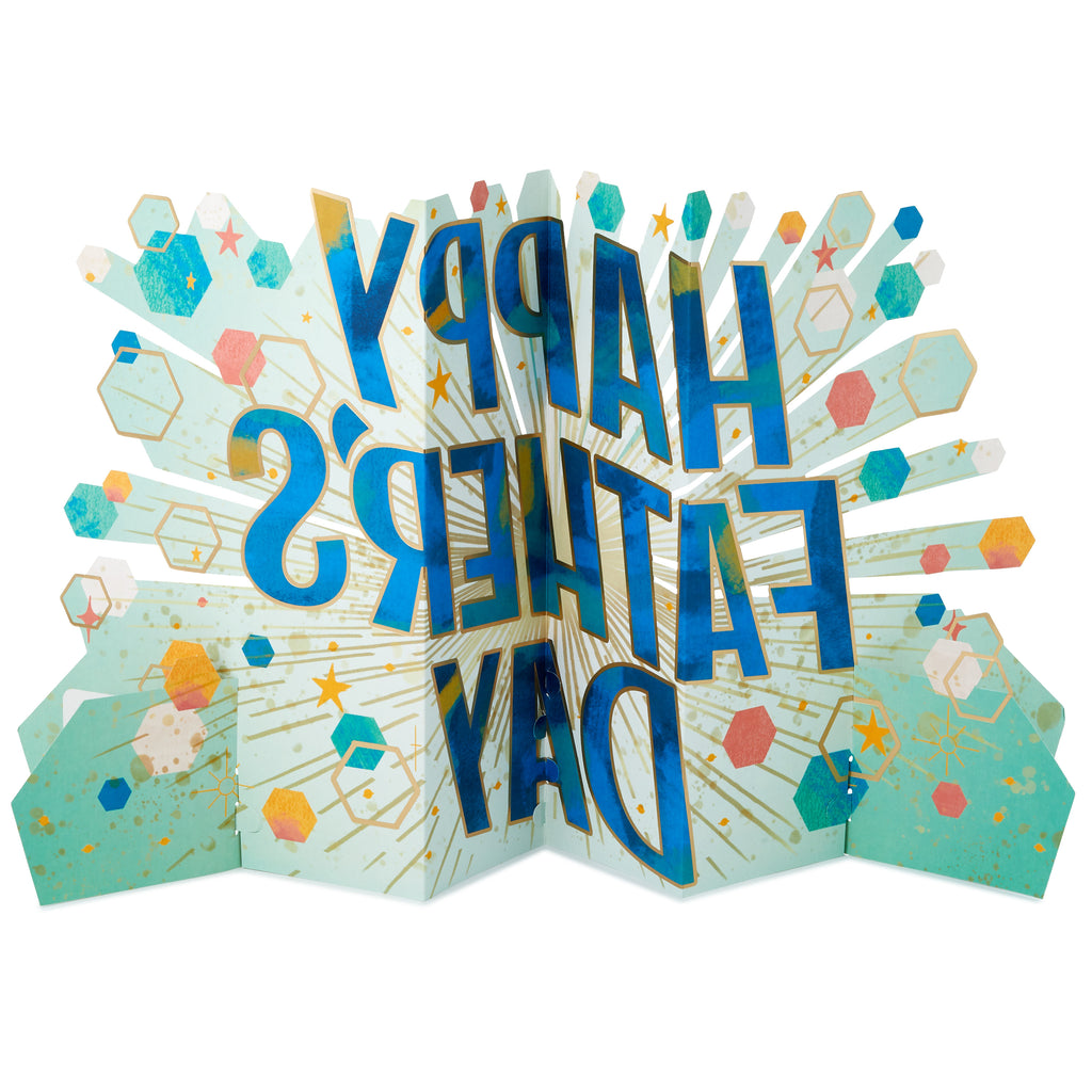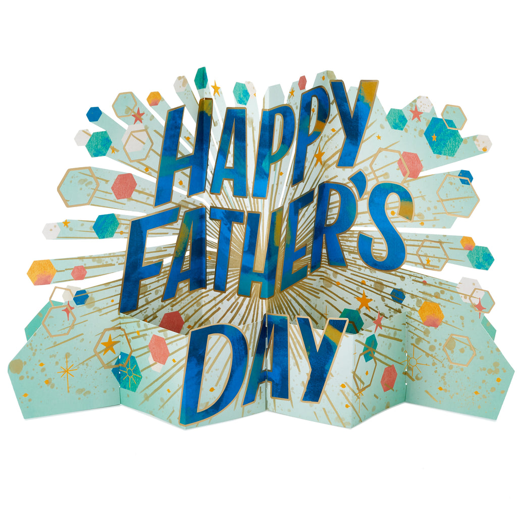Printed on high-quality board, this card pops-up into a 3D diorama of a Father's Day banner with hexagons, stars and specks. This card features a die-cut design and comes complete with a co-ordinating Hallmark branded, blue envelope.