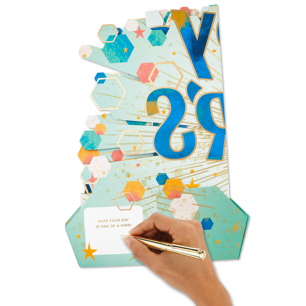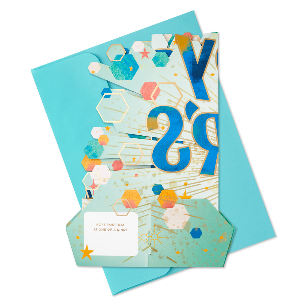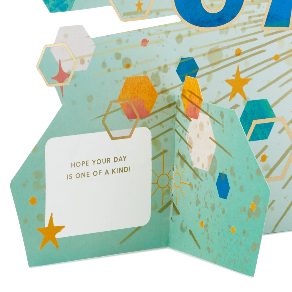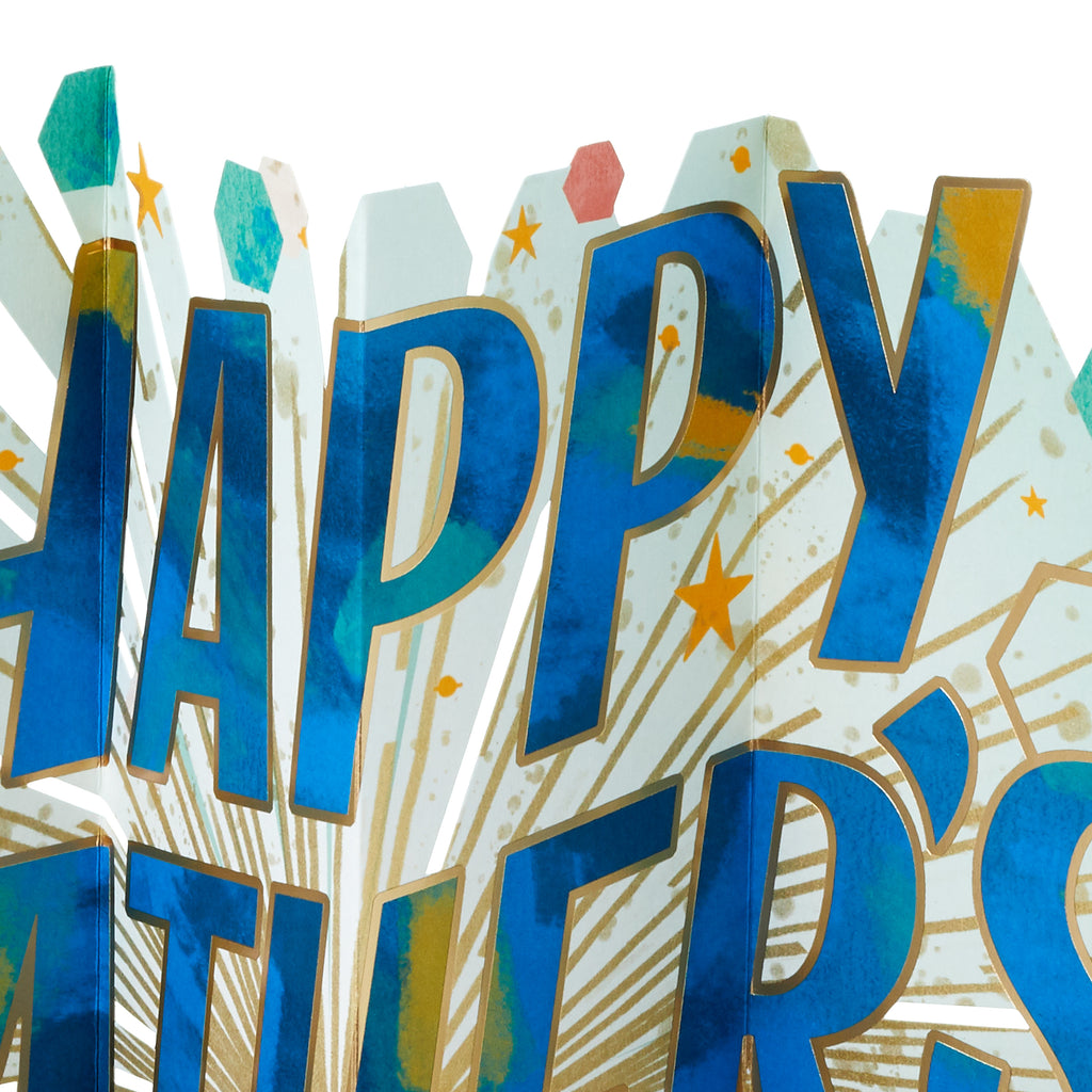 Printed on high-quality board, this card pops-up into a 3D diorama of a Father's Day banner with hexagons, stars and specks. This card features a die-cut design and comes complete with a co-ordinating Hallmark branded, blue envelope.