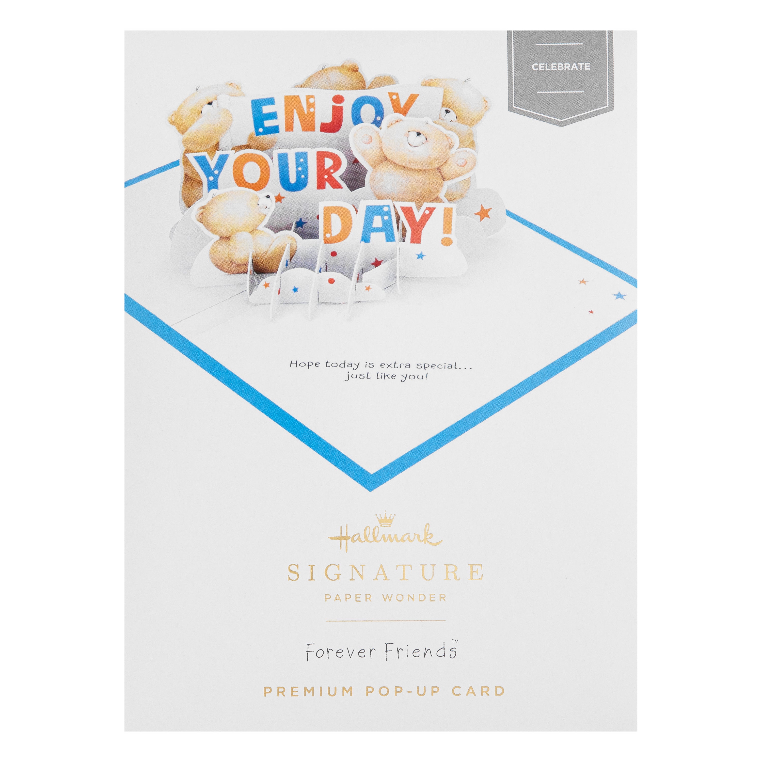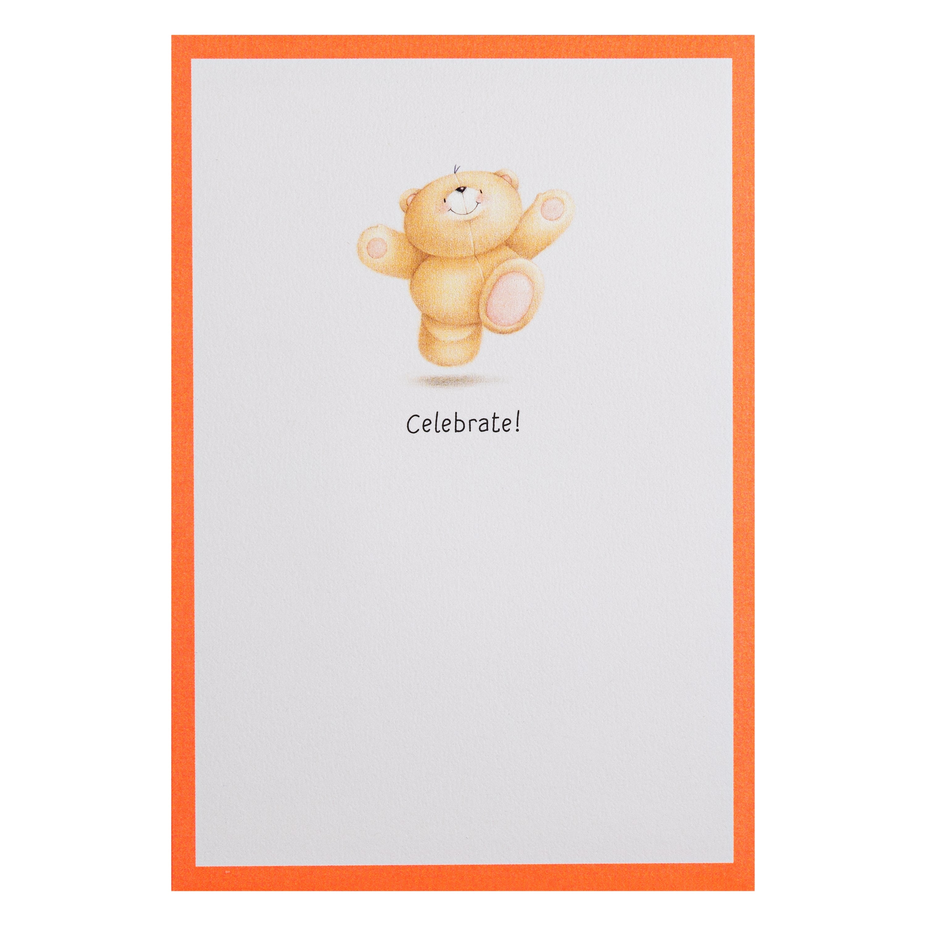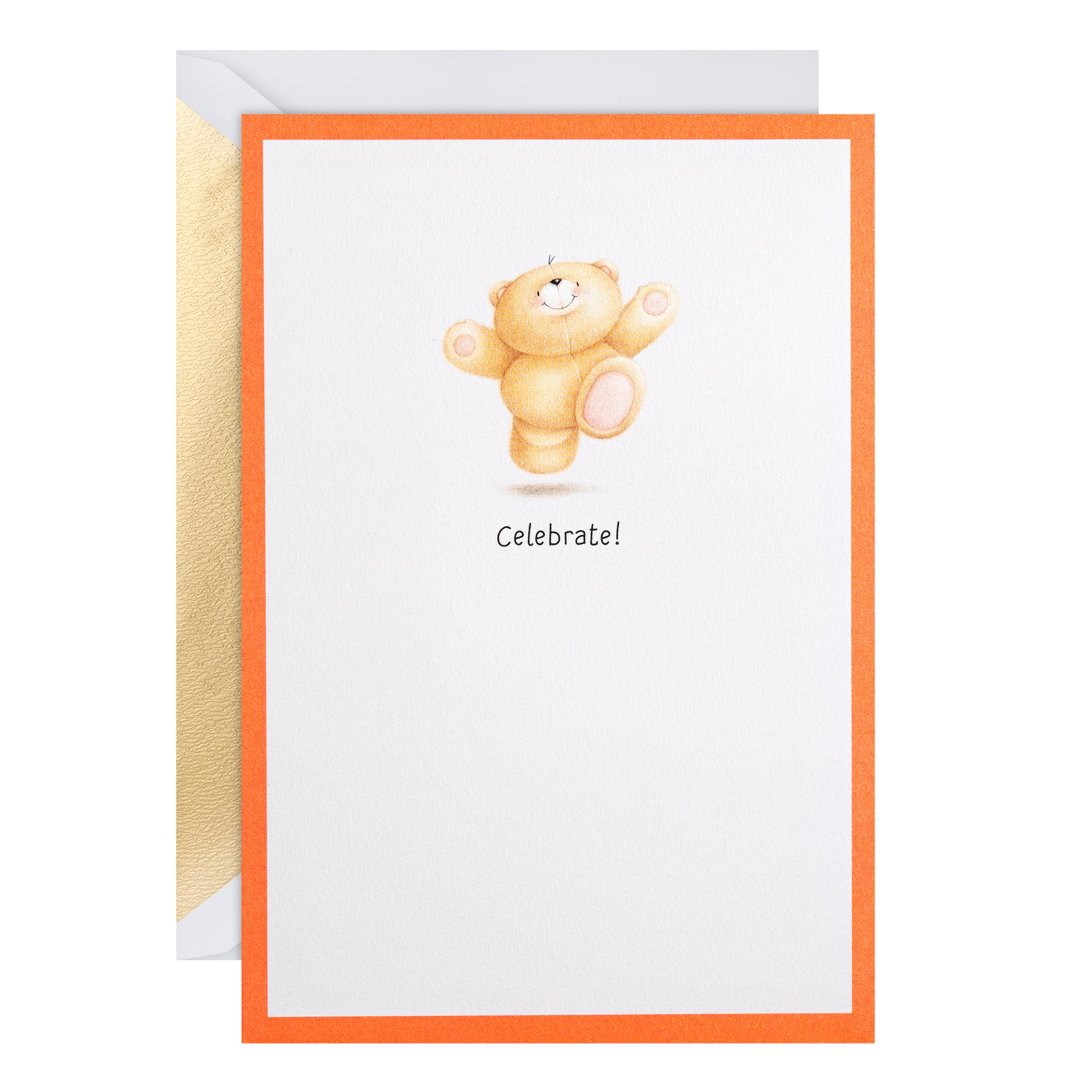 Printed on high-quality board, this card opens up to reveal a super-cute scene of the Forever Friends bears celebrating together. This card features the message 'Celebrate!' on the front and comes complete with a co-ordinating Hallmark branded, white envelope with gold foil lining.