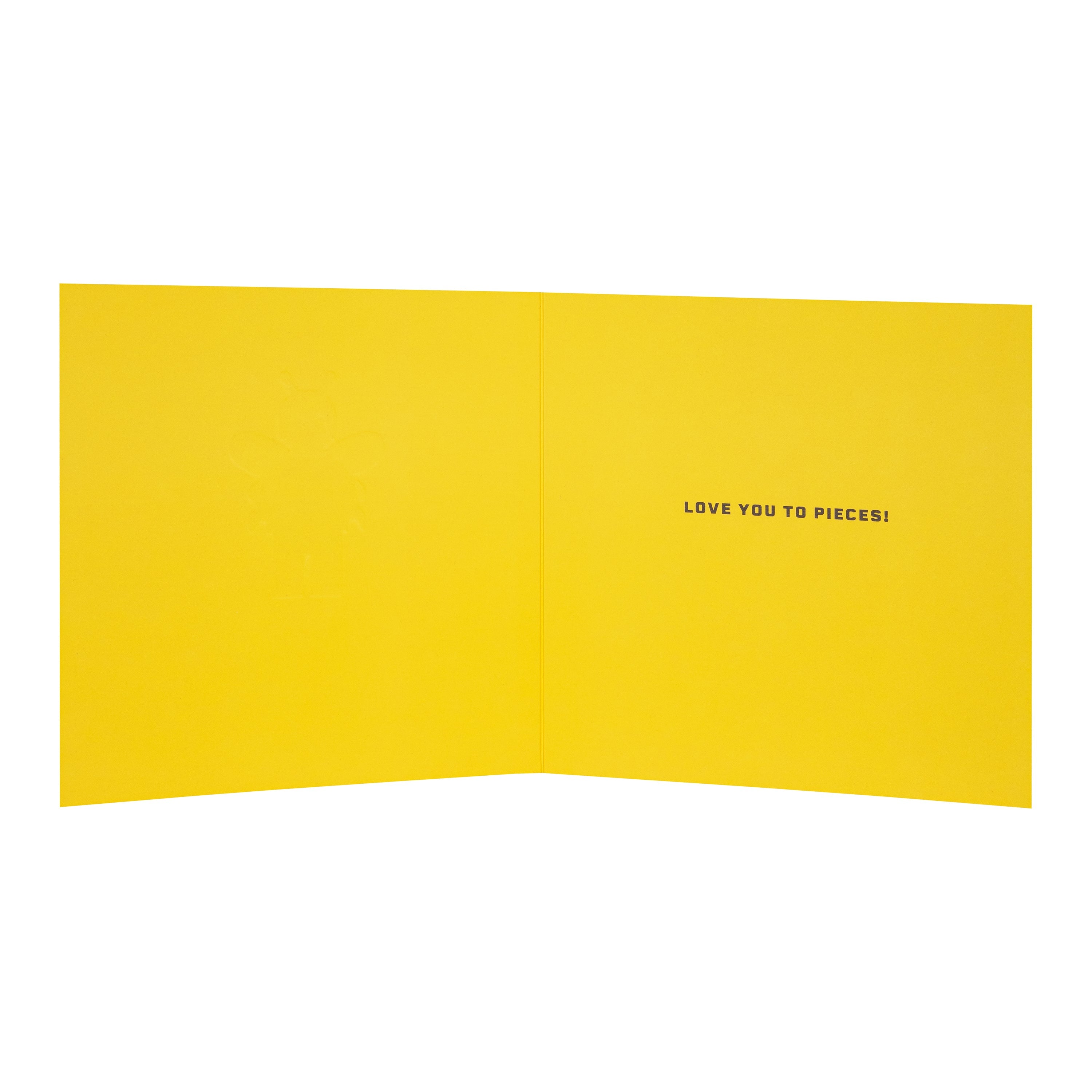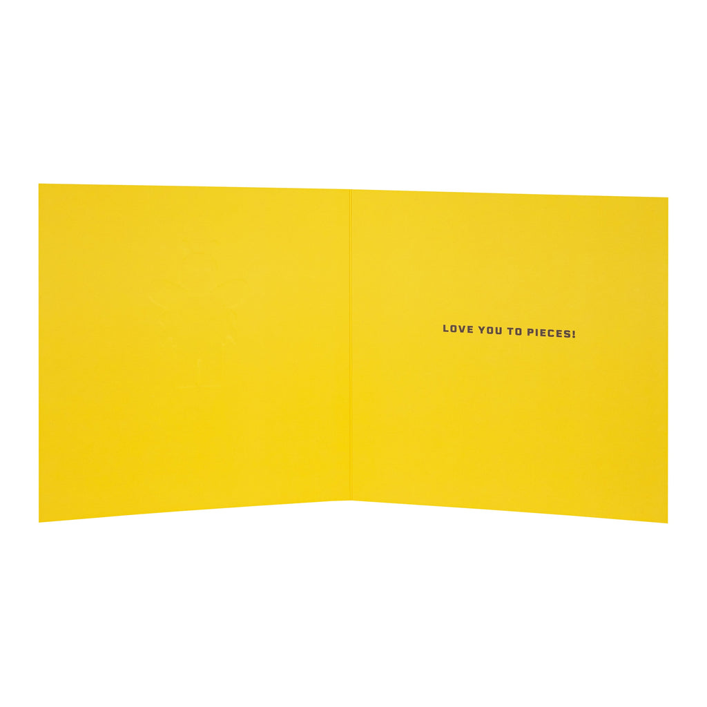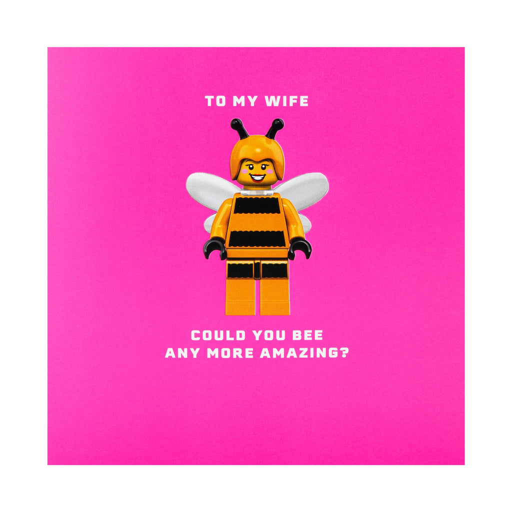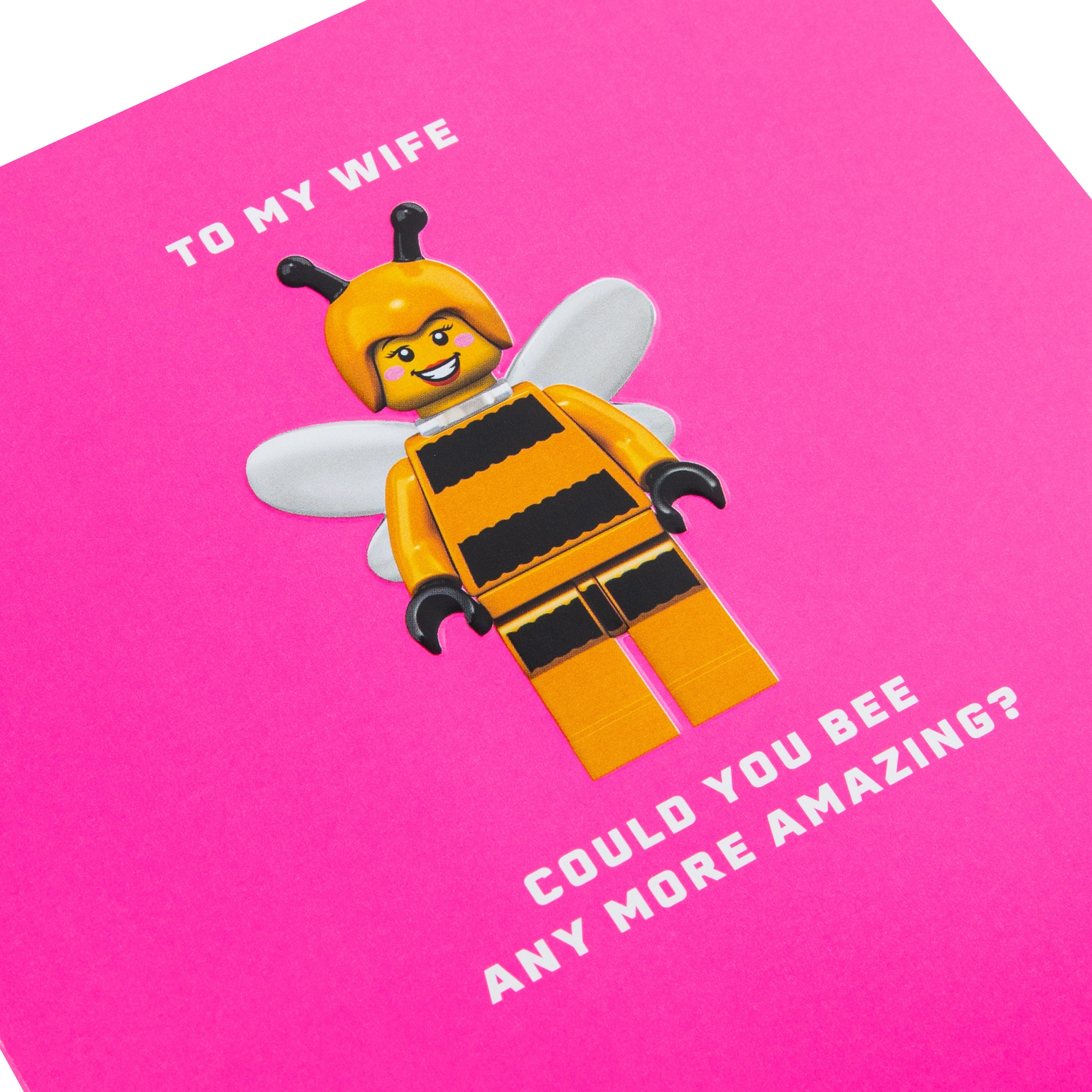 Printed on high-quality board, this greeting card includes a LEGO character, Bee lady on a pink background. This card features neon pink ink, embossed elements, the message 'To my wife, could you bee any more amazing?' on the front, and comes complete with a co-ordinating Hallmark branded, yellow envelope.