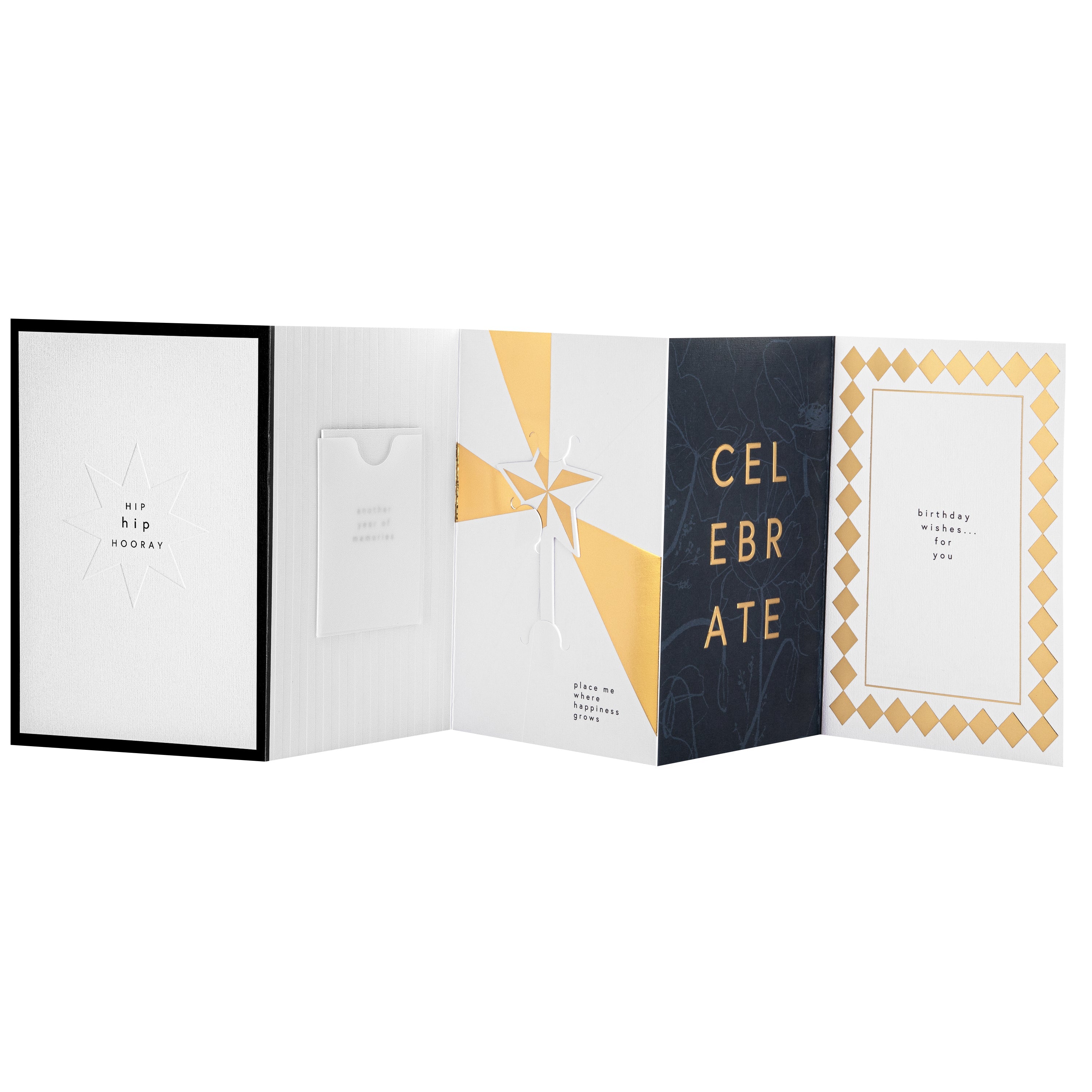 Printed on high-quality board, this card features embossed elements, a fold-out design, gold foil details and comes complete with a co-ordinating Hall & Co branded, green premium envelope with black and white stripes inside.