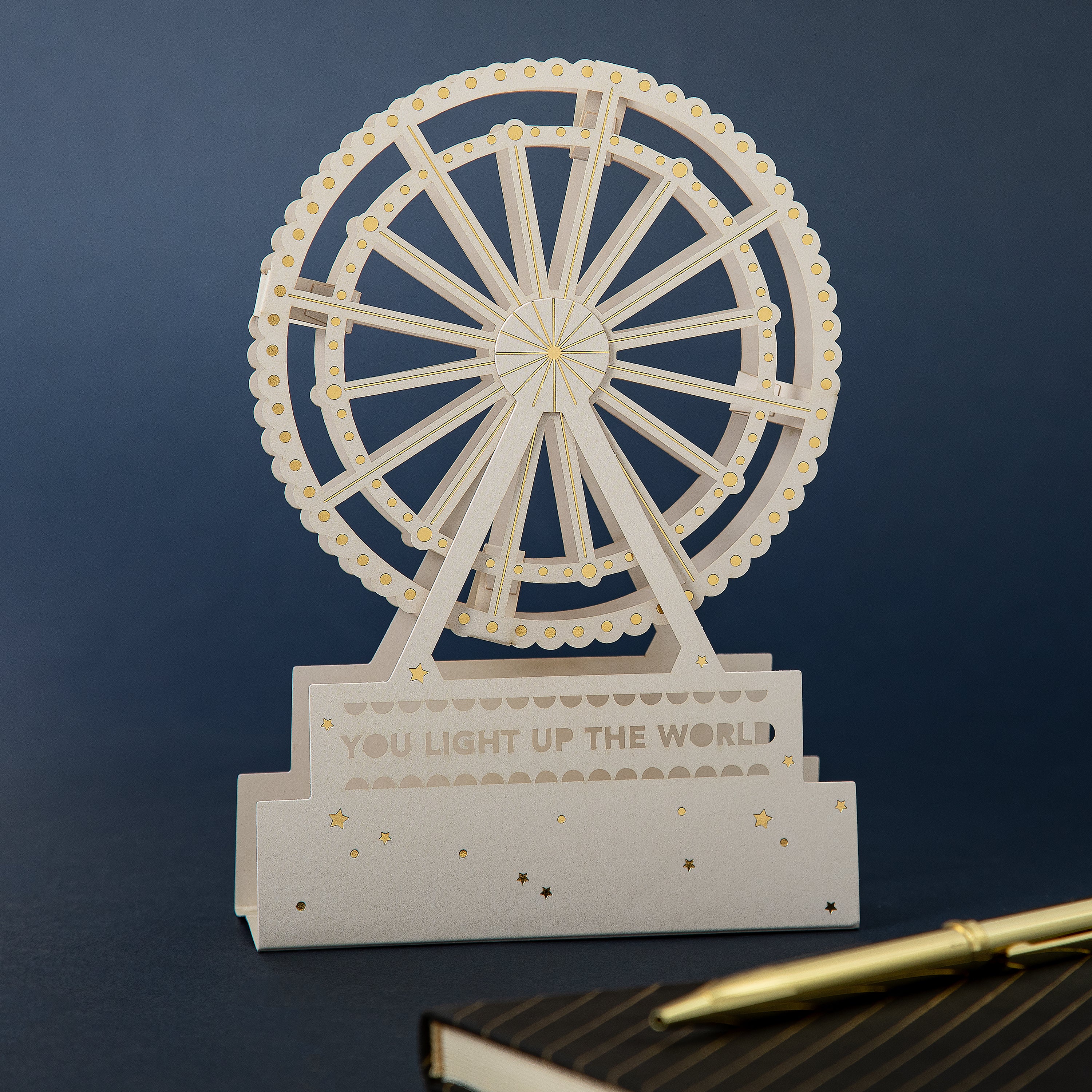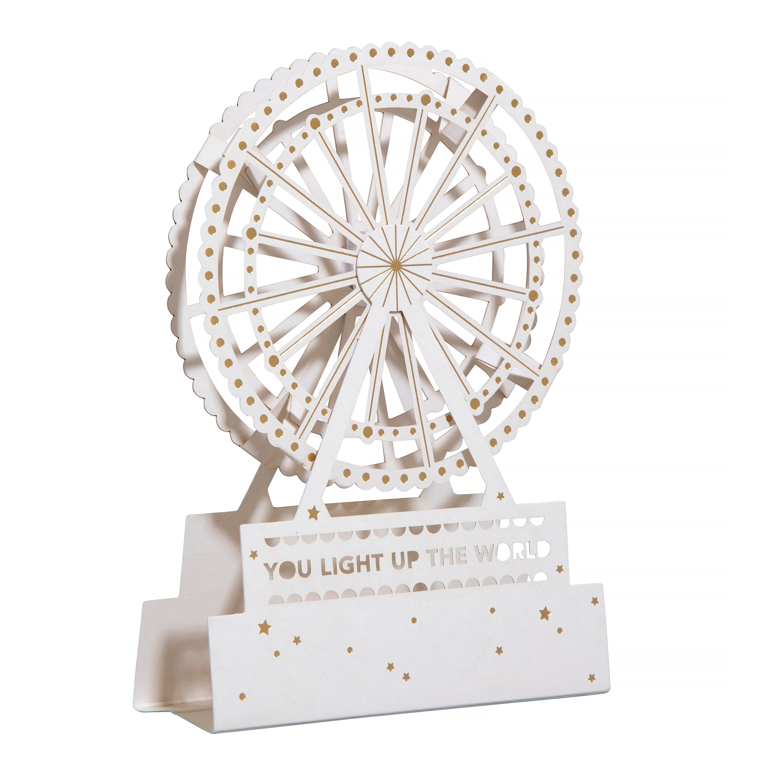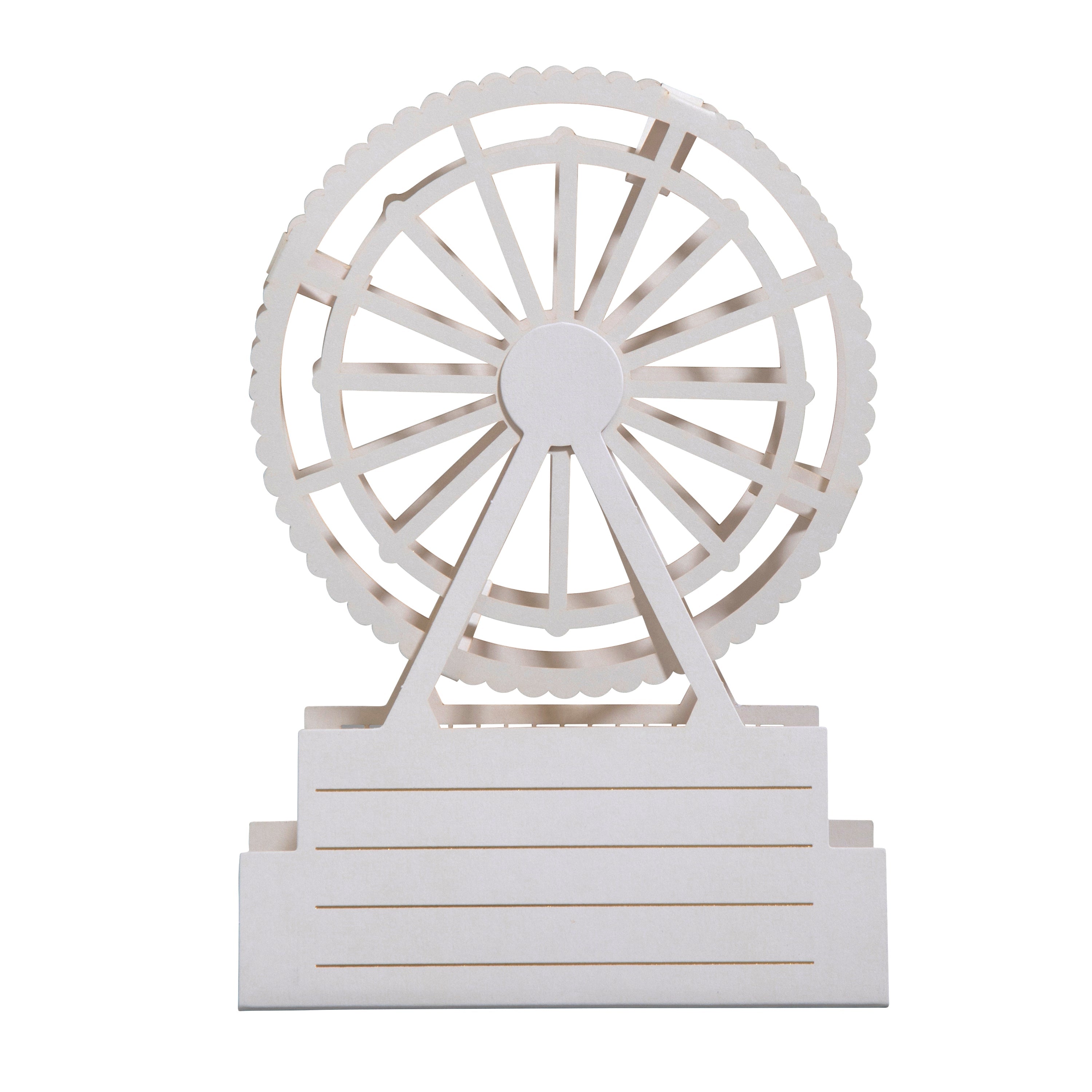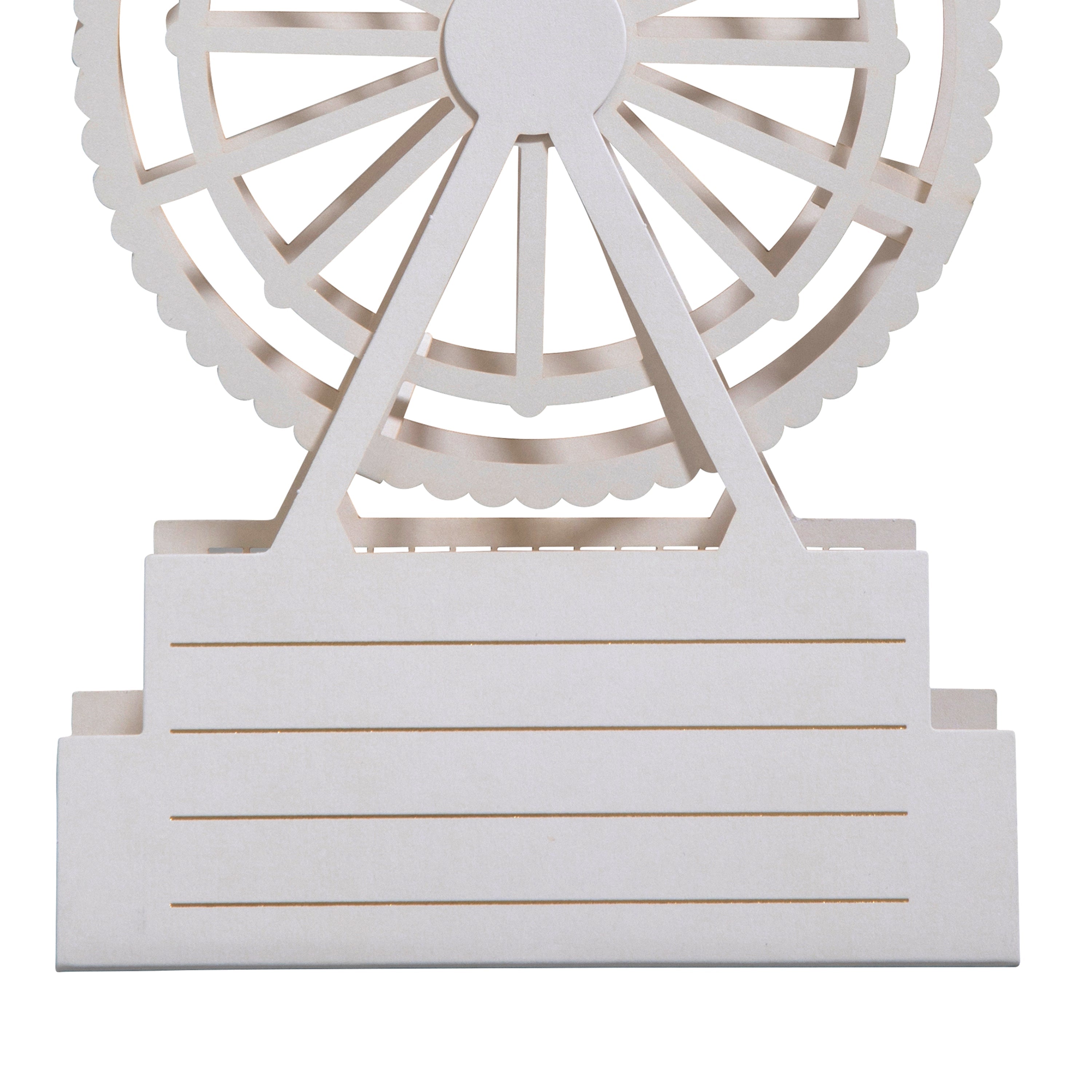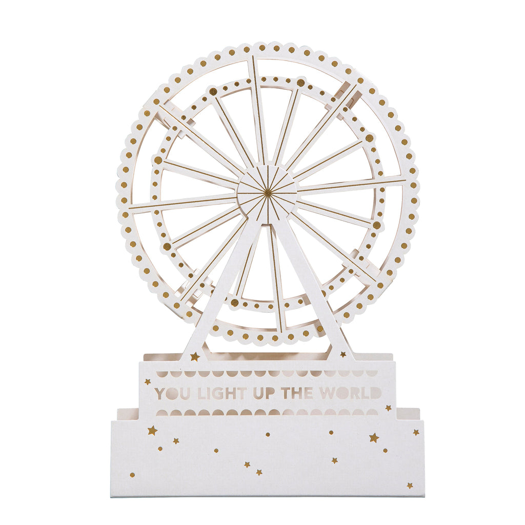 Printed on high-quality board, this card pops-up into a 3D Keepsake of a Ferris Wheel. This card features gold foil details, laser cut design and the Big Wheel can be rotated and spun. The packaging converts to a gift box for your card, no envelope required!
