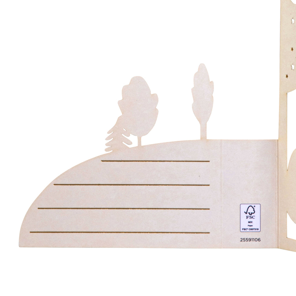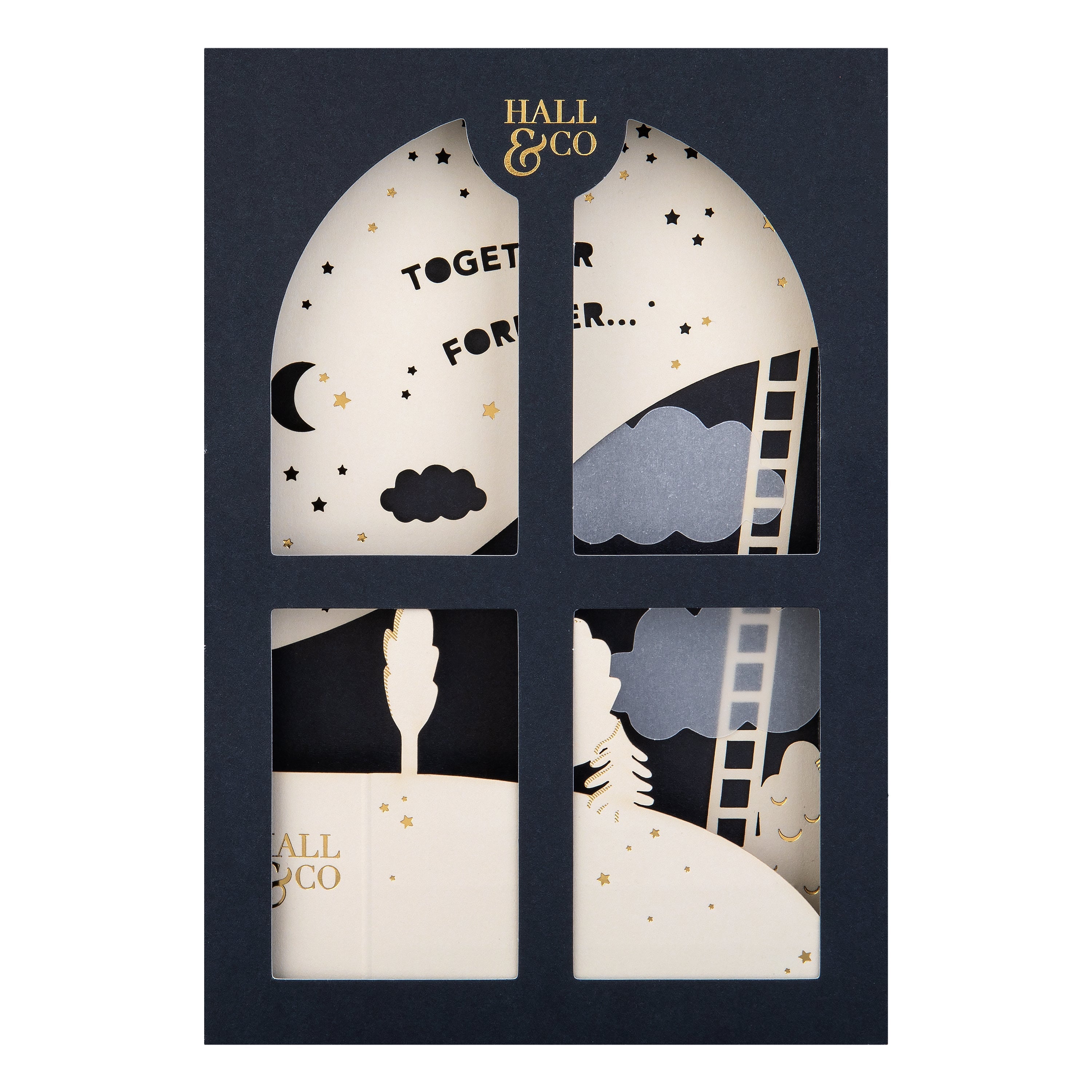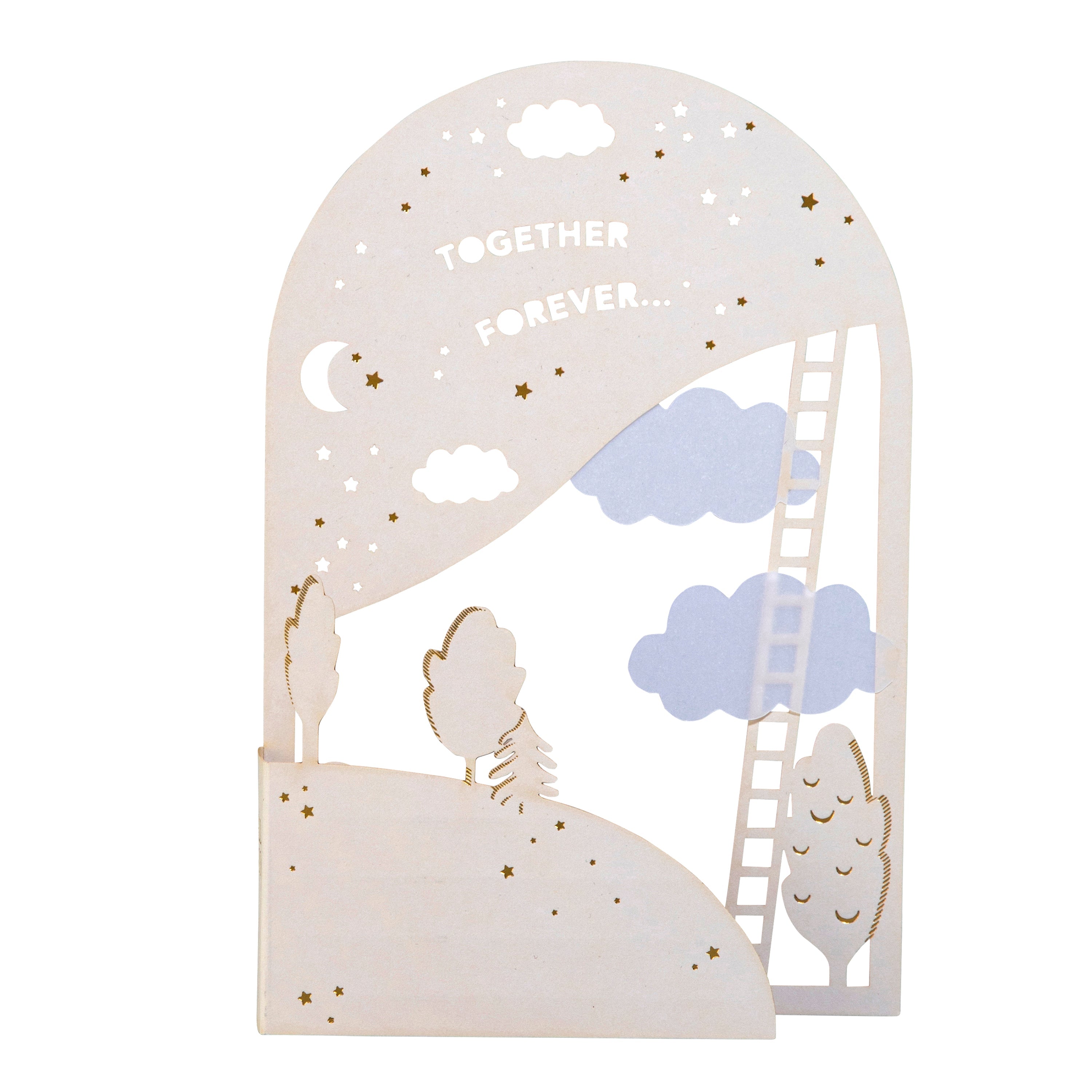 Printed on high-quality board, this card pops-up into a 3D Keepsake featuring a scene with trees, stars, the moon, a ladder and translucent paper clouds. This card features gold foil details and laser cut design. The packaging converts to a gift box for your card, no envelope required!