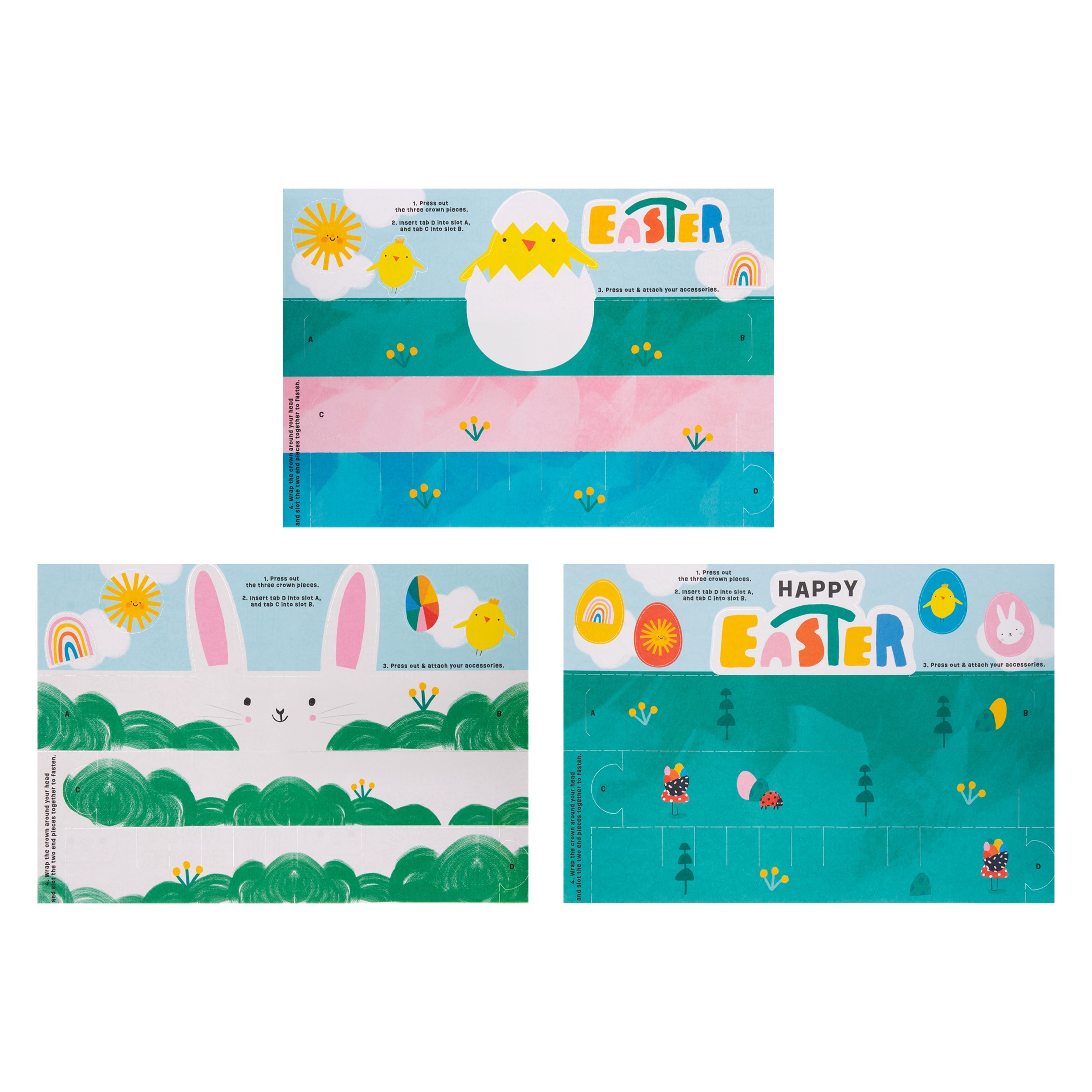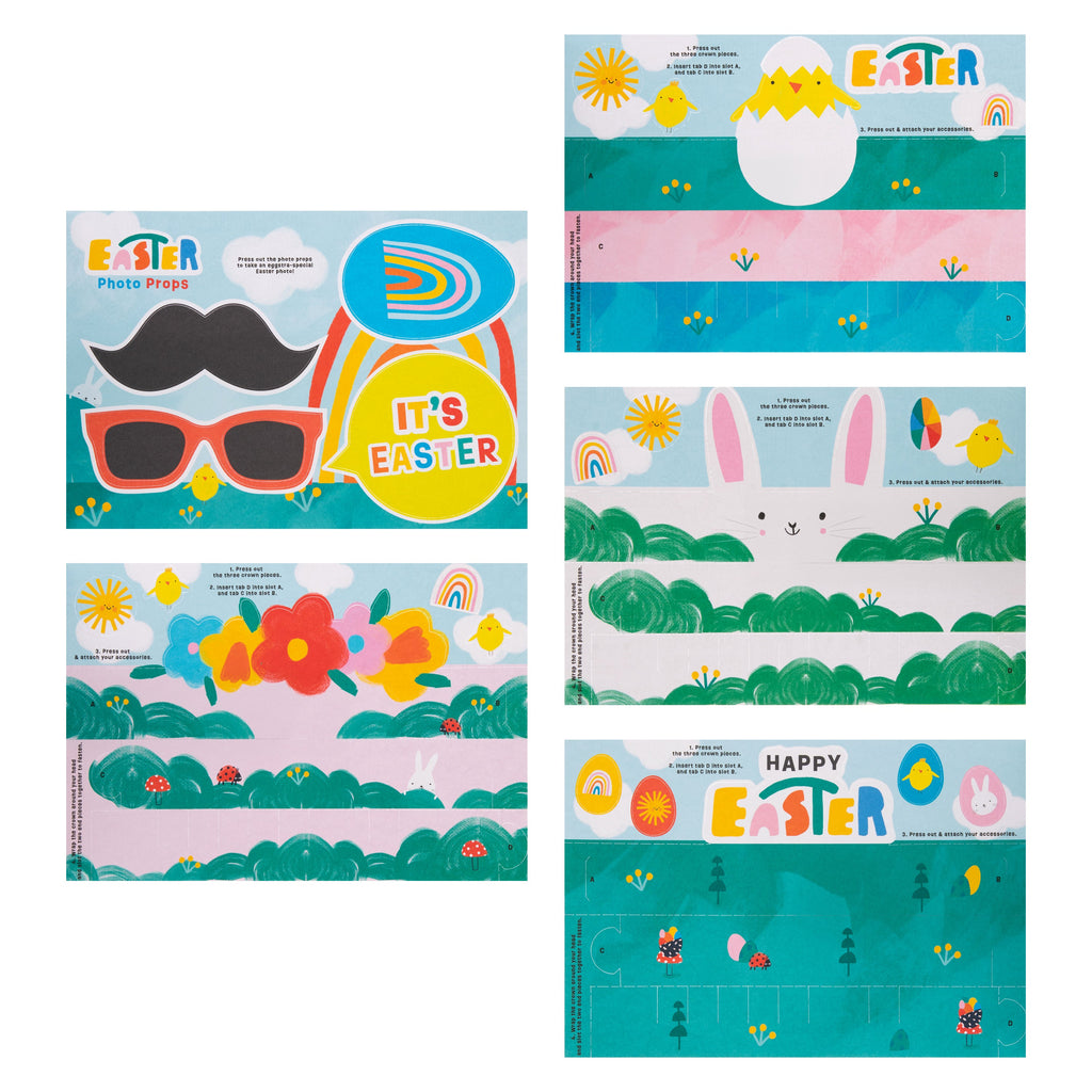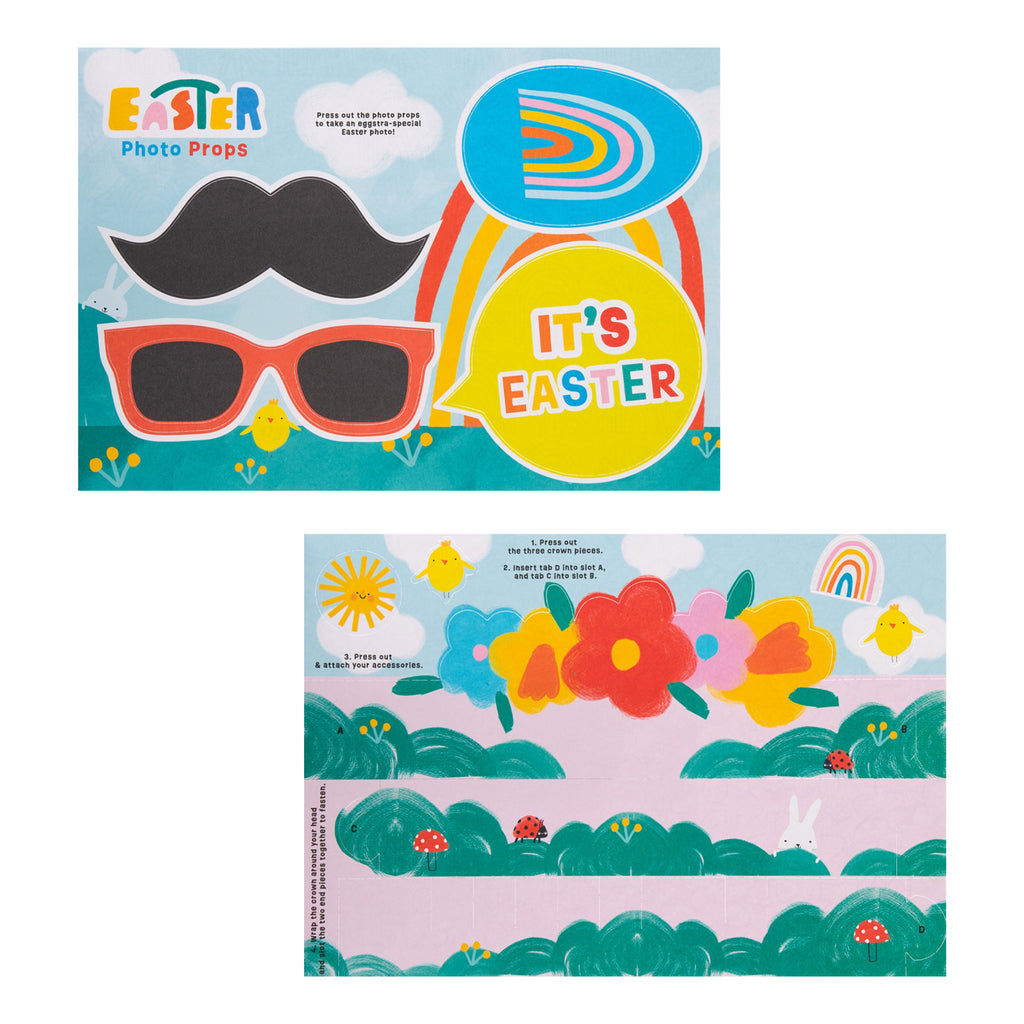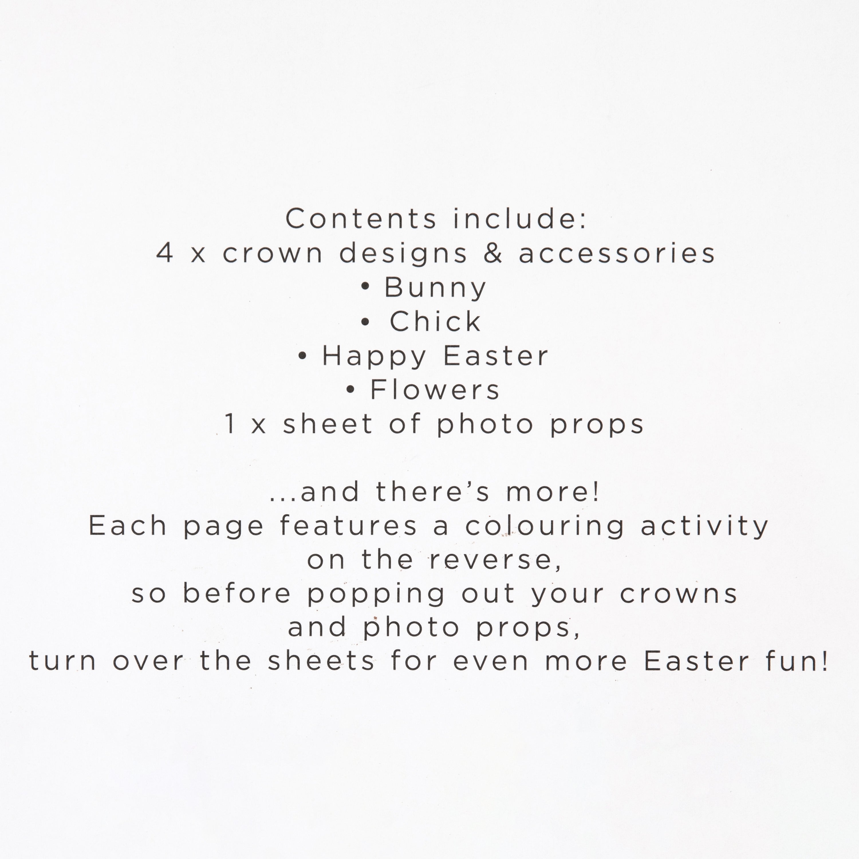 This Make Your Own Crown Activity Pack includes, 4 sheets of crown designs in 4 designs including, bunny, chick, Happy Easter and flowers, and 1 sheet of photo props. Each page features a colouring activity on the reverse, so before popping out your crowns and photo props, turn over the sheets for even more Easter fun!