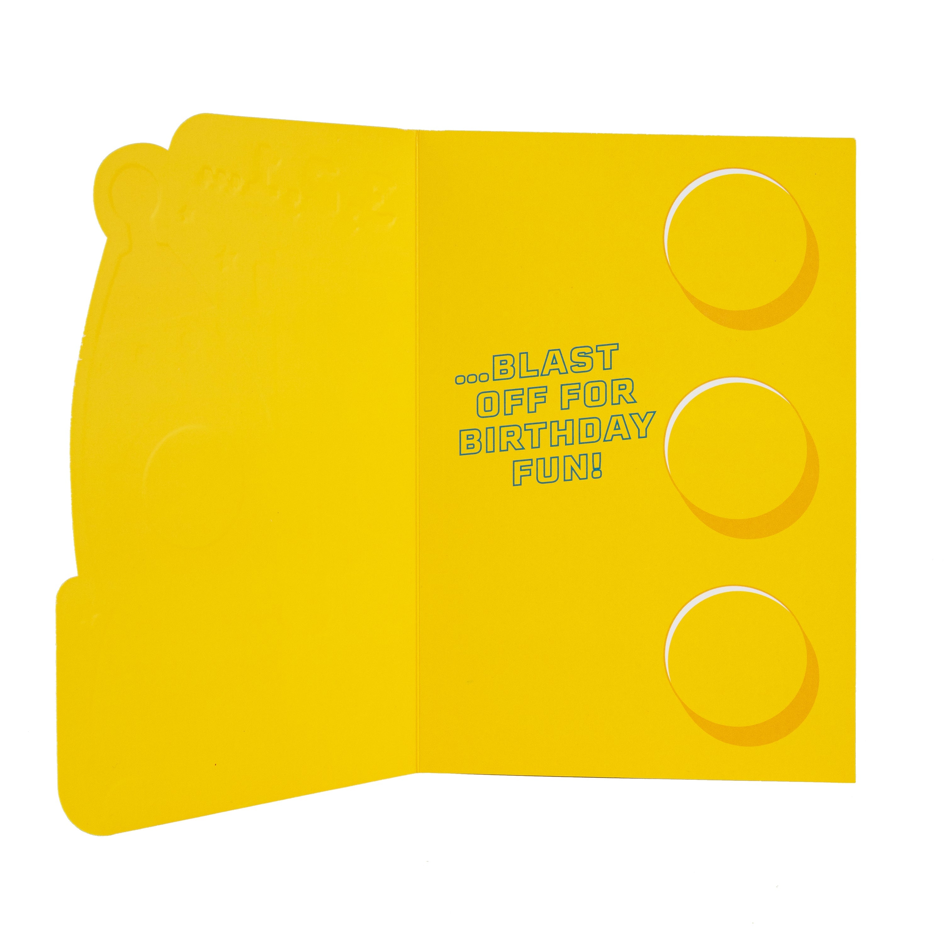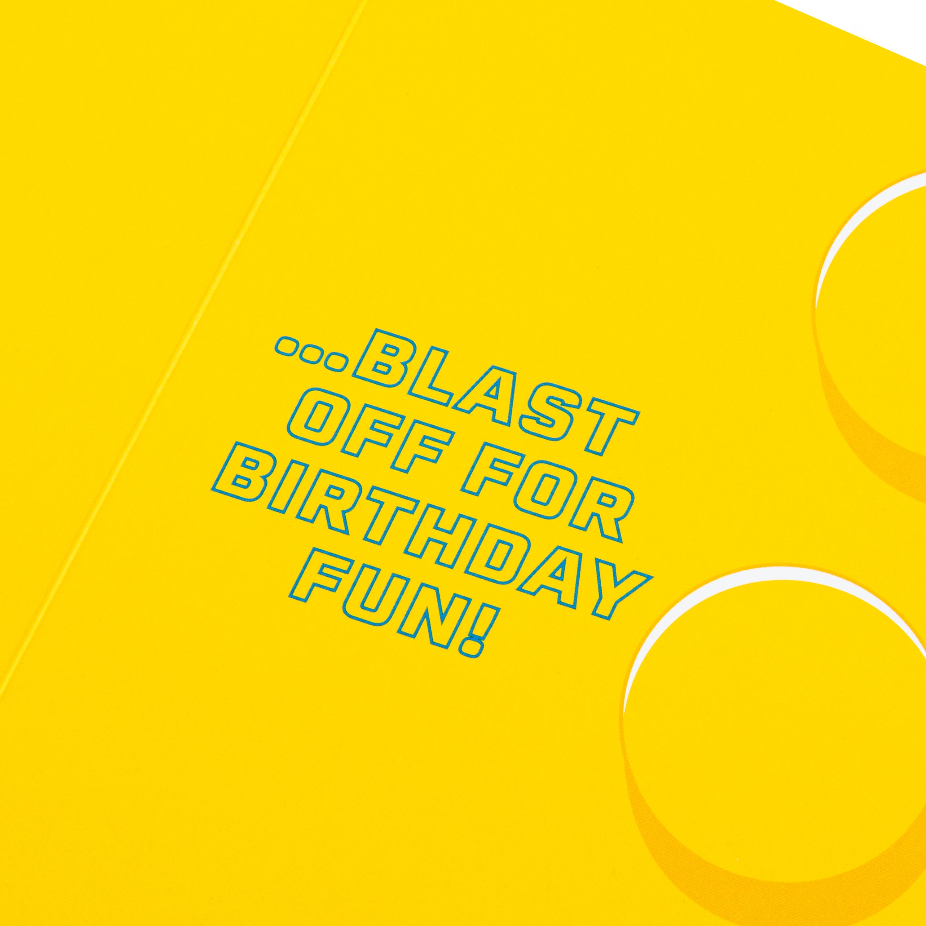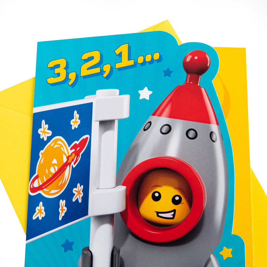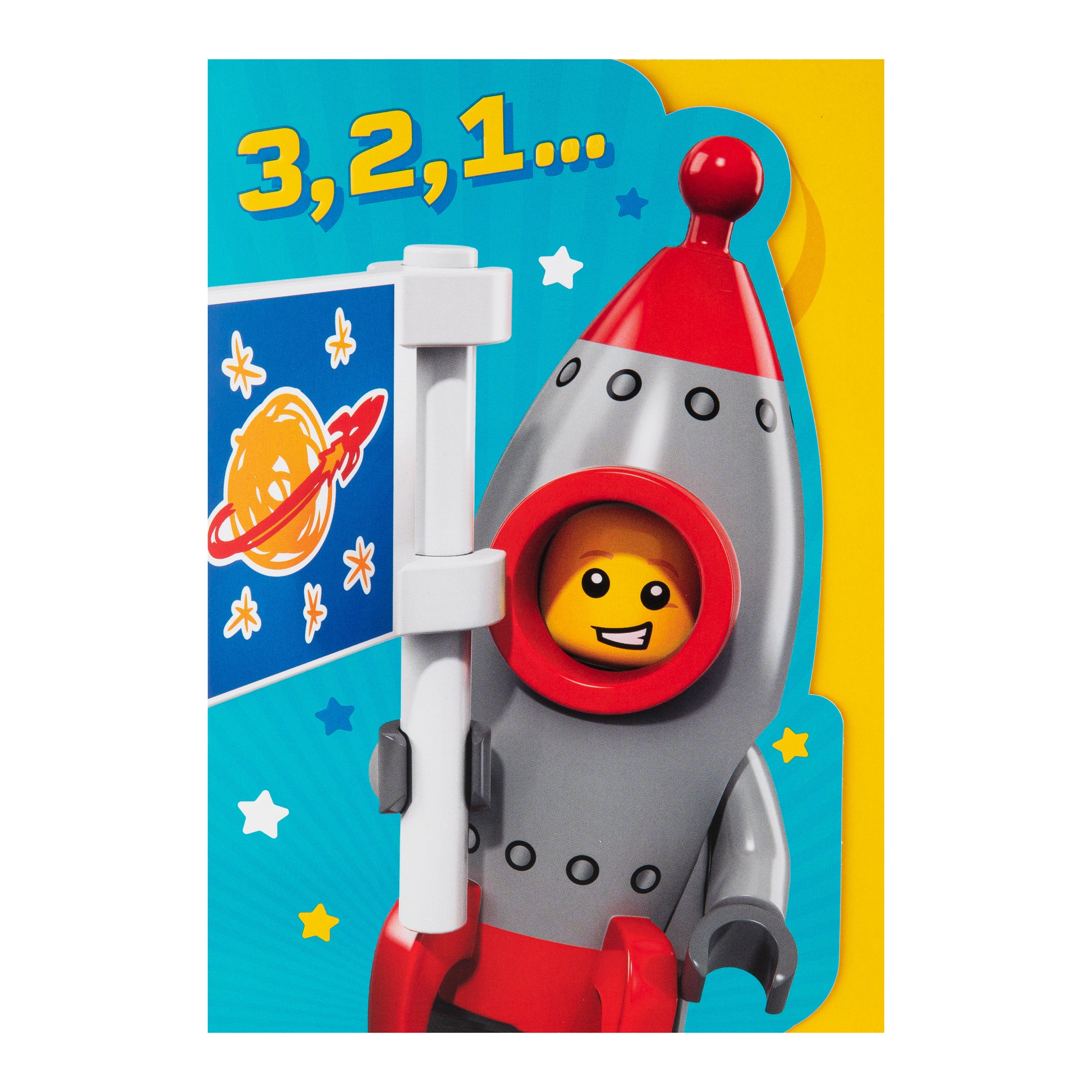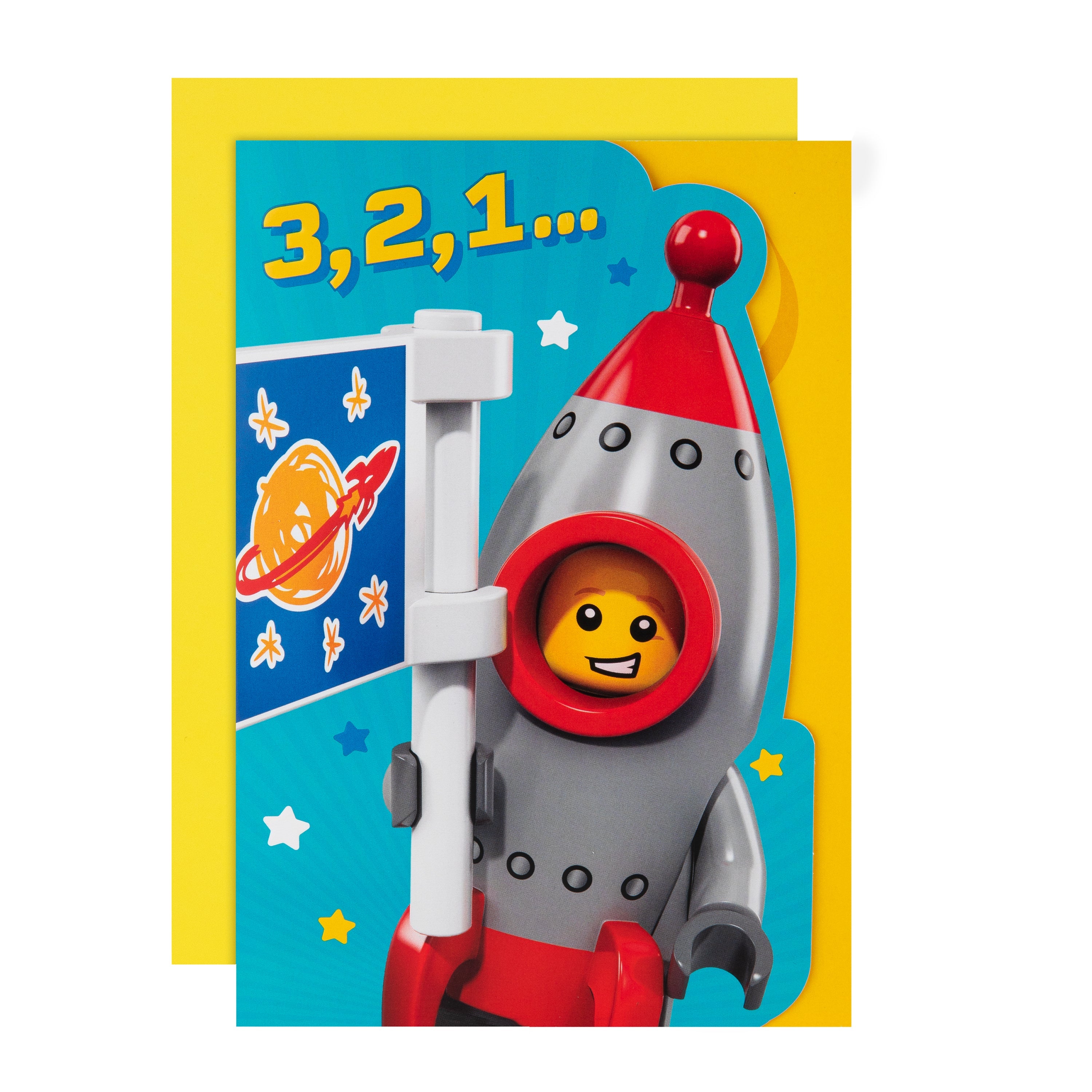 Printed on high-quality board, this birthday card includes a LEGO character, Rocket man with a space flag on a blue background. This card features die-cut details, embossed elements, the message '3, 2, 1…' on the front, and comes complete with a co-ordinating Hallmark branded, yellow envelope.