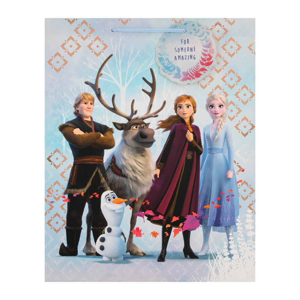This bag features silver foil details, a gift tag with text 'For someone amazing', blue handles and Frozen 2 characters Elsa, Anna, Kristoff and Sven the reindeer.