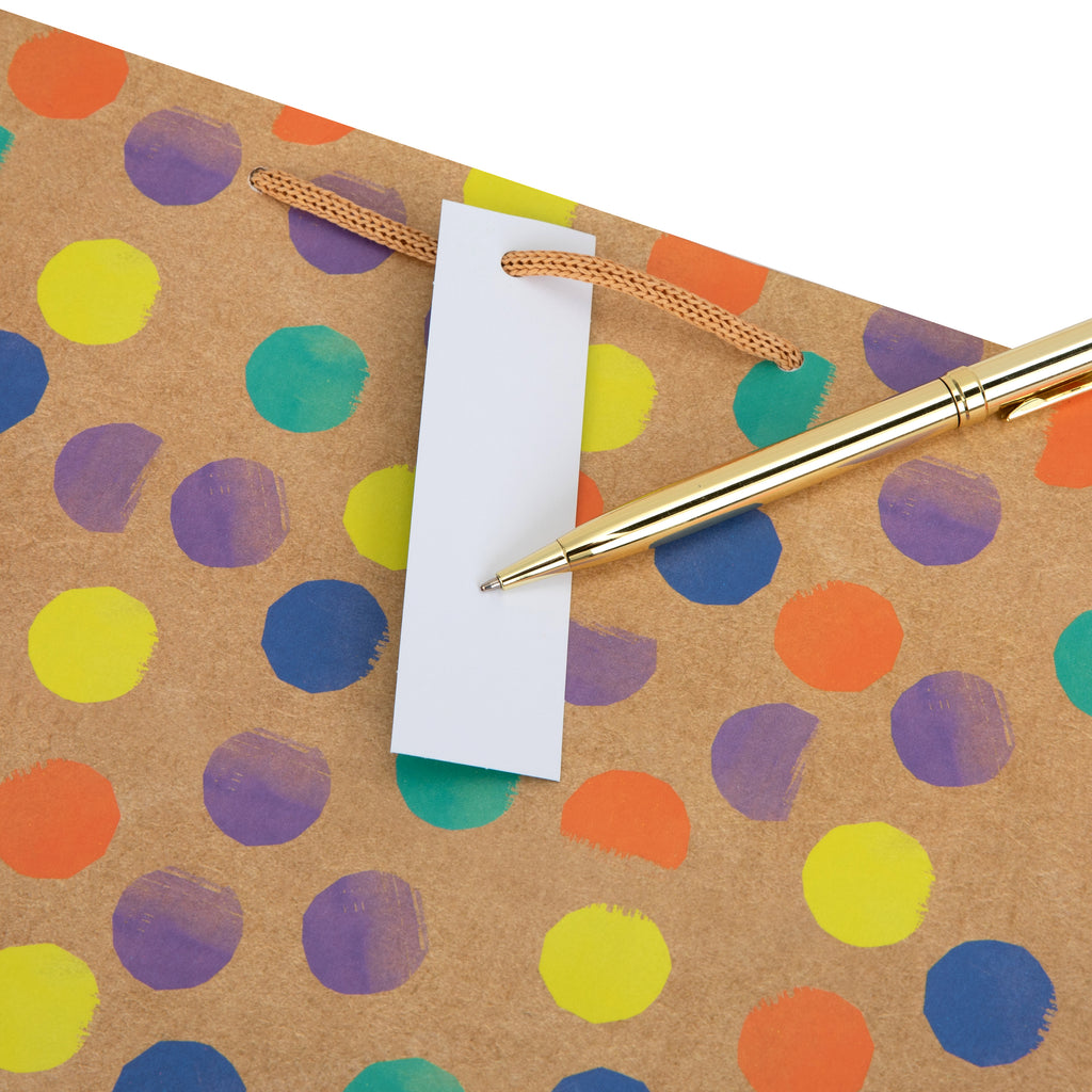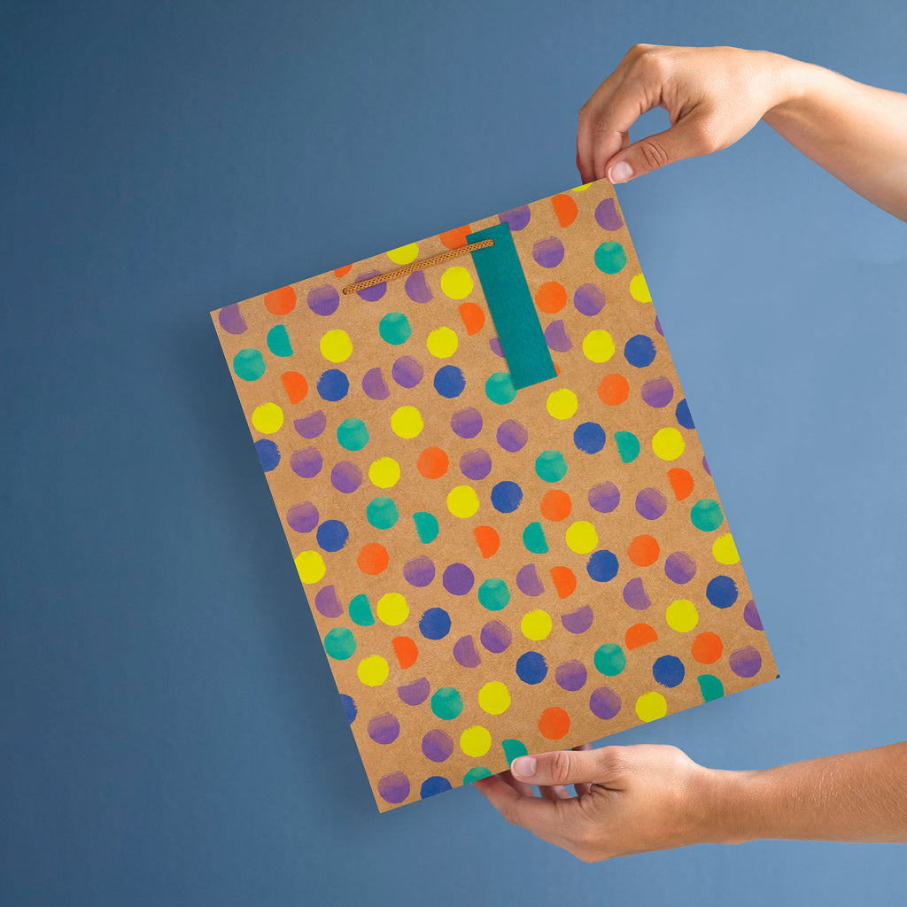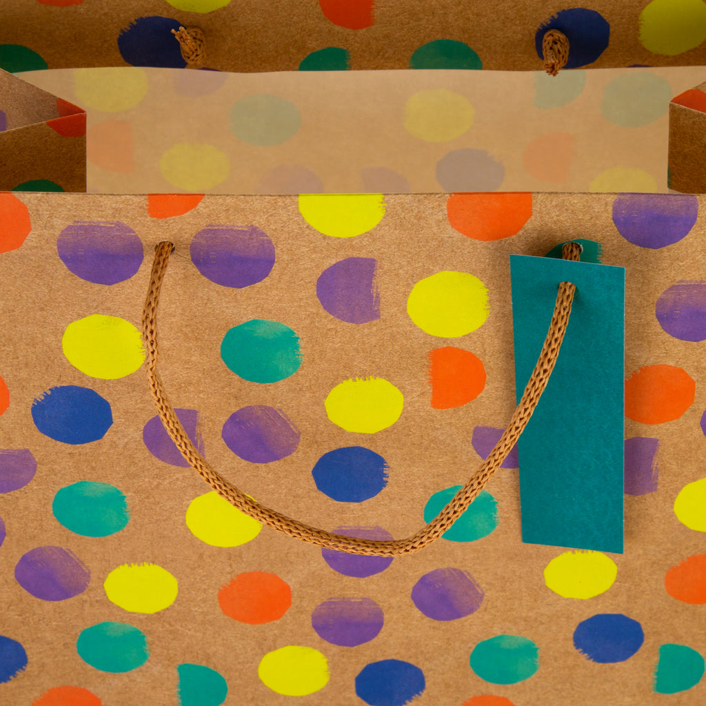 The pack contains 4 large bags in 1 colourful polka dots design with brown knitted paper handles. Each bag comes complete with a co-ordinating green rectangular gift tag.