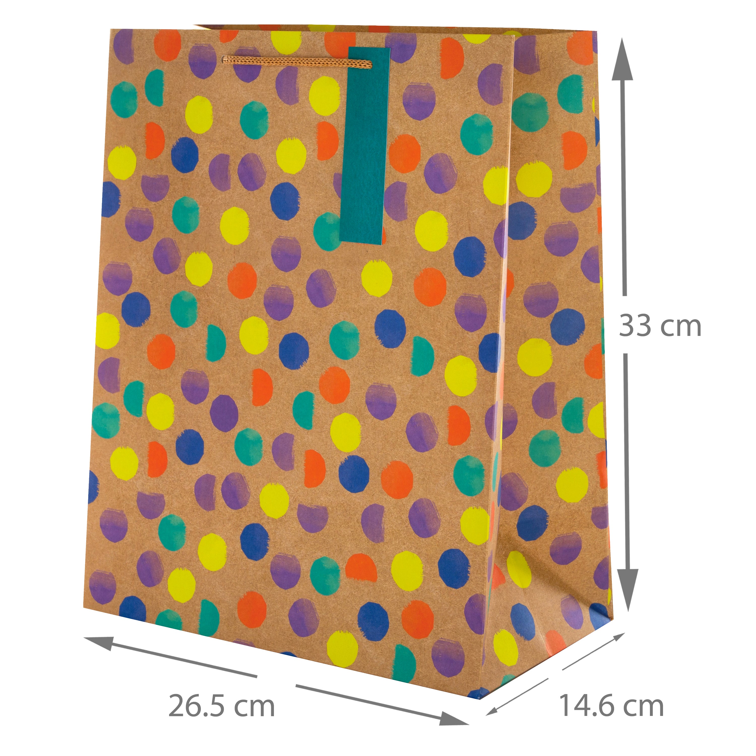 The pack contains 4 large bags in 1 colourful polka dots design with brown knitted paper handles. Each bag comes complete with a co-ordinating green rectangular gift tag.